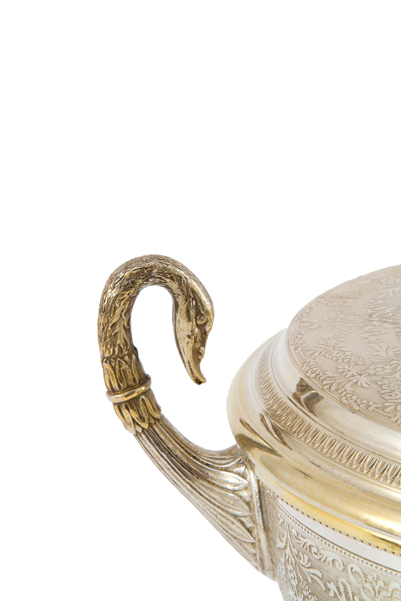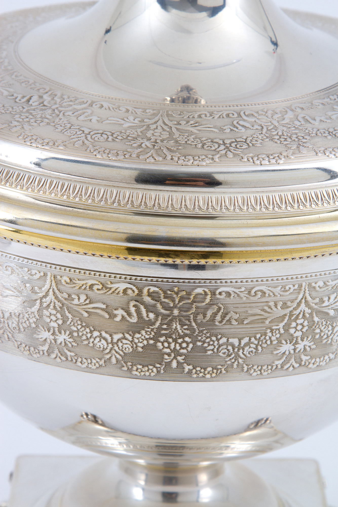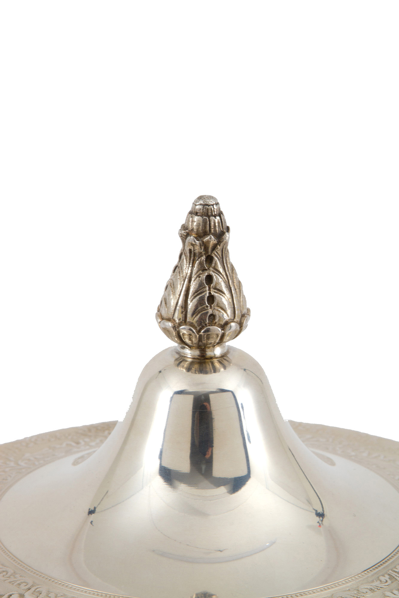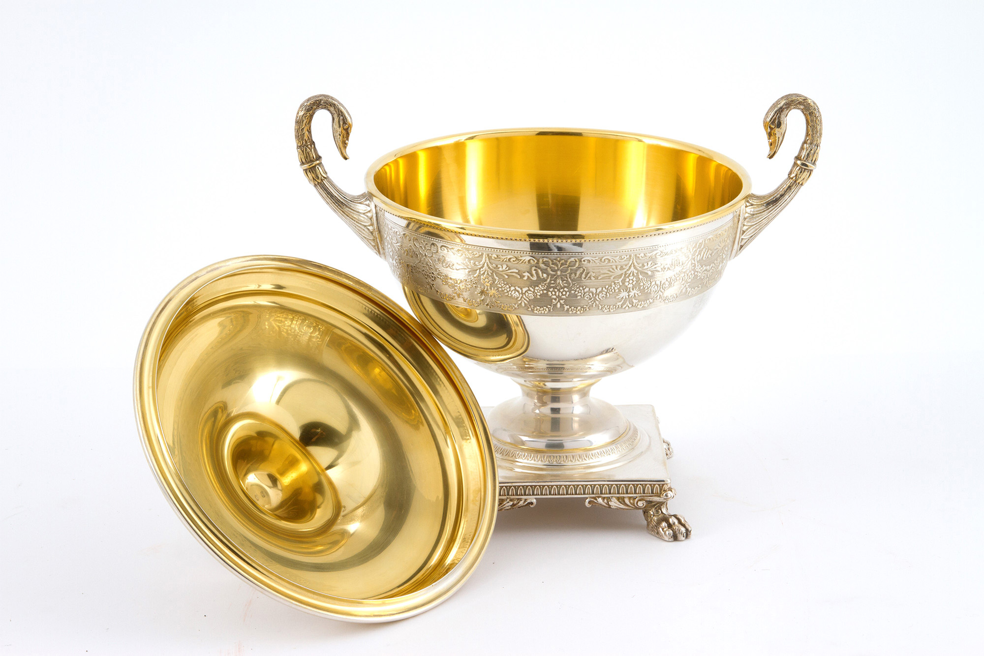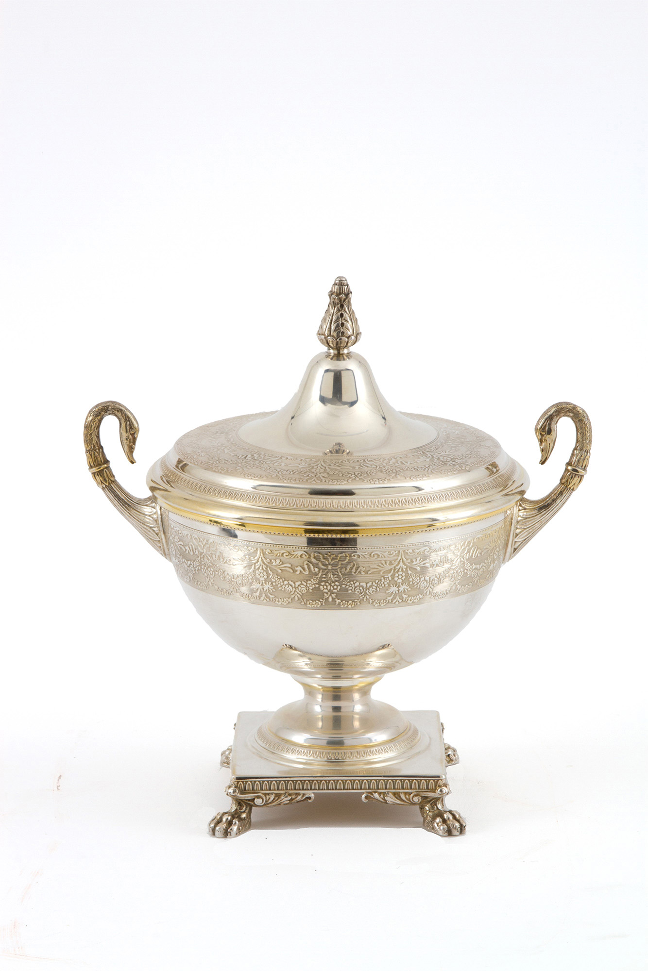 Tureen in 800 silver finely chiselled and gilded inside, gr. 1640 ca. overall. Silversmith VENTRELLA, Rome. 30x27x20 cm approx. Zuppiera in argento 800 finemente cesellato e dorata all'interno, gr. 1640 ca. complessivi. Argentiere VENTRELLA, Roma. 30x27x20 cm ca.