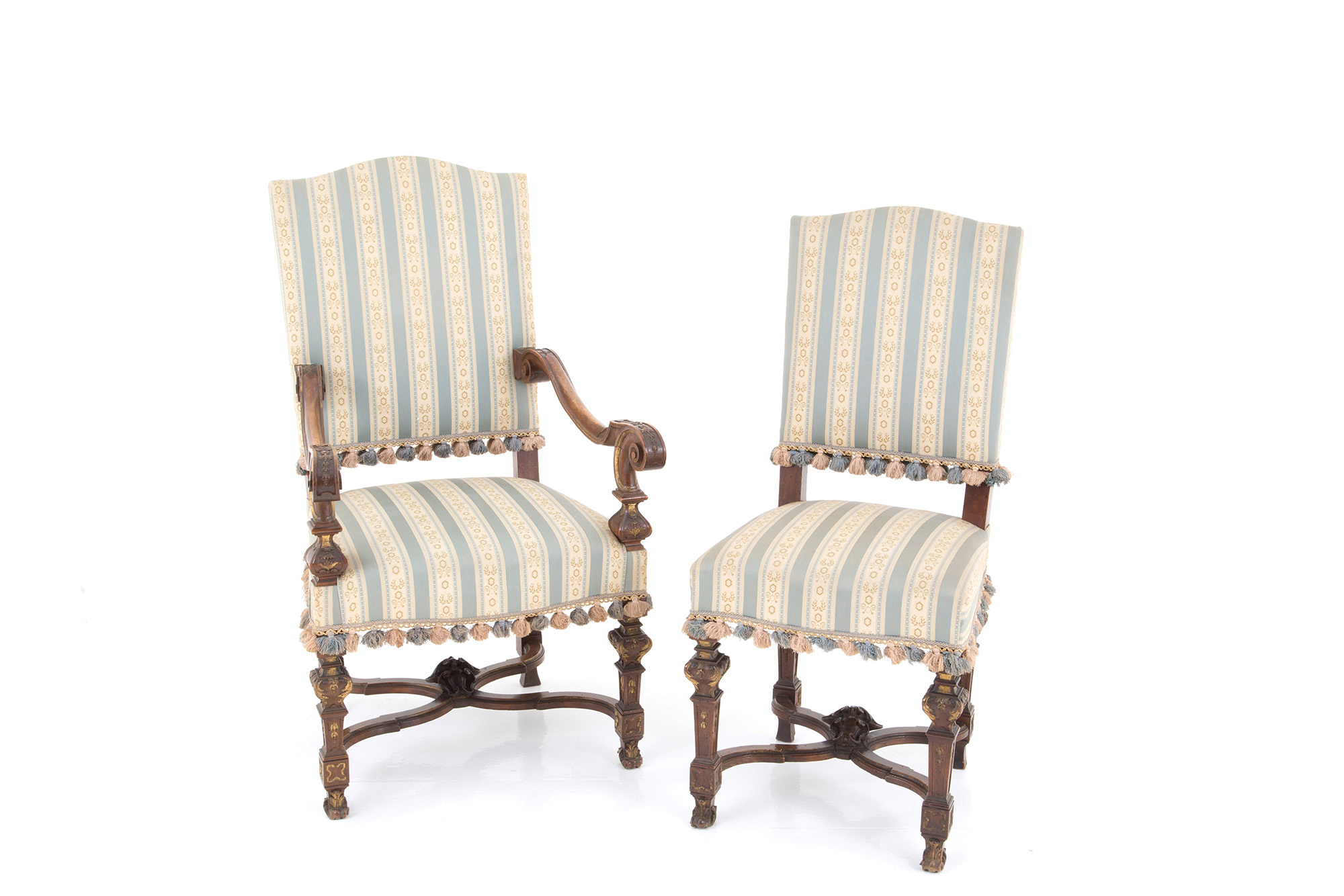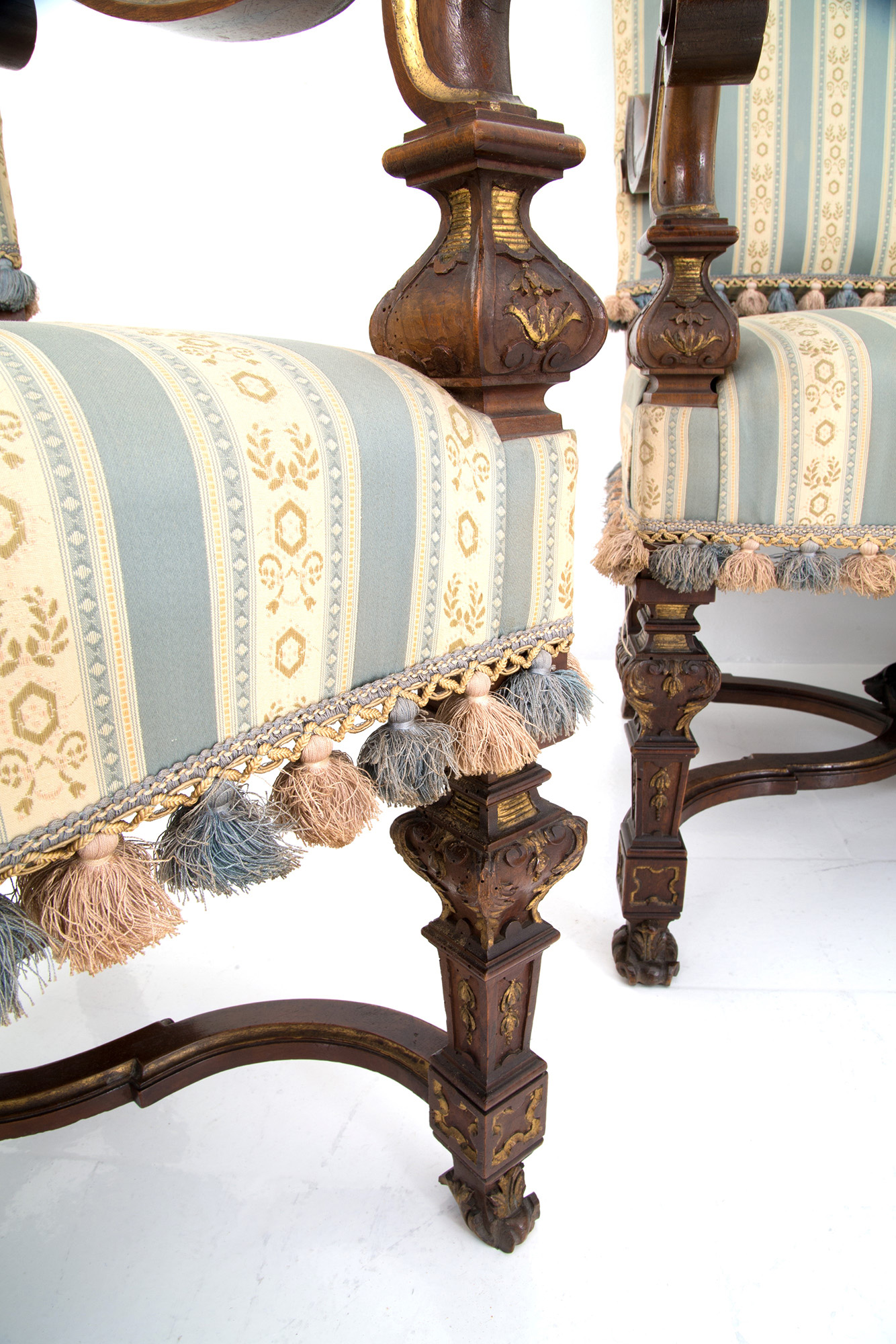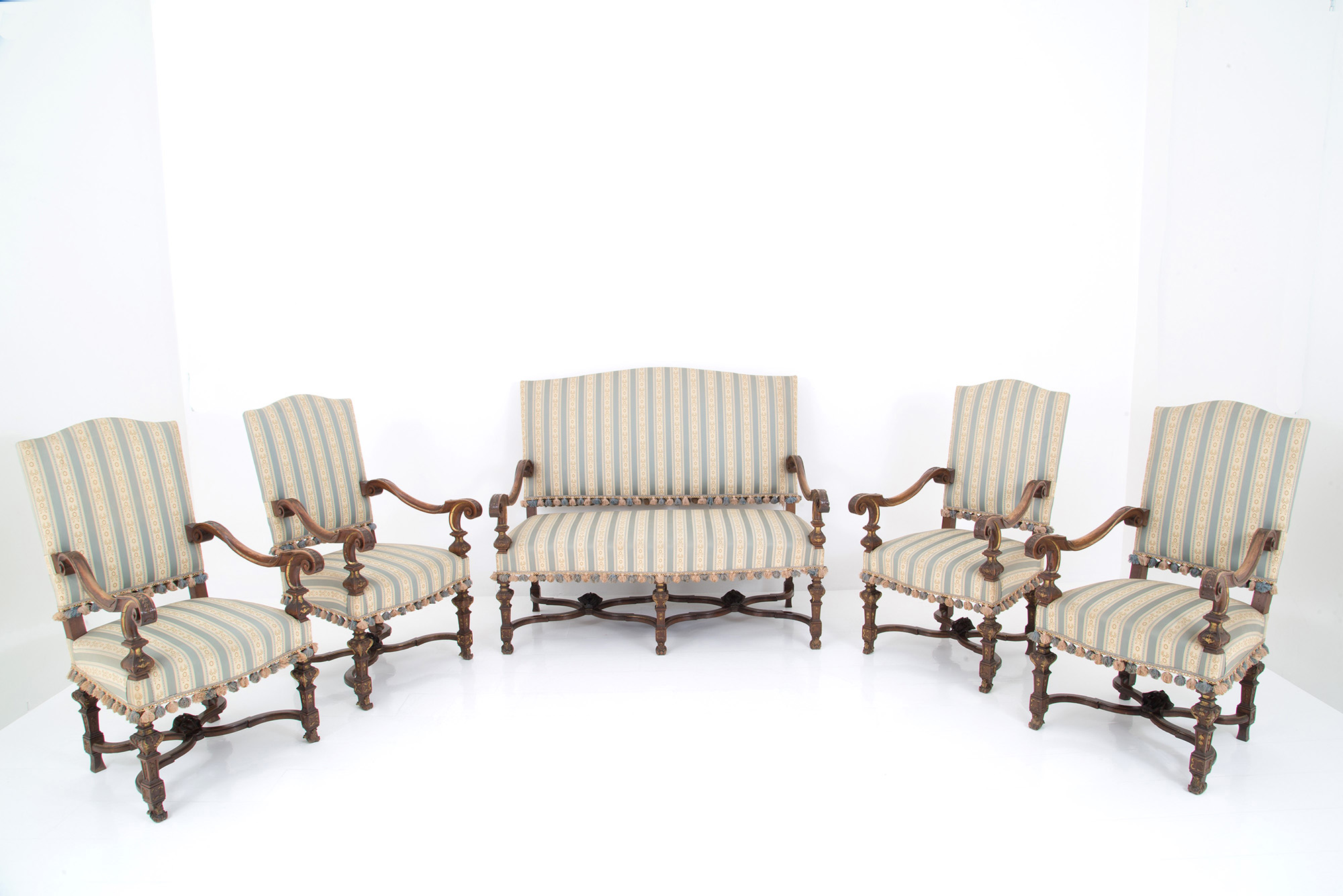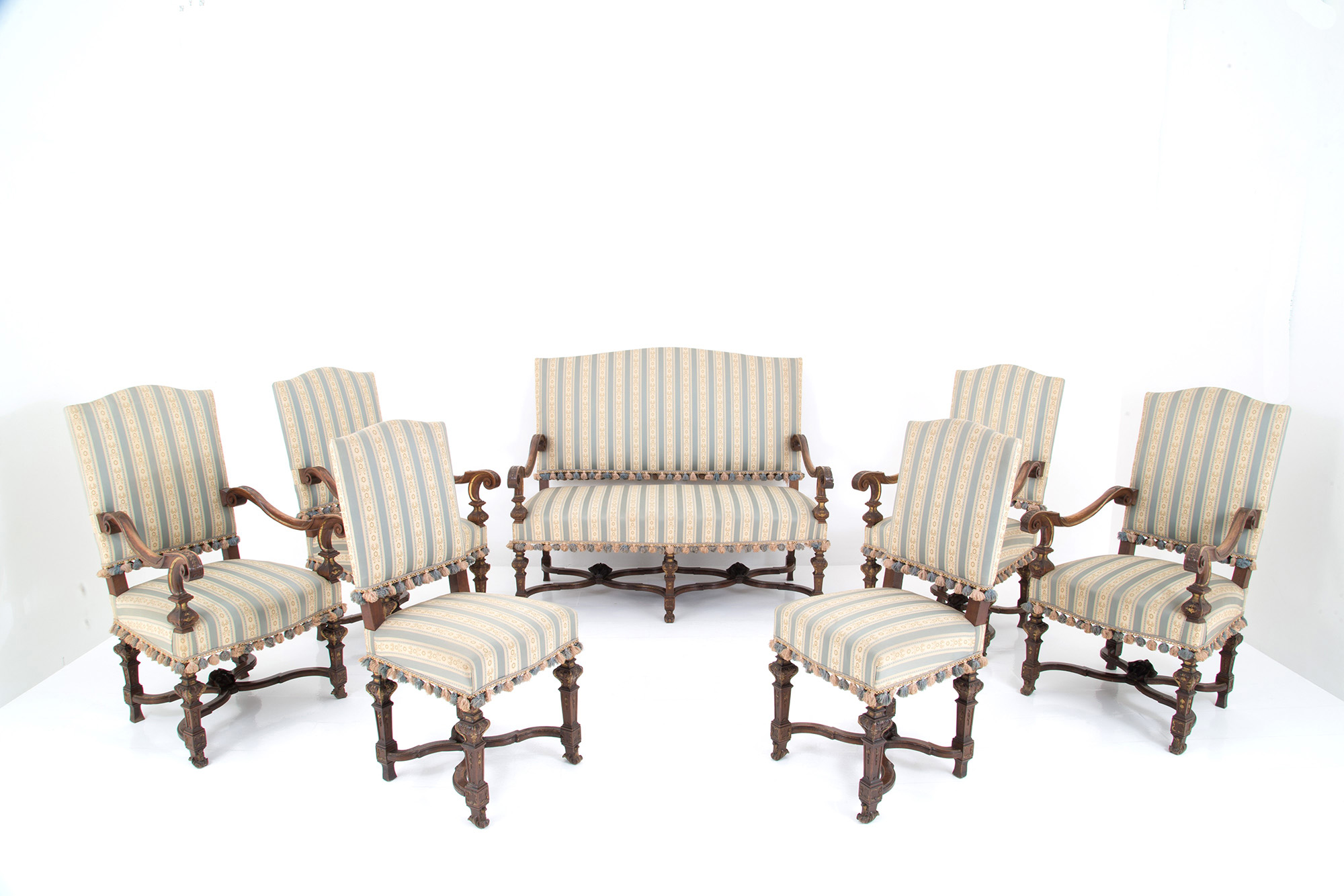 Carved and partially gilded walnut living room with crossed legs, composed of a three-seater sofa, four armchairs and two chairs with upholstered backs and seats. 19th century. Minor defects. Salotto in noce intagliato e parzialmente dorato con gambe unite da crociera, composto da un divano a tre posti, quattro poltrone e due sedie con schienali e sedute imbottite. XIX secolo. Lievi difetti.