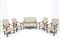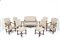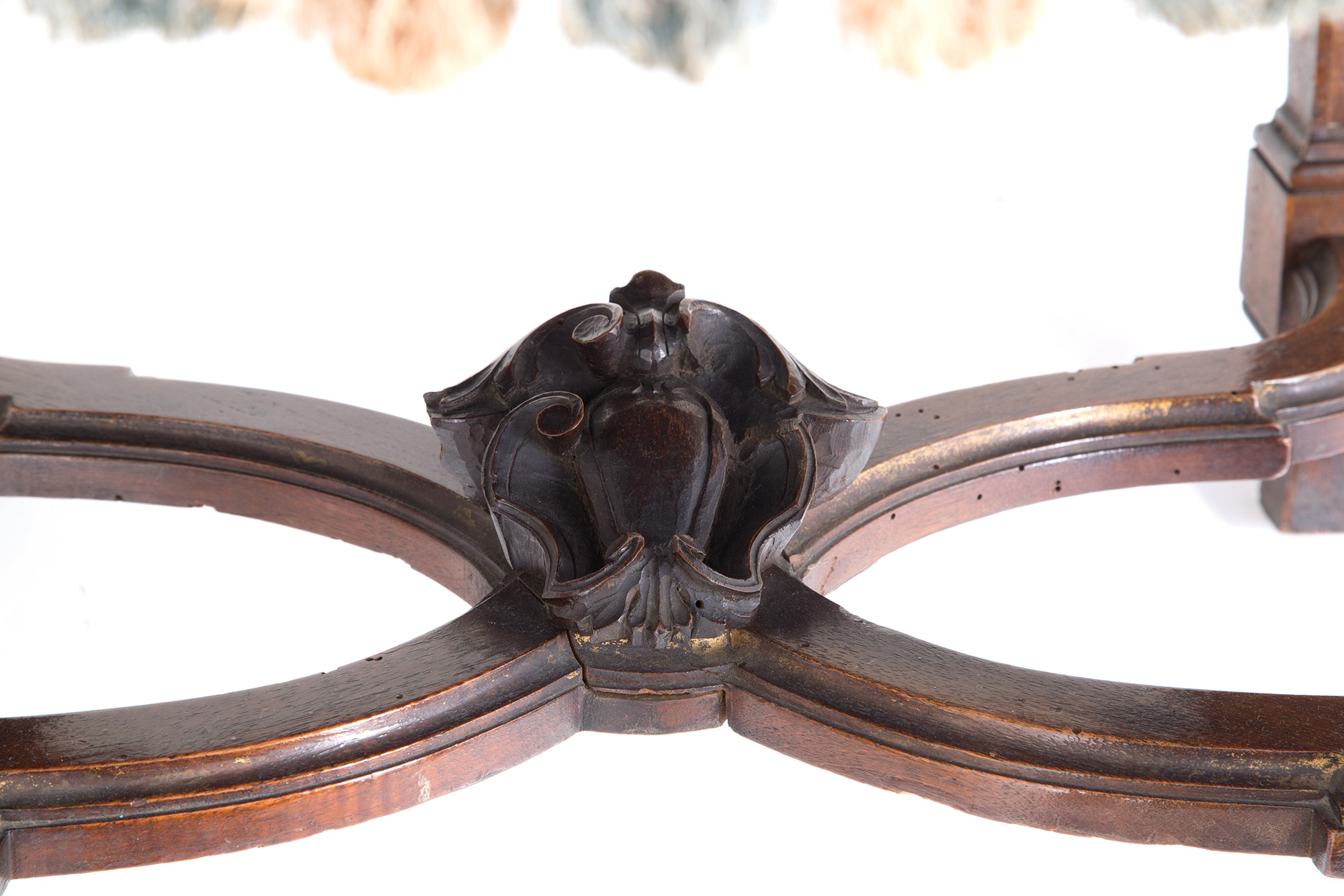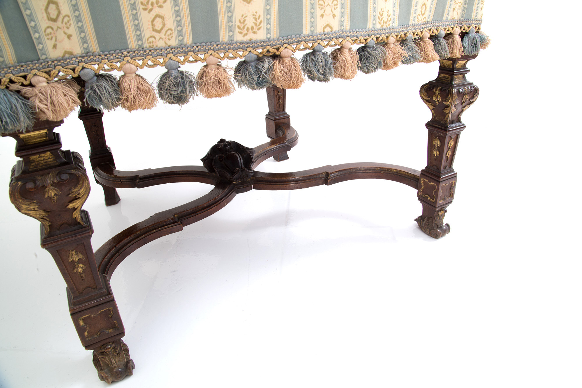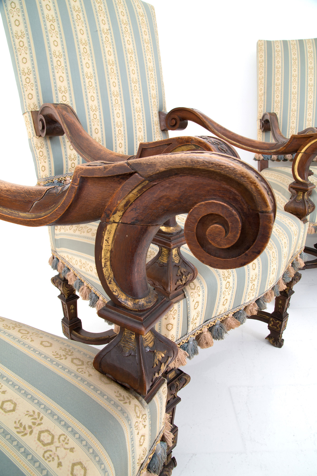 Carved and partially gilded walnut living room with crossed legs, composed of a three-seater sofa, four armchairs and two chairs with upholstered backs and seats. 19th century. Minor defects. Salotto in noce intagliato e parzialmente dorato con gambe unite da crociera, composto da un divano a tre posti, quattro poltrone e due sedie con schienali e sedute imbottite. XIX secolo. Lievi difetti.