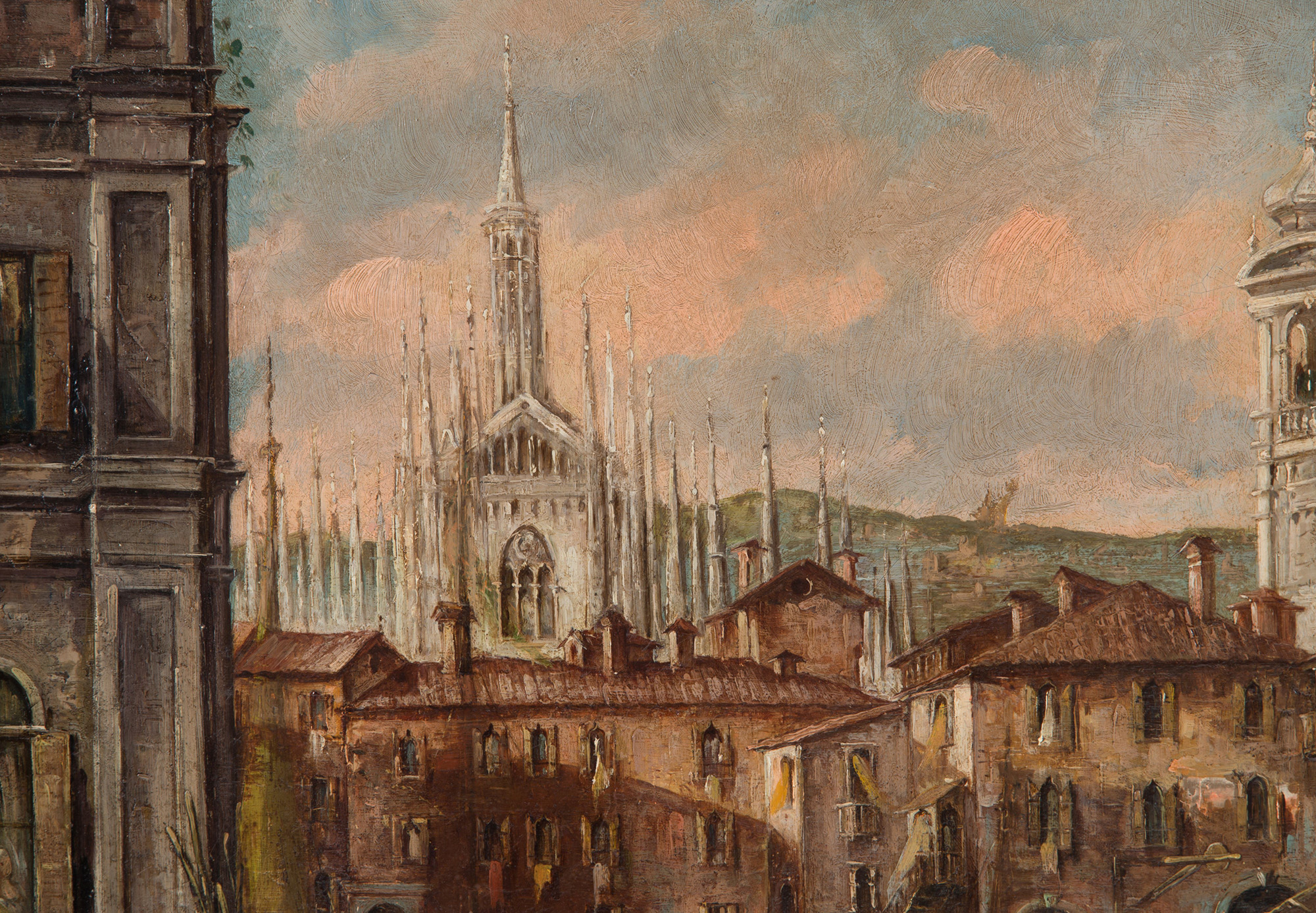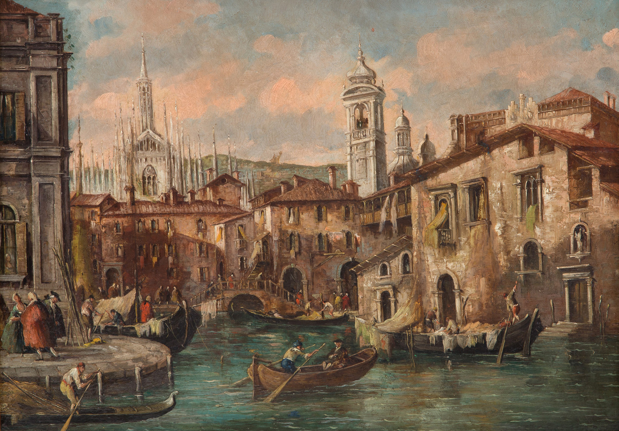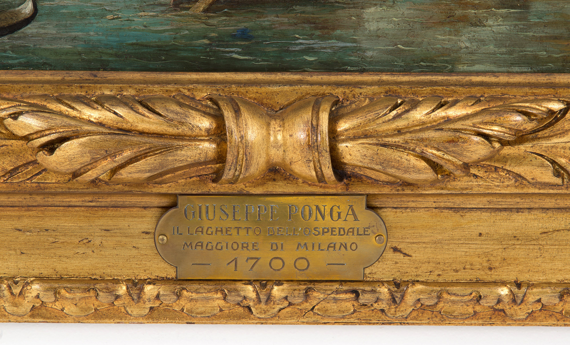 GIUSEPPE PONGA (Chioggia 1856-Venezia 1925). Oil painting on canvas entitled "THE LAKE OF THE MAGGIORE HOSPITAL OF MILAN". In a contemporary carved and gilded wooden frame. 50x70cm approx. GIUSEPPE PONGA (Chioggia 1856-Venezia 1925). Dipinto olio su tela intitolato "IL LAGHETTO DELL'OSPEDALE MAGGIORE DI MILANO". In cornice coeva in legno intagliato e dorato. 50x70 cm ca.