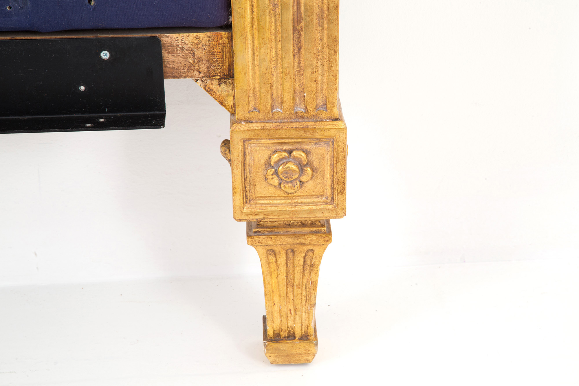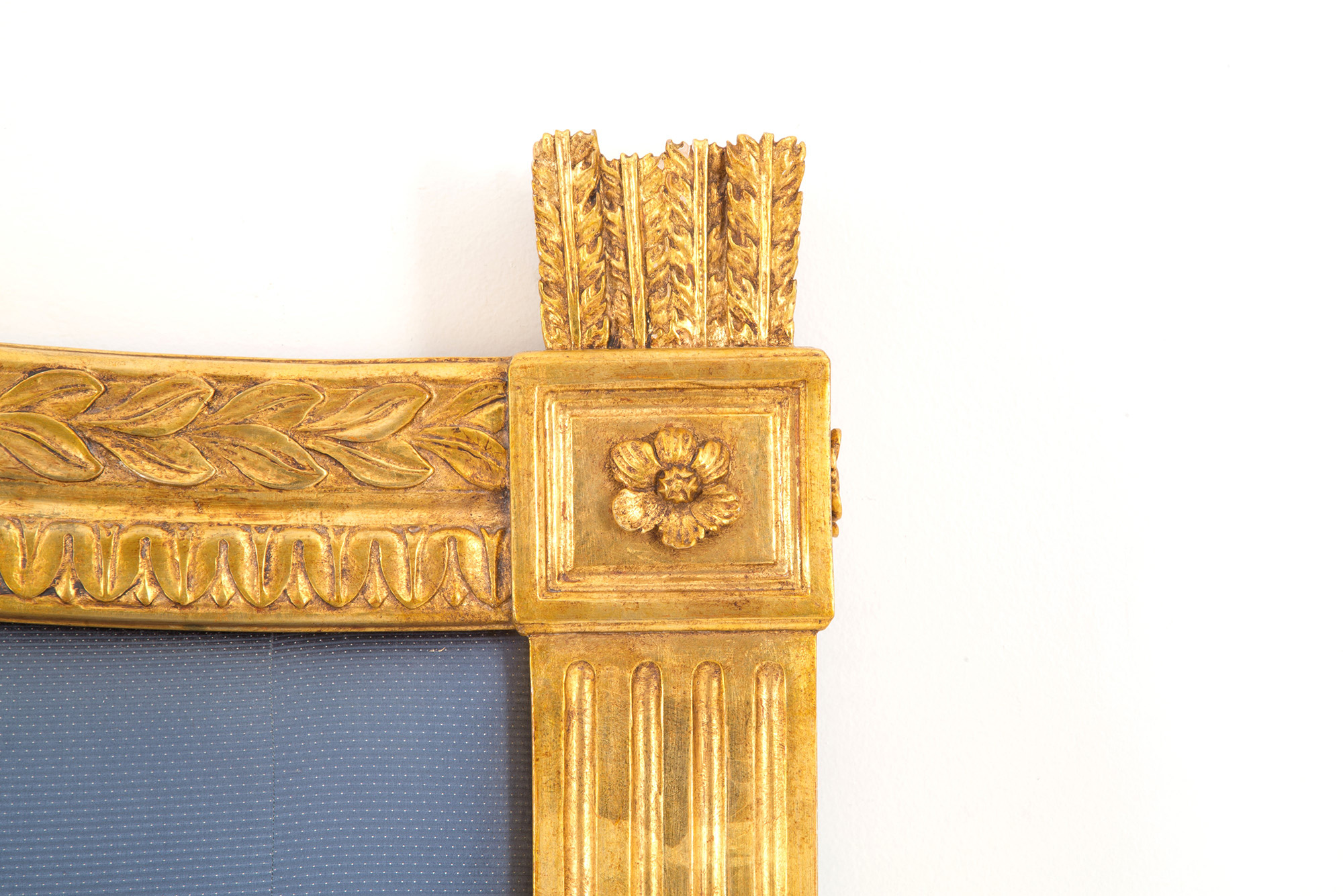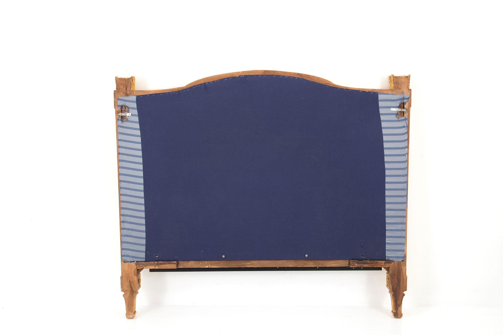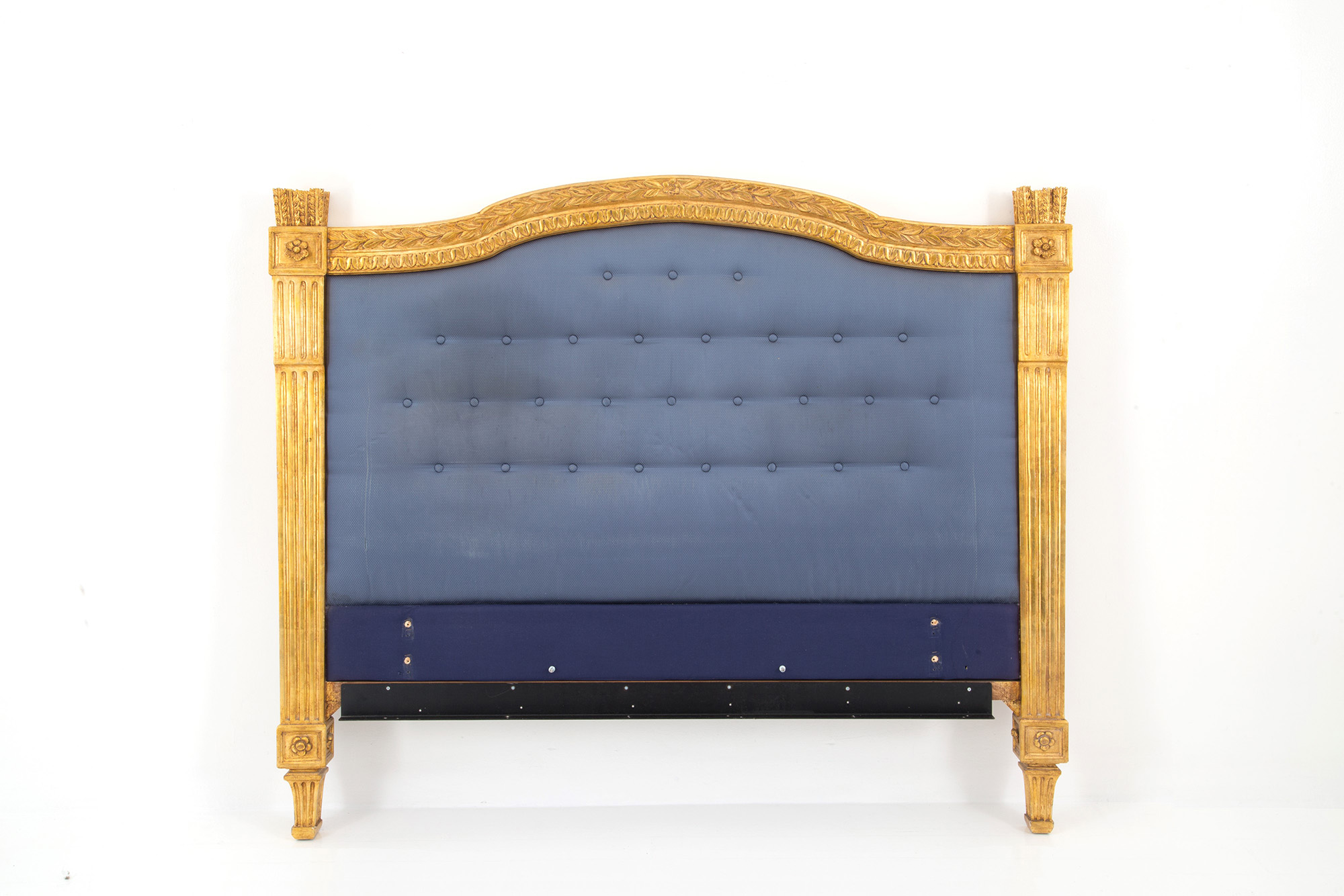 Headboard in carved and gilded wood, partly padded and covered in blue silk. Early 20th century. 158x185cm approx. Testata da letto in legno intagliato e dorato in parte imbottita e rivestita in seta azzurra. Inizi XX secolo. 158x185 cm ca.