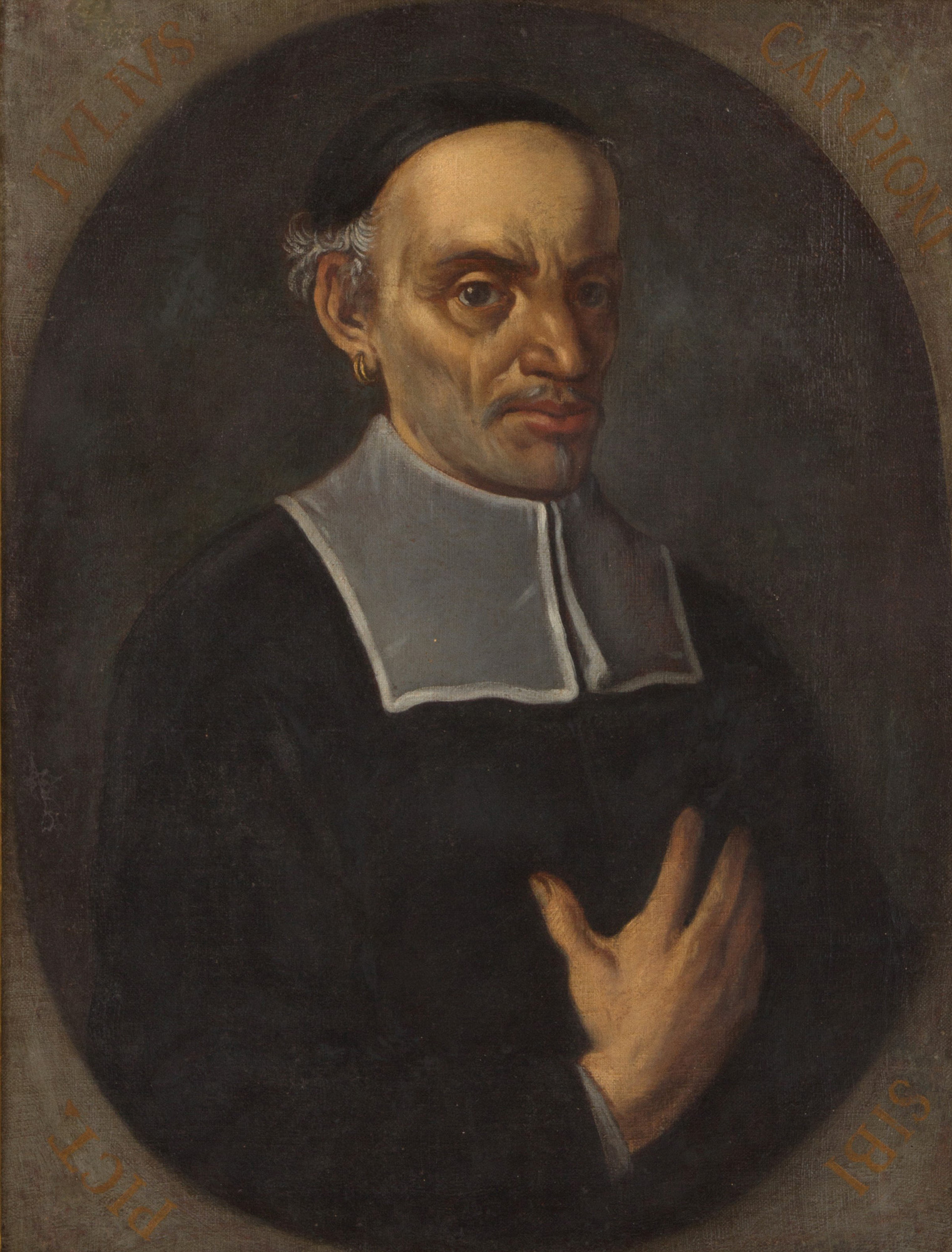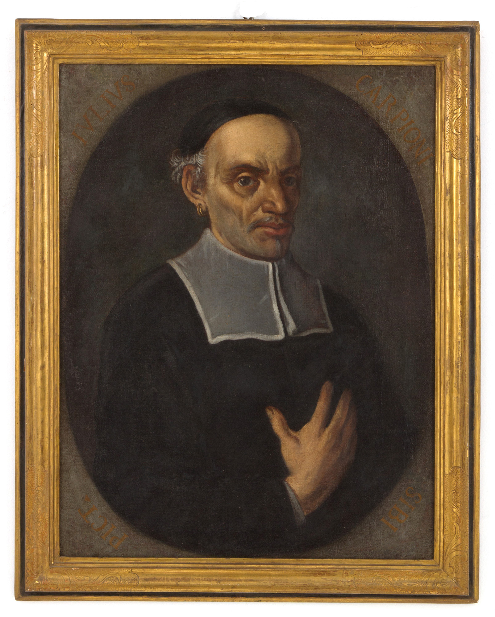 GIULIO CARPIONI (Venezia 1613-Vicenza 1678). Oval oil painting on canvas depicting "SELF-PORTRAIT". Signed. In frame. Already relined and reframed. 74x57 cm approx. GIULIO CARPIONI (Venezia 1613-Vicenza 1678). Dipinto ovale olio su tela raffigurate "AUTORITRATTO". Firmato. In cornice. Gia' rintelato e rintelaiato. 74x57 cm ca.