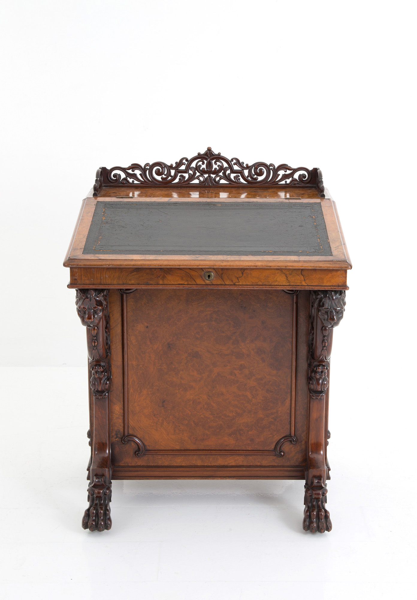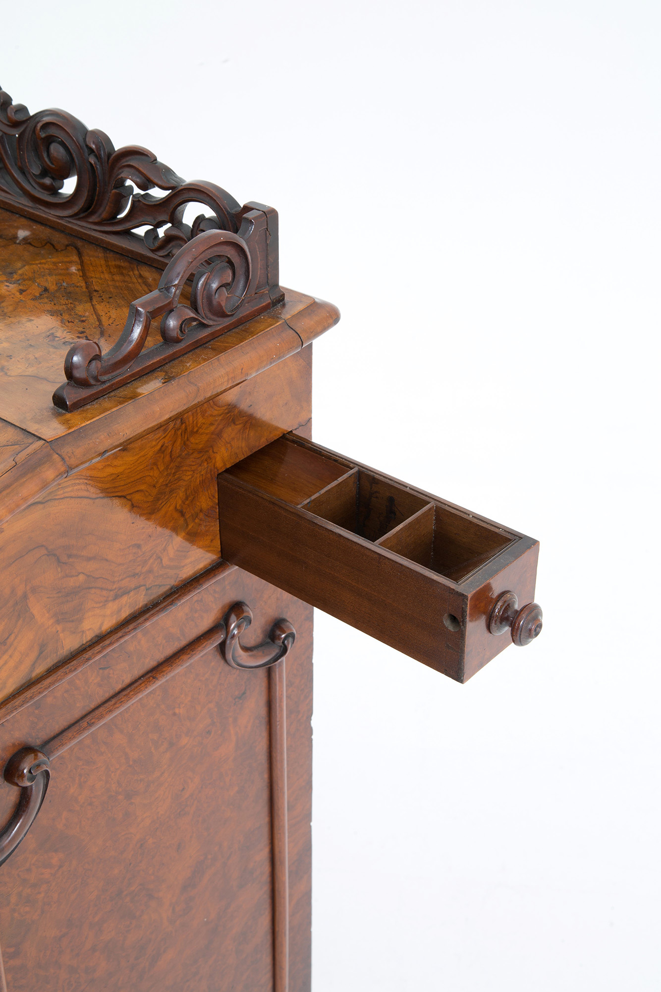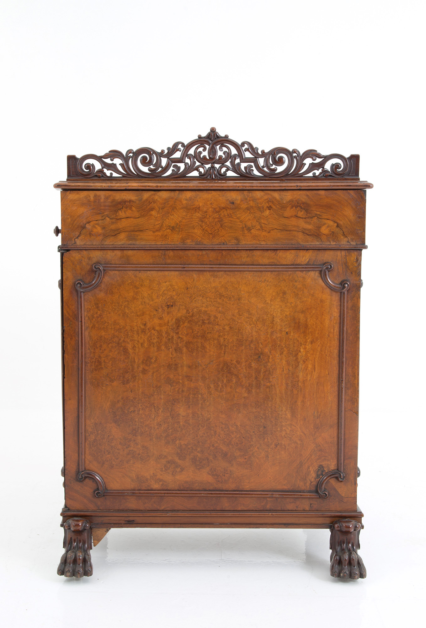 Davenport in walnut burl with legs carved in the shape of lions, door and drawers on one side. England. 19th century. Minor defects. 82.5x66x62 cm approx. Davenport in radica di noce con gambe intagliate a guisa di leoni, anta e cassettini su un lato. Inghilterra. XIX secolo. Lievi difetti. 82,5x66x62 cm ca.
