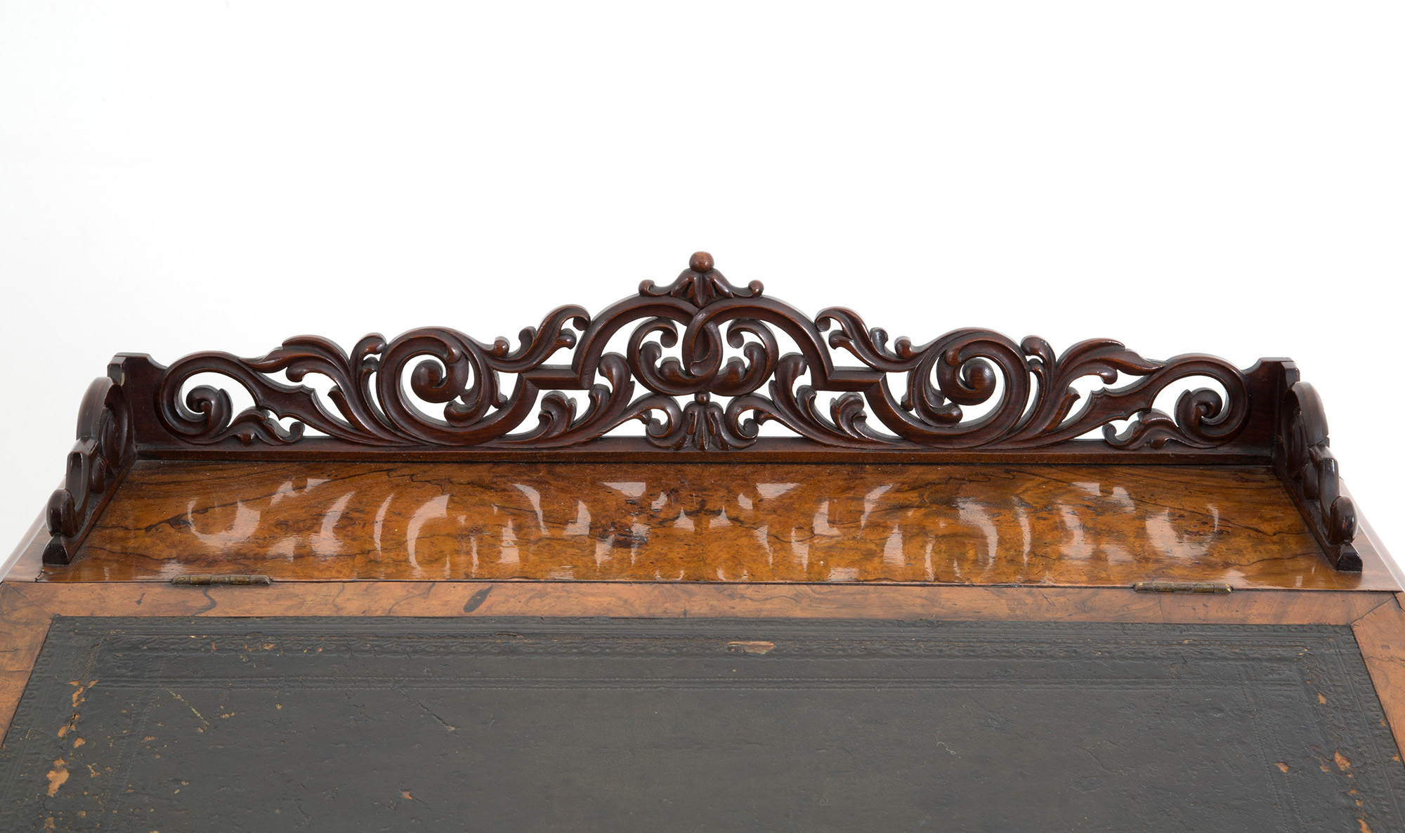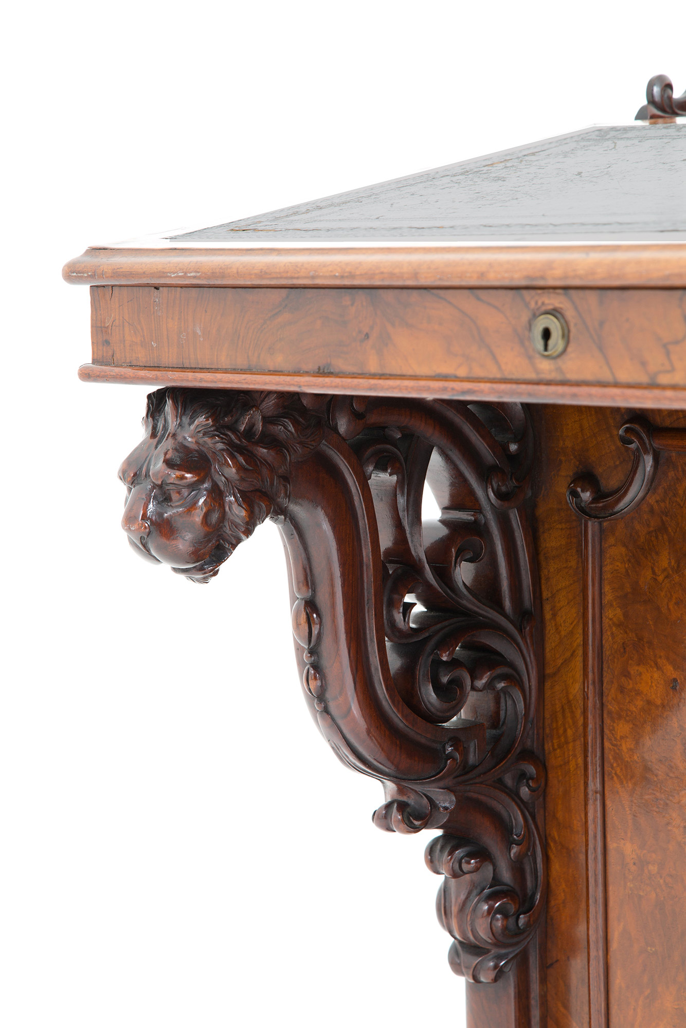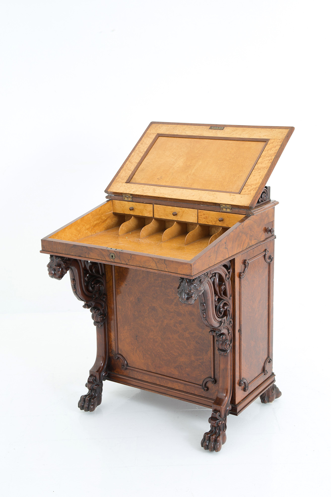 Davenport in walnut burl with legs carved in the shape of lions, door and drawers on one side. England. 19th century. Minor defects. 82.5x66x62 cm approx. Davenport in radica di noce con gambe intagliate a guisa di leoni, anta e cassettini su un lato. Inghilterra. XIX secolo. Lievi difetti. 82,5x66x62 cm ca.
