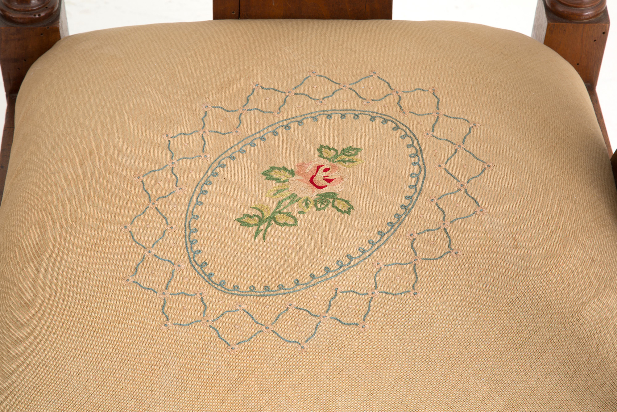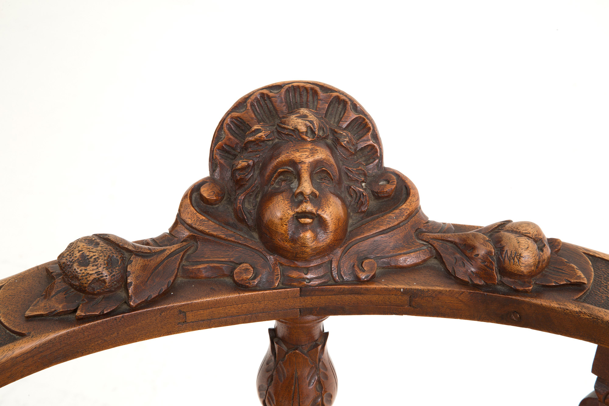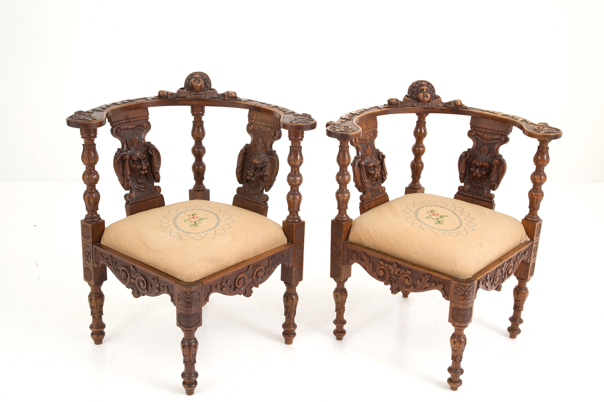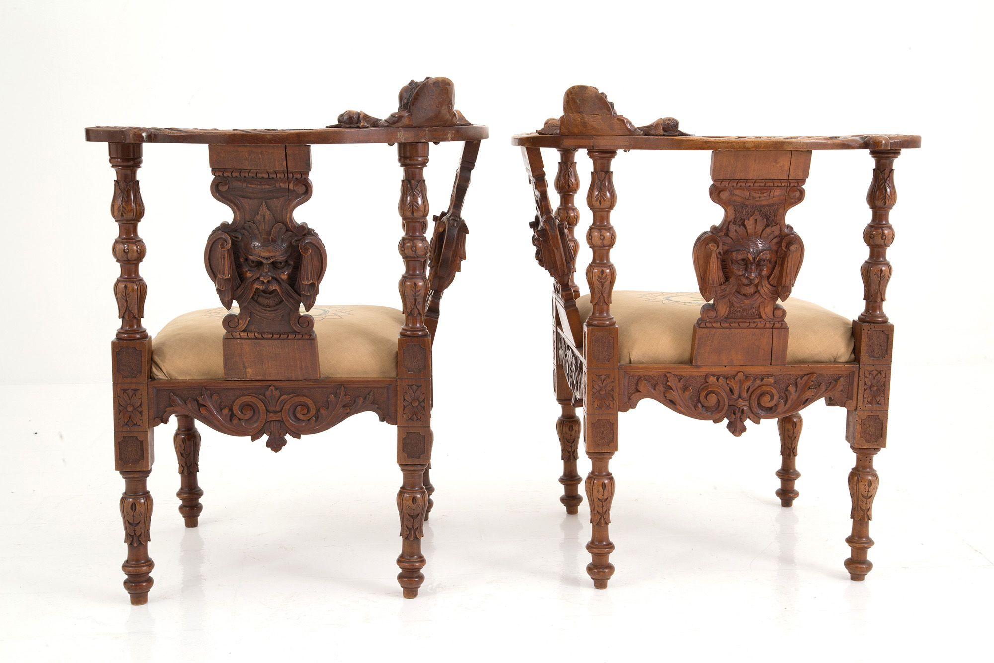 Pair of carved walnut armchairs with curved backrest, turned legs and folders with masks and padded seats. Late 19th century. Minor defects. 81x62x76 cm approx. Coppia di poltrone in noce intagliato con schienale curvo, gambe tornite e cartelle con mascheroni e sedute imbottite. Fine XIX secolo. Lievi difetti. 81x62x76 cm ca.