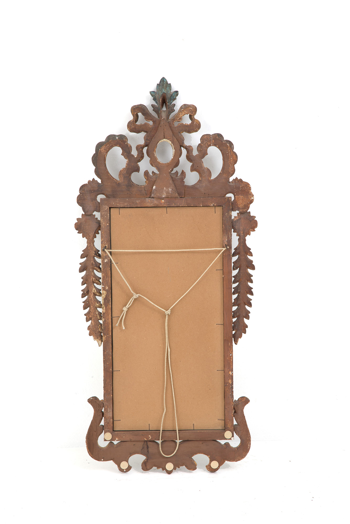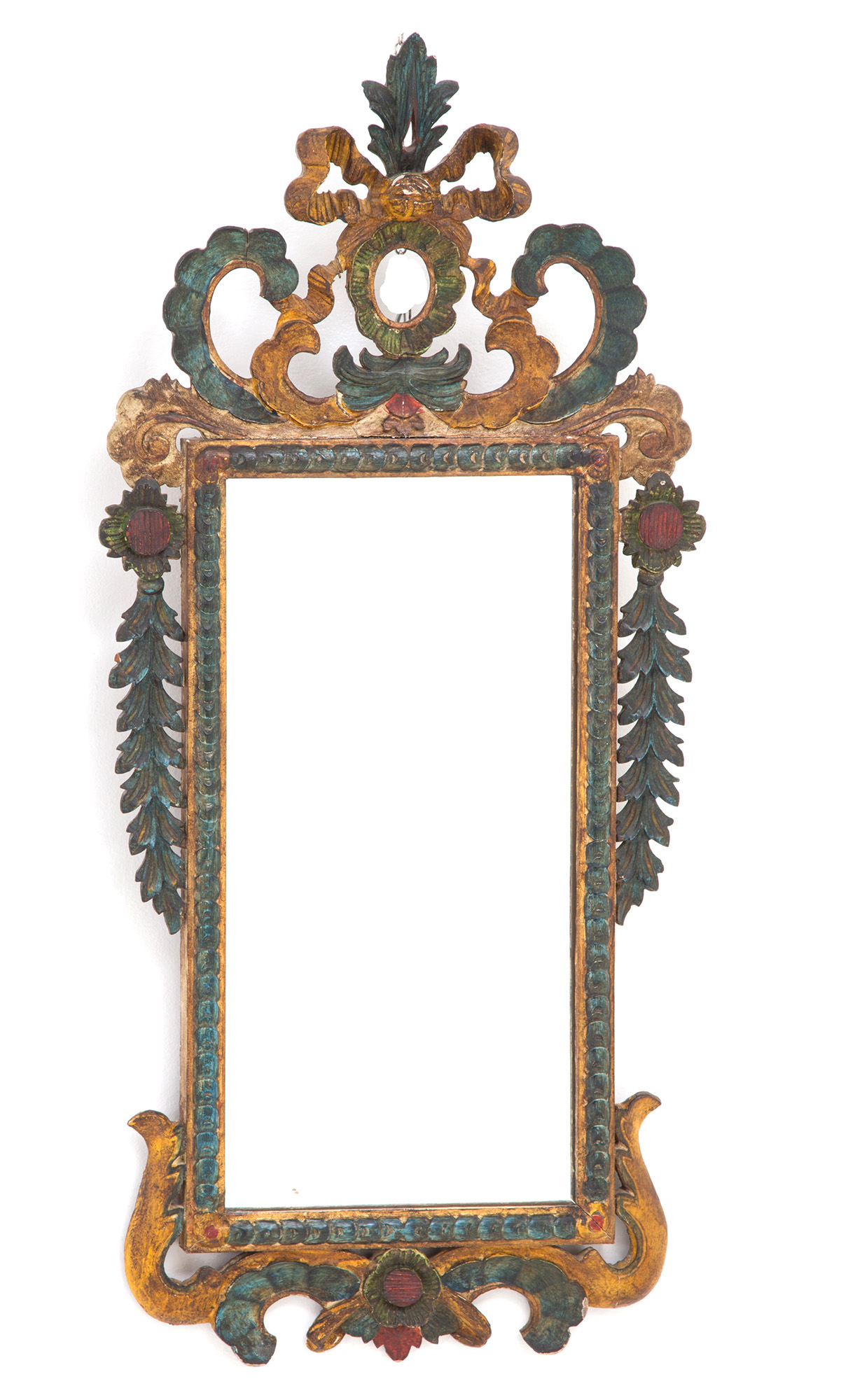 Small mirror in carved, lacquered and gilded wood with frame decorated with scroll friezes and festoons. Tuscany. Late 19th century. Defects. 91.5x42x9 cm approx. Piccola specchiera in legno intagliato, laccato e dorato con cornice decorata da fregi a volute e festoni. Toscana. Fine XIX secolo. Difetti. 91,5x42x9 cm ca.