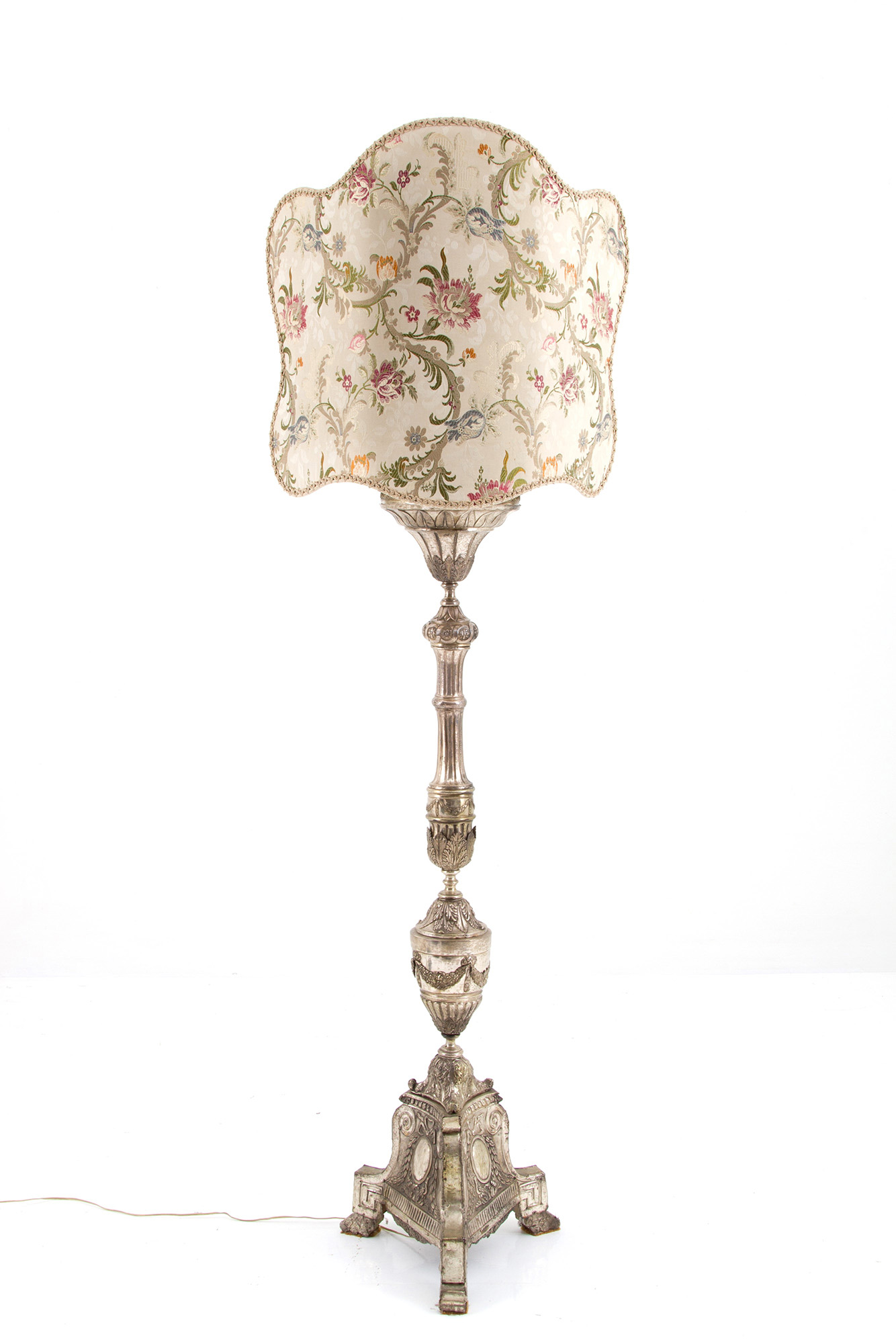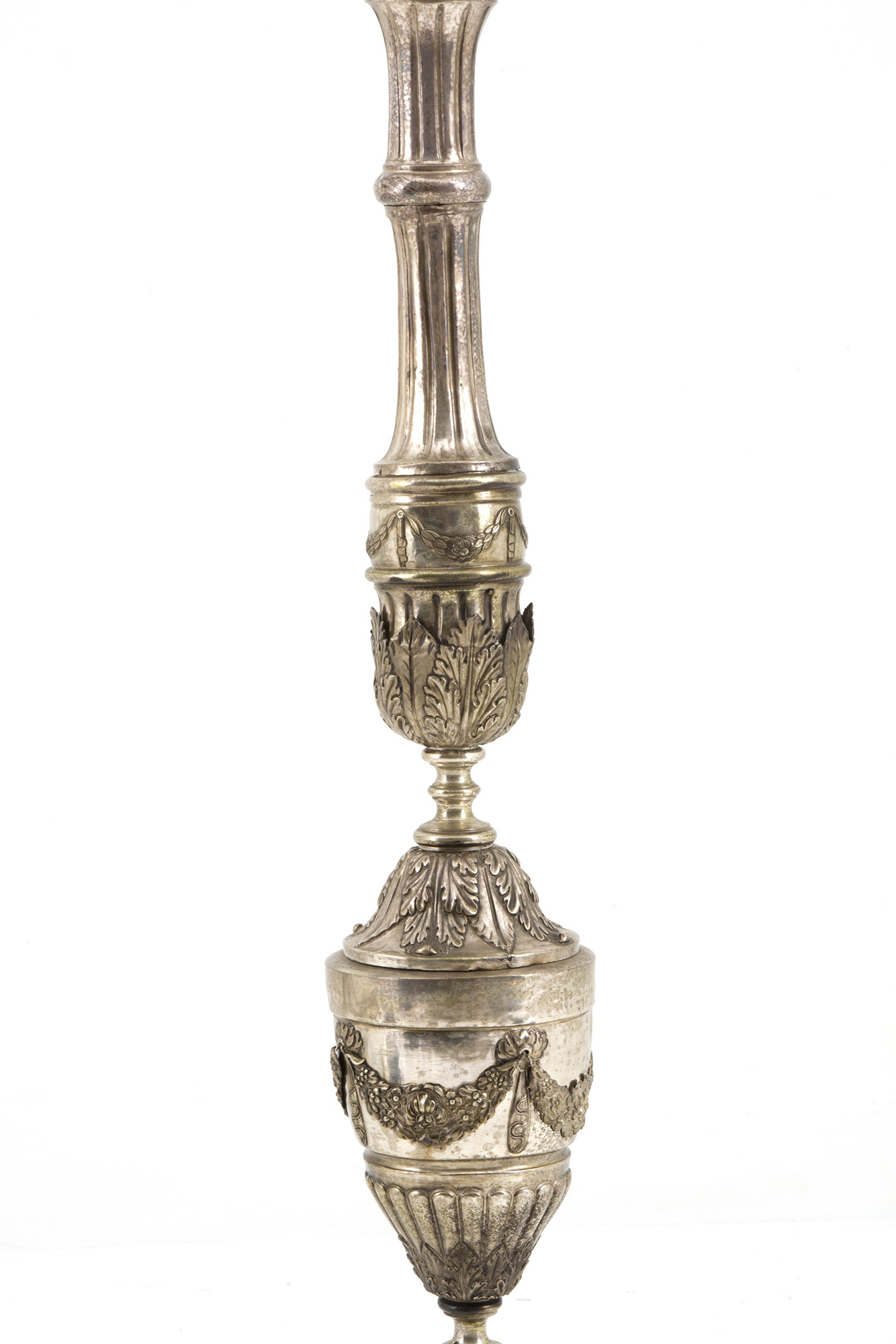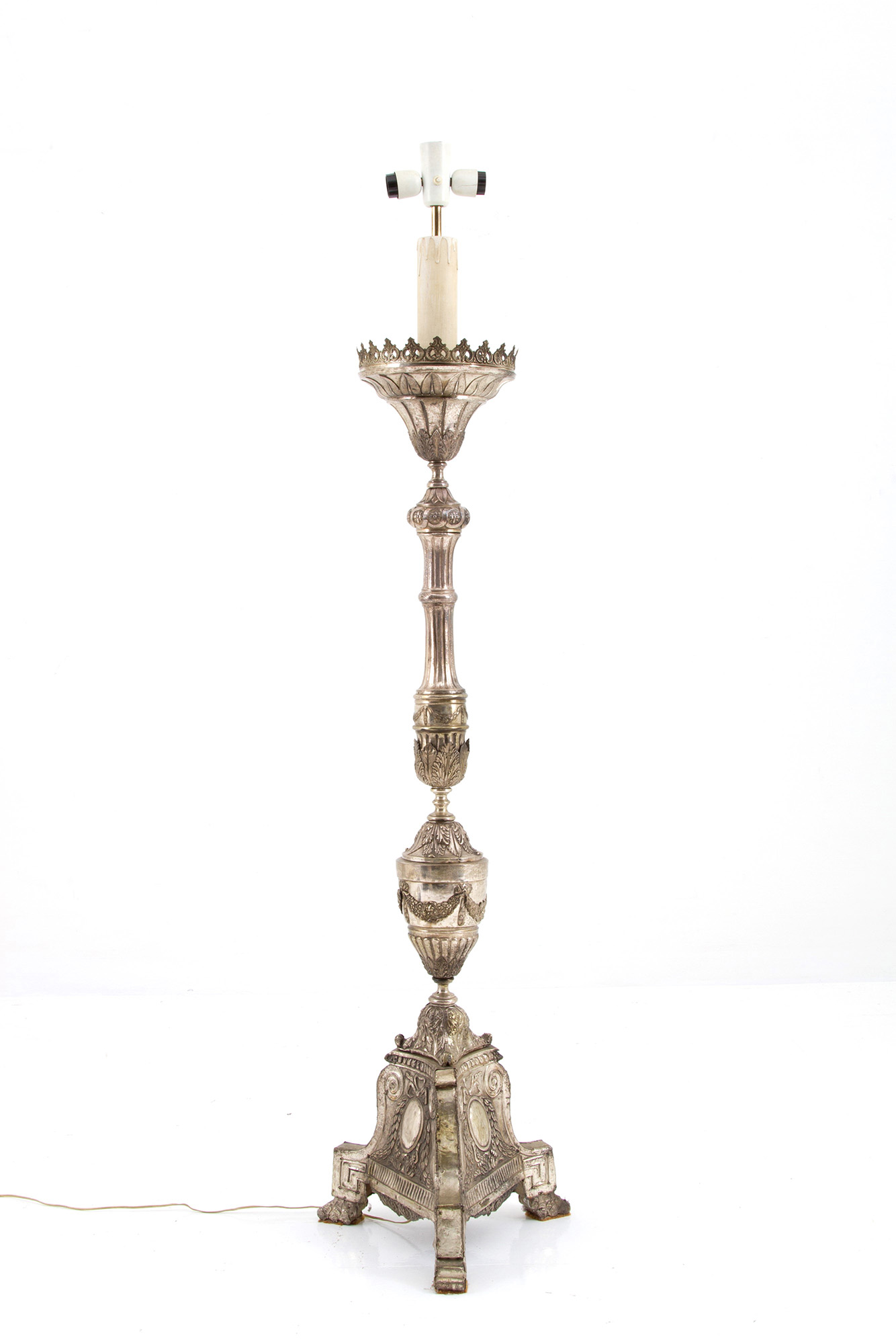 Candlestick transformed into a lamp in silver metal. Late 18th century. Height approx. 137 cm Candeliere trasformato a lampada in metallo argentato. Fine XVIII secolo. Alt. 137 cm ca.