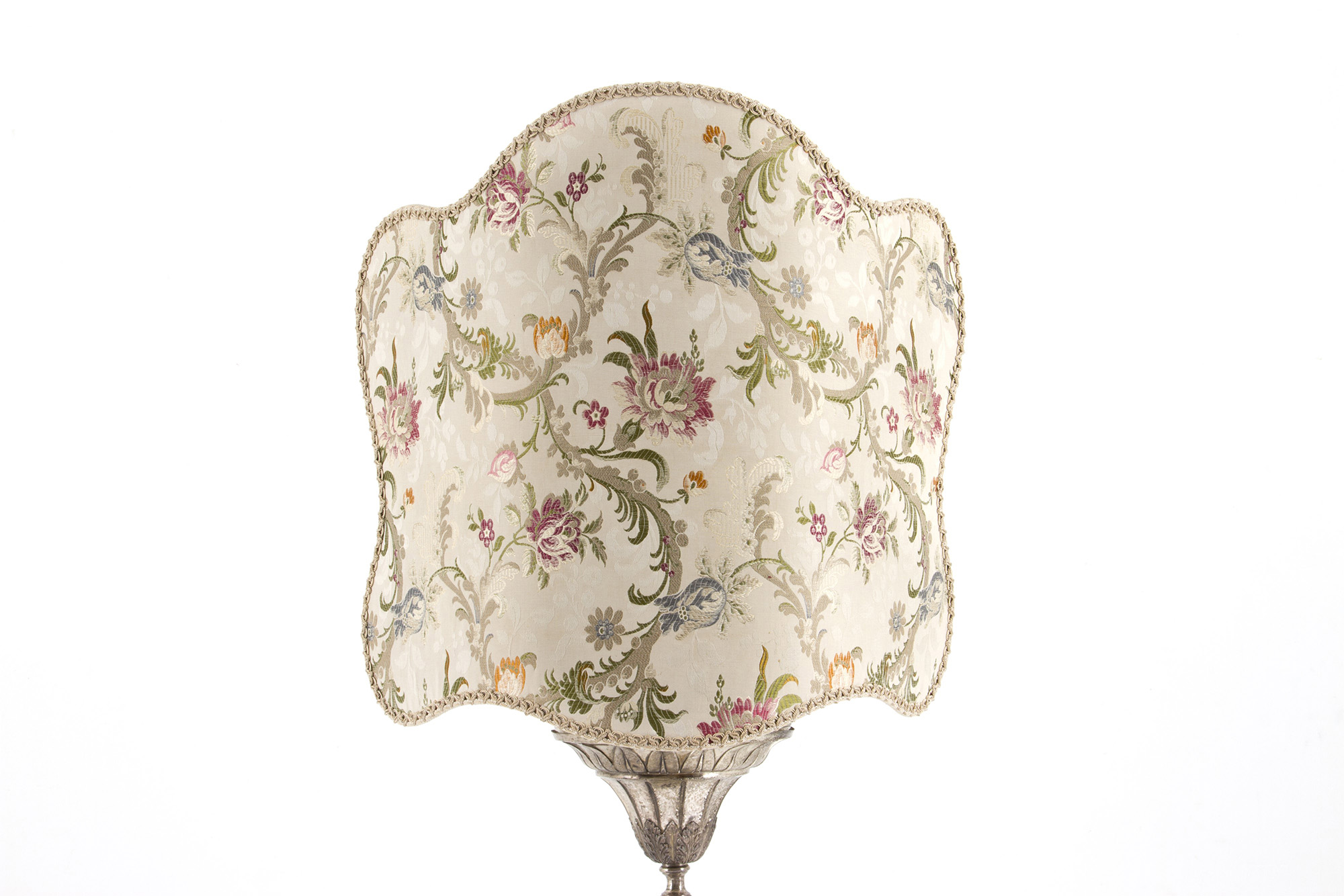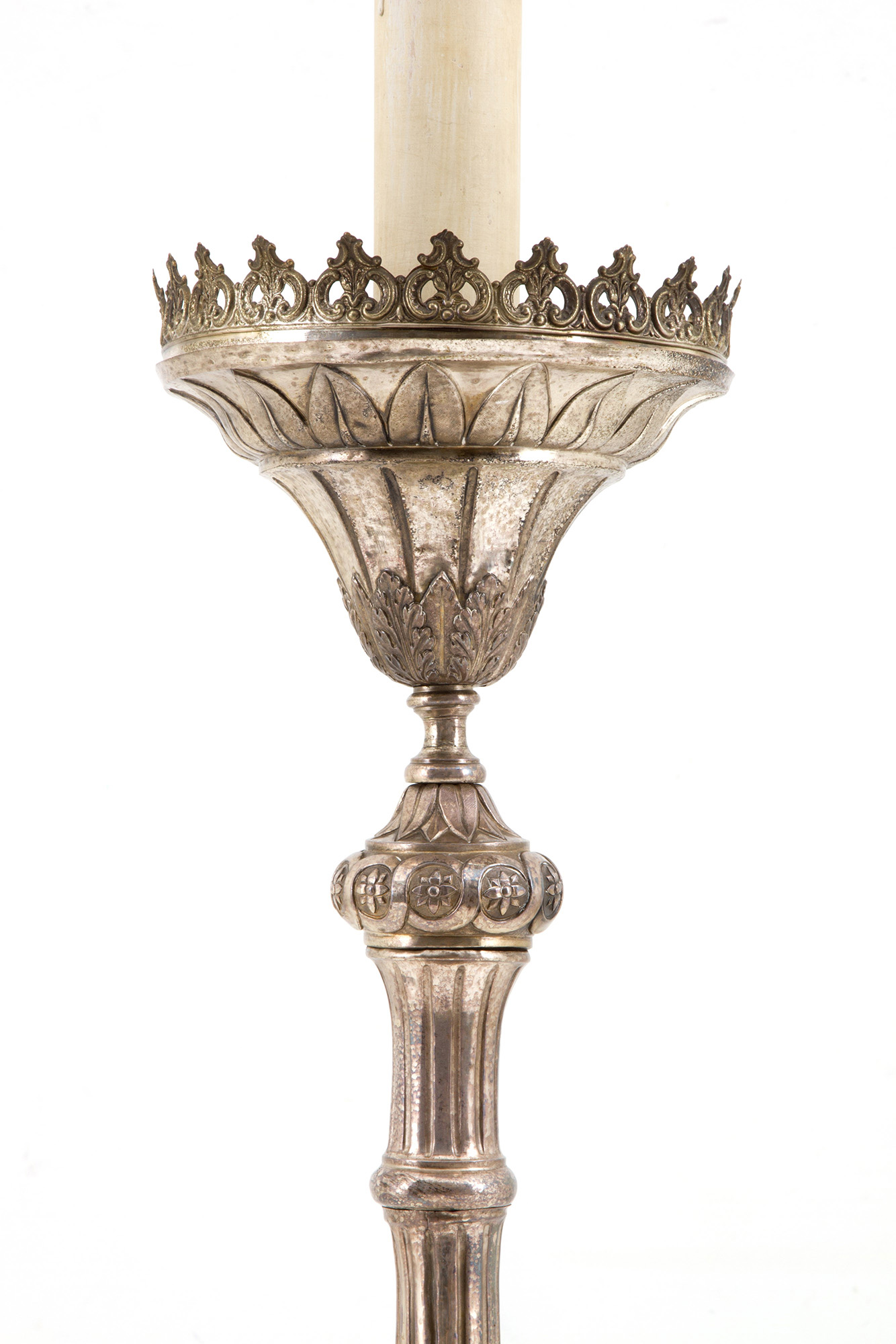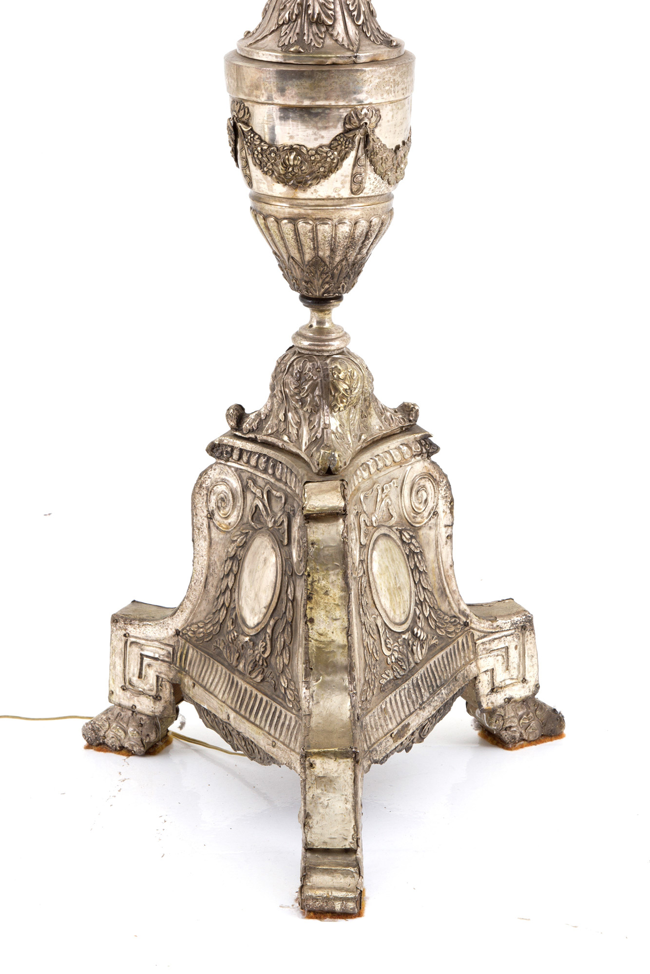 Candlestick transformed into a lamp in silver metal. Late 18th century. Height approx. 137 cm Candeliere trasformato a lampada in metallo argentato. Fine XVIII secolo. Alt. 137 cm ca.
