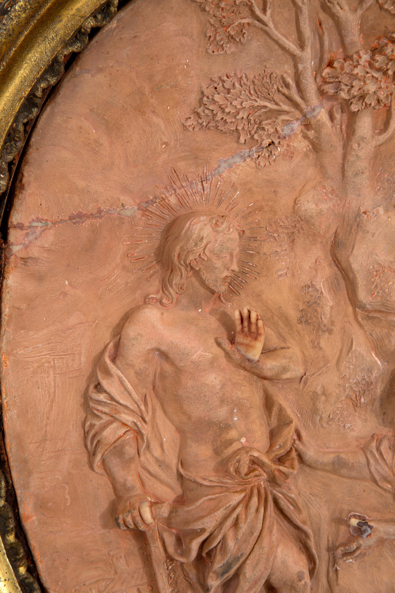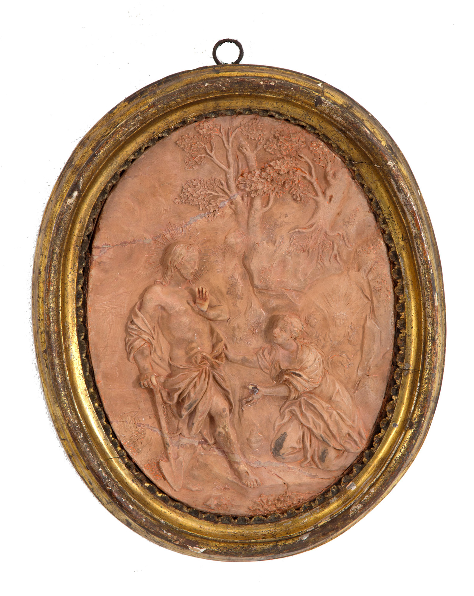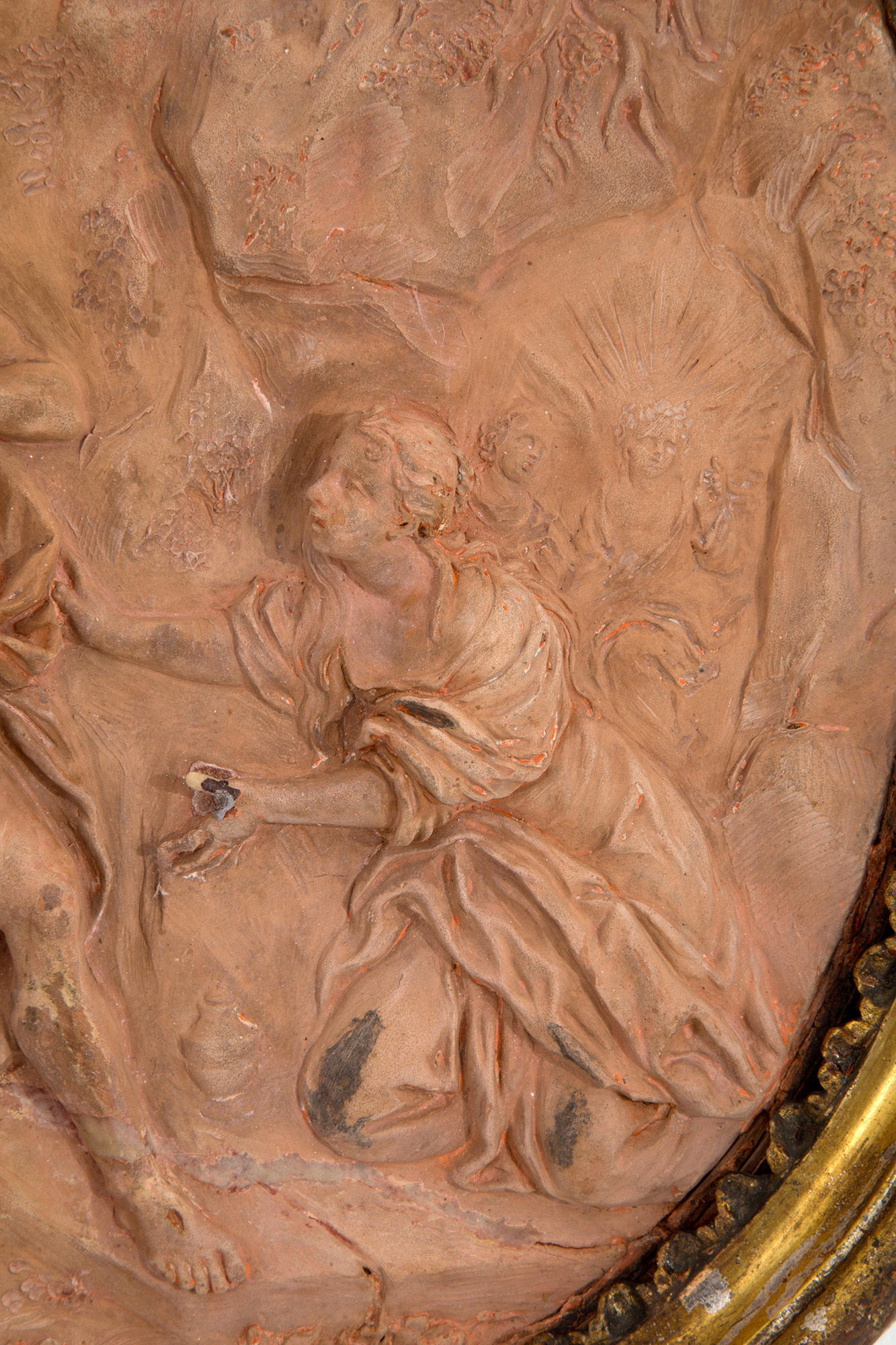 MARIA GIUSEPPE MAZZA (cerchia di) (Bologna 1653-1741). Pair of oval terracotta bas-reliefs depicting "JOSEPH'S DREAM" and "NOLI ME TANGERE". In a gilded and contemporary frame. Defects and restorations. 47x41 cm approx. MARIA GIUSEPPE MAZZA (cerchia di) (Bologna 1653-1741). Coppia di bassorilievi ovali in terracotta raffiguranti "IL SOGNO DI GIUSEPPE" e "NOLI ME TANGERE". In cornice dorata e coeva. Difetti e restauri. 47x41 cm ca.