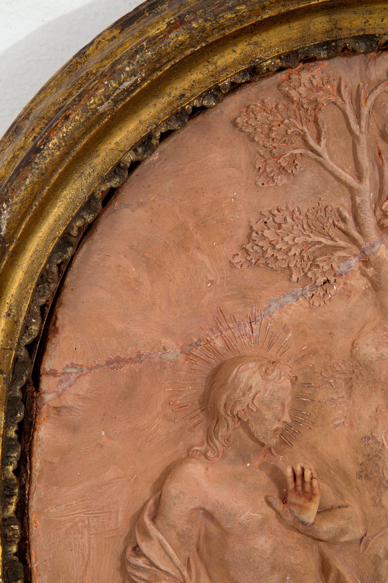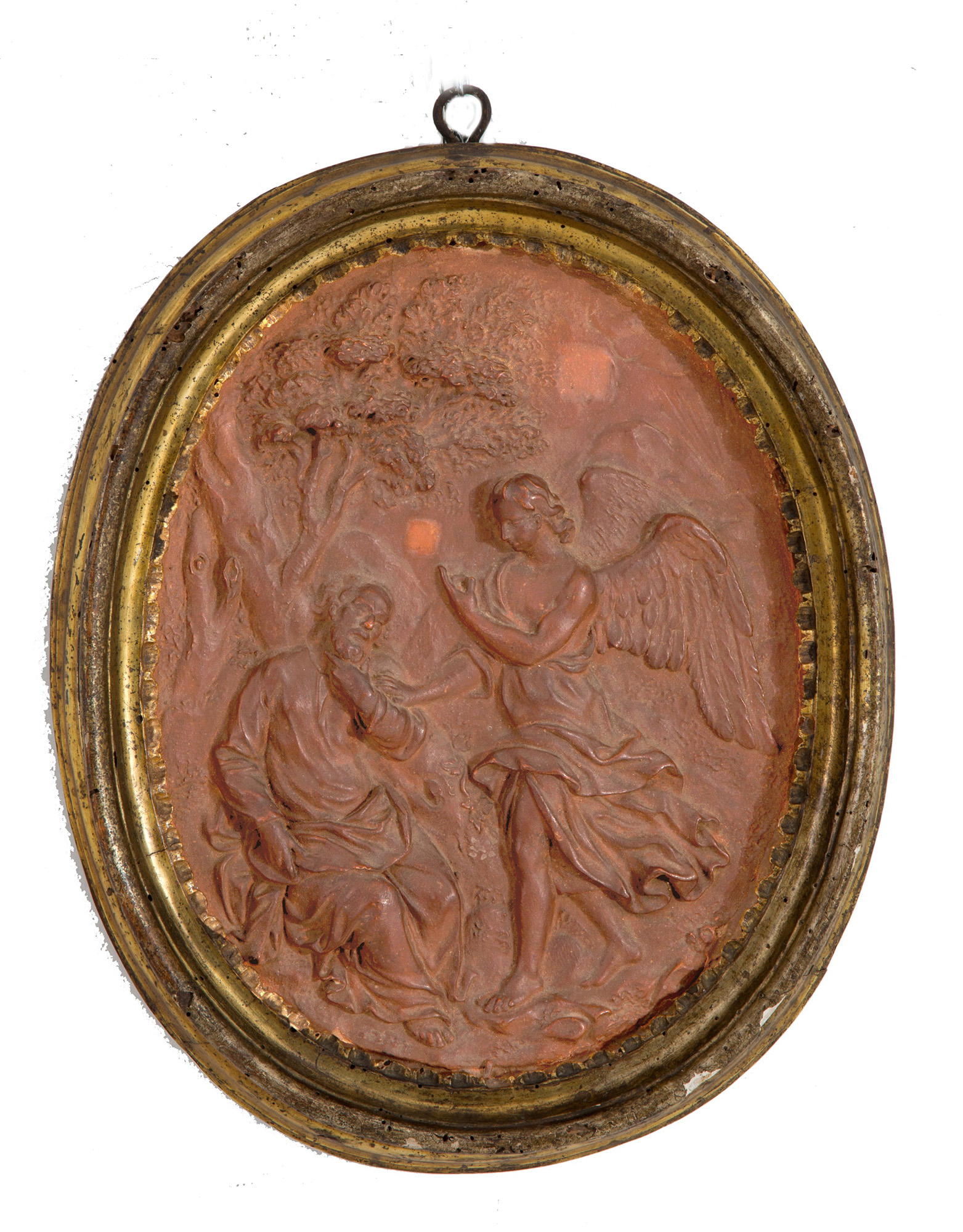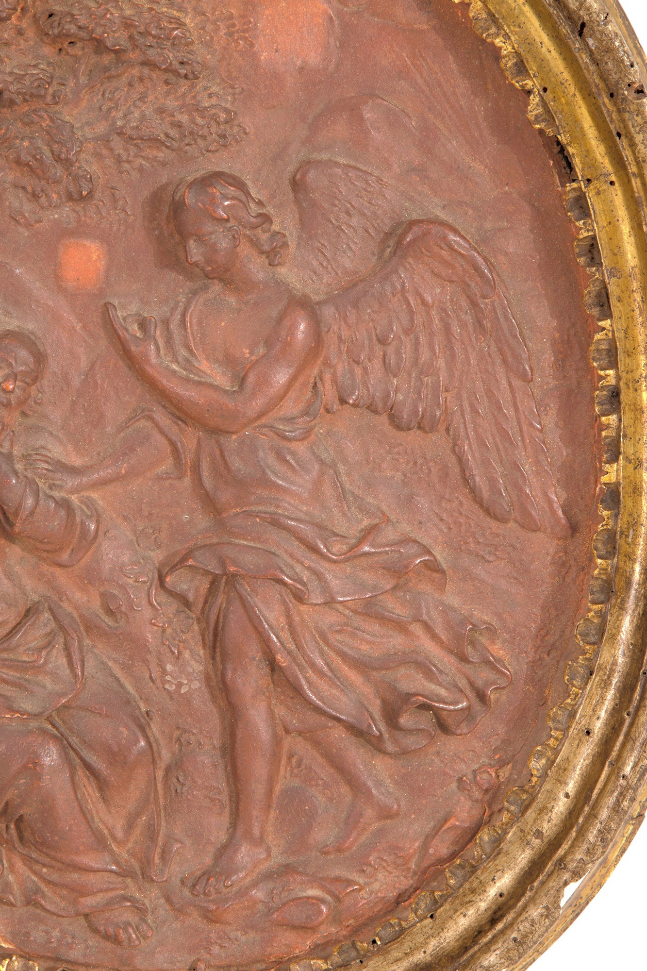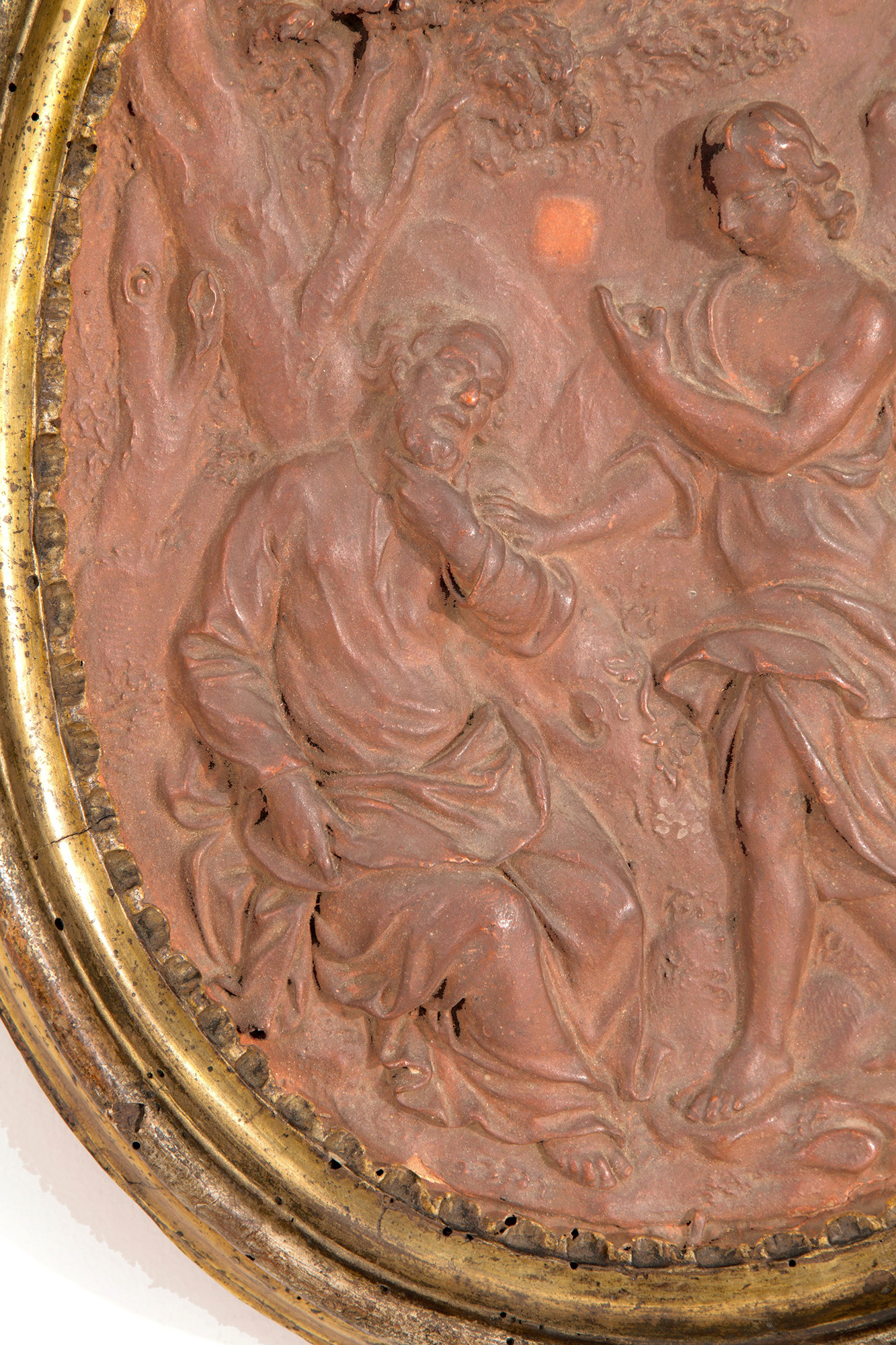 MARIA GIUSEPPE MAZZA (cerchia di) (Bologna 1653-1741). Pair of oval terracotta bas-reliefs depicting "JOSEPH'S DREAM" and "NOLI ME TANGERE". In a gilded and contemporary frame. Defects and restorations. 47x41 cm approx. MARIA GIUSEPPE MAZZA (cerchia di) (Bologna 1653-1741). Coppia di bassorilievi ovali in terracotta raffiguranti "IL SOGNO DI GIUSEPPE" e "NOLI ME TANGERE". In cornice dorata e coeva. Difetti e restauri. 47x41 cm ca.