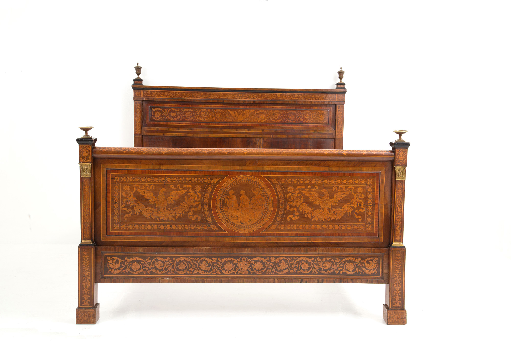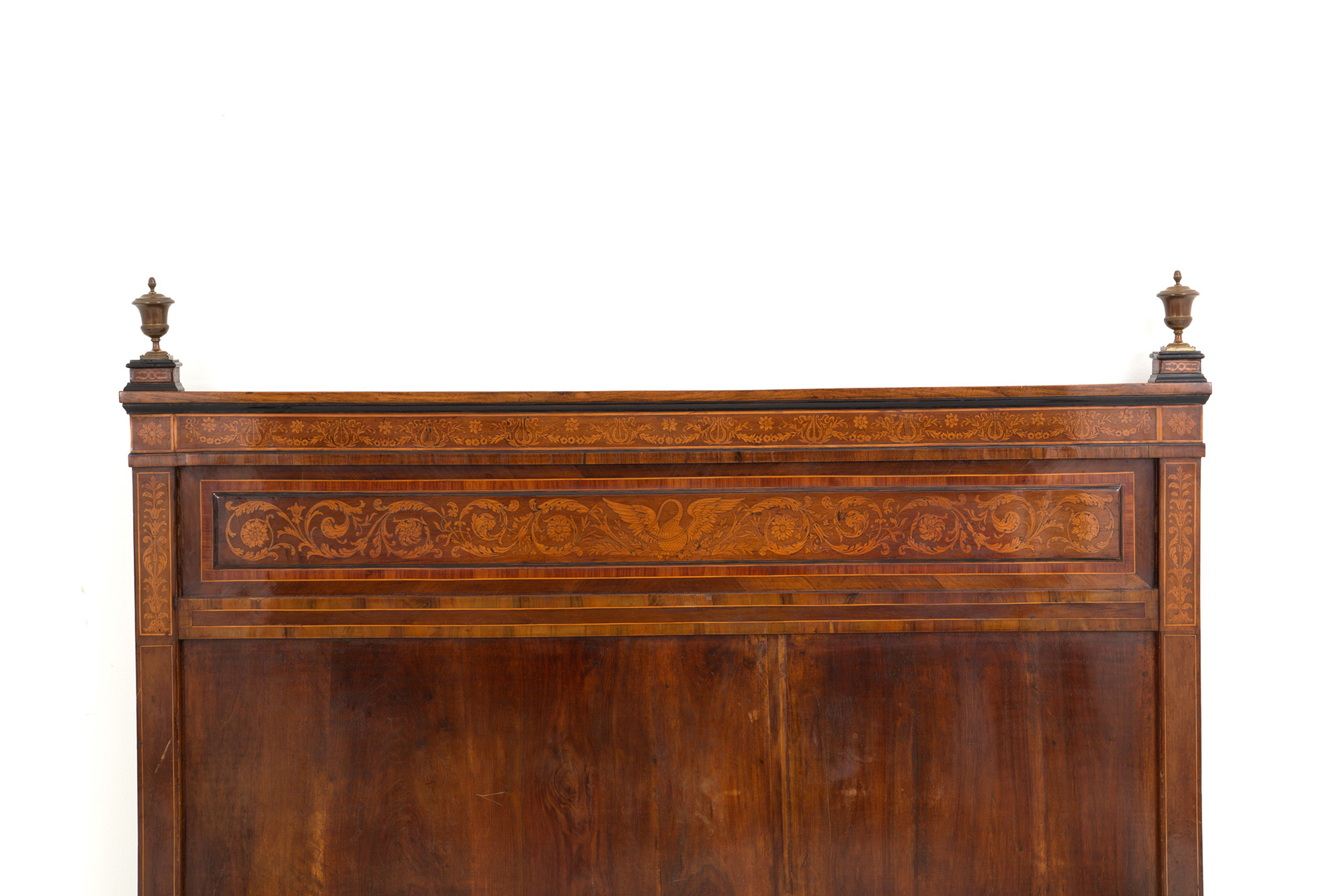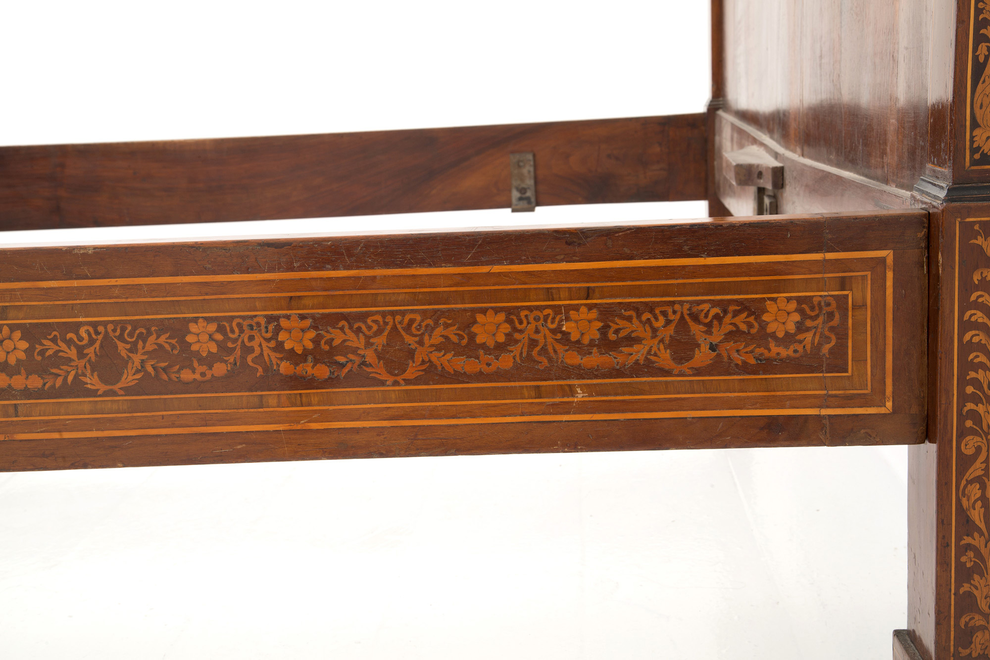 Double bed veneered and inlaid in various woods with spirals with chiseled bronze cups. Lombardy. 18th century. 155x179x218 cm approx. (mattress approx. 160x200 cm) Letto matrimoniale lastronato e intarsiato in legni vari con girali con coppe in bronzo cesellato. Lombardia. XVIII secolo. 155x179x218 cm ca. (materasso da 160x200 cm ca.)