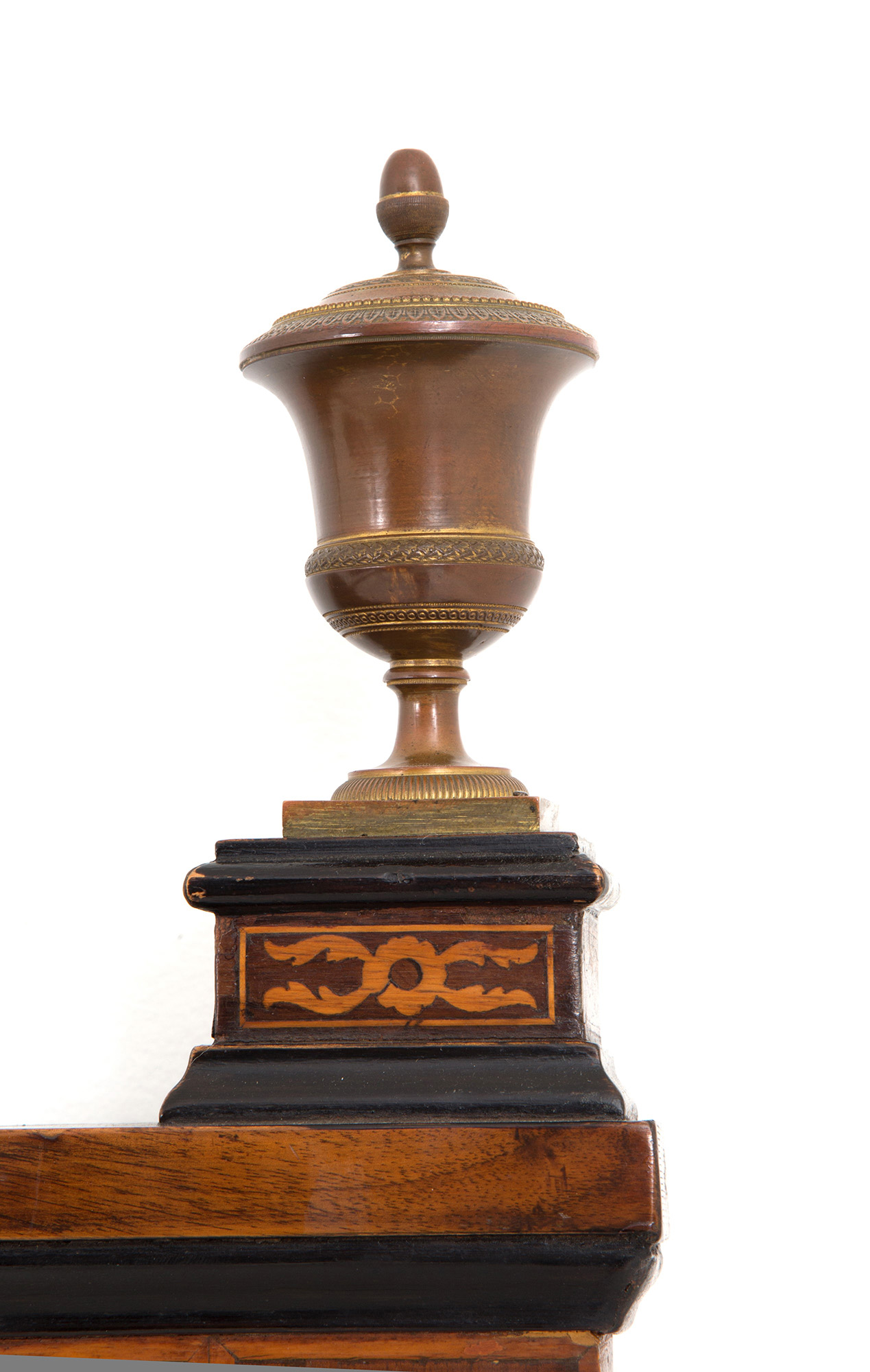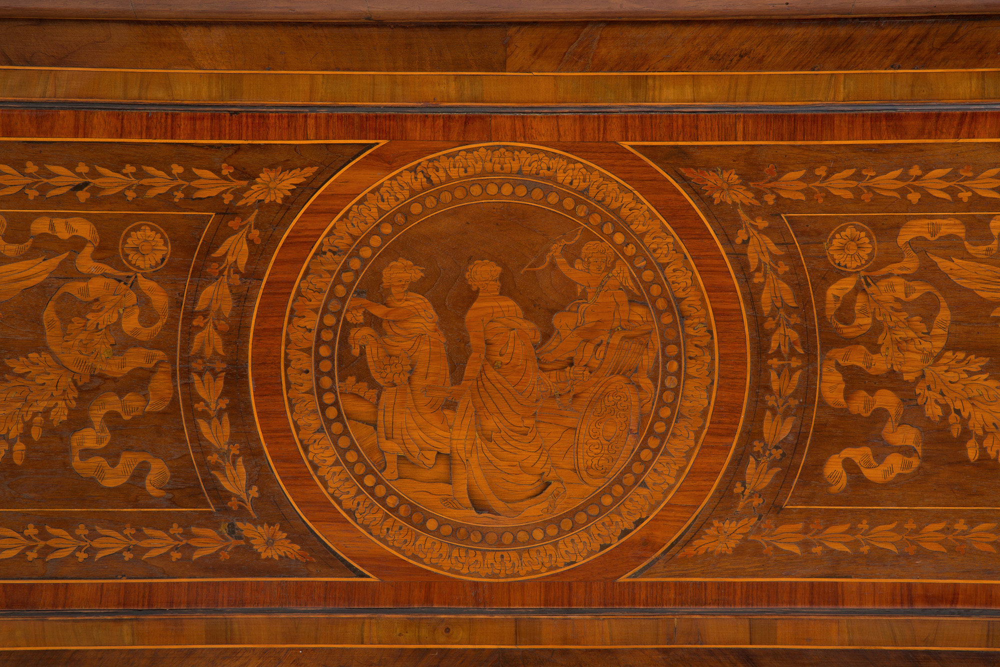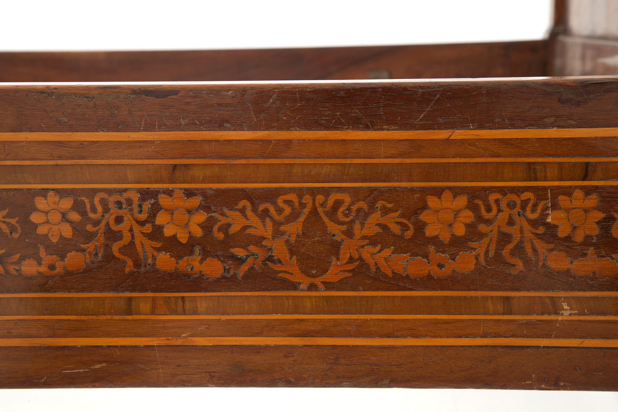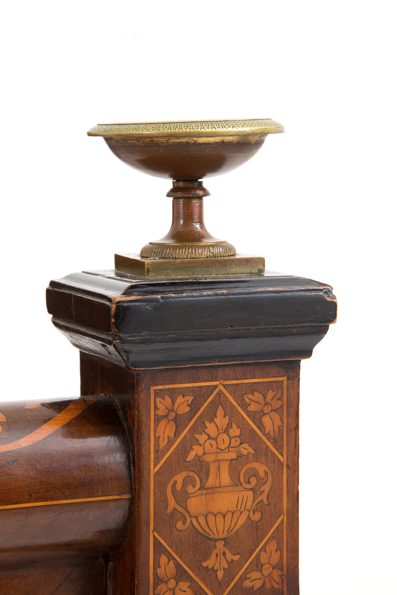 Double bed veneered and inlaid in various woods with spirals with chiseled bronze cups. Lombardy. 18th century. 155x179x218 cm approx. (mattress approx. 160x200 cm) Letto matrimoniale lastronato e intarsiato in legni vari con girali con coppe in bronzo cesellato. Lombardia. XVIII secolo. 155x179x218 cm ca. (materasso da 160x200 cm ca.)
