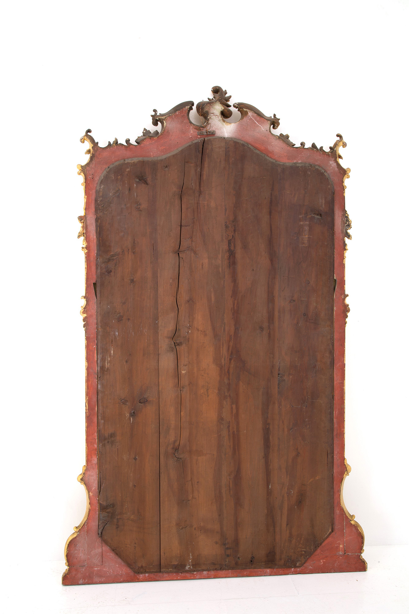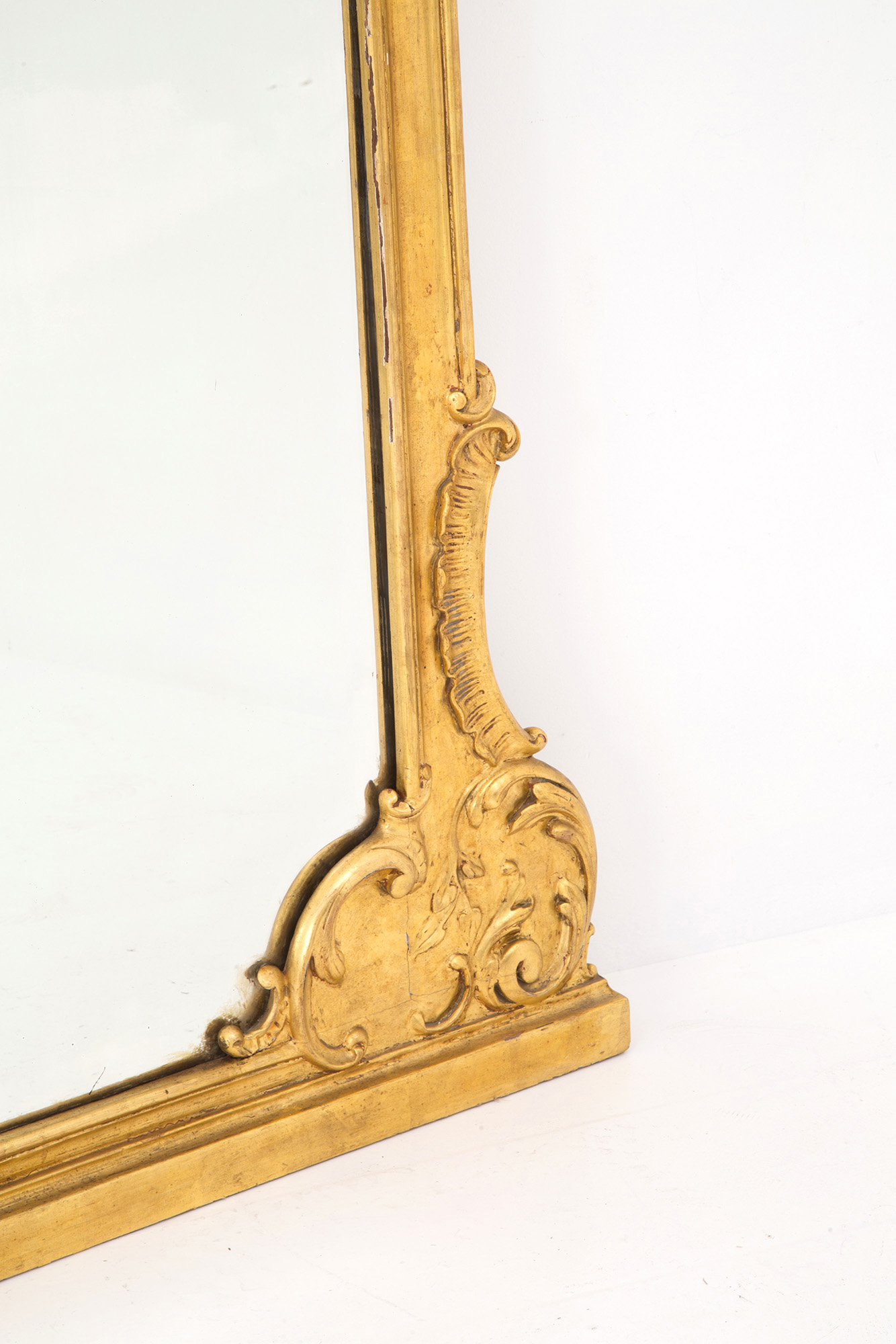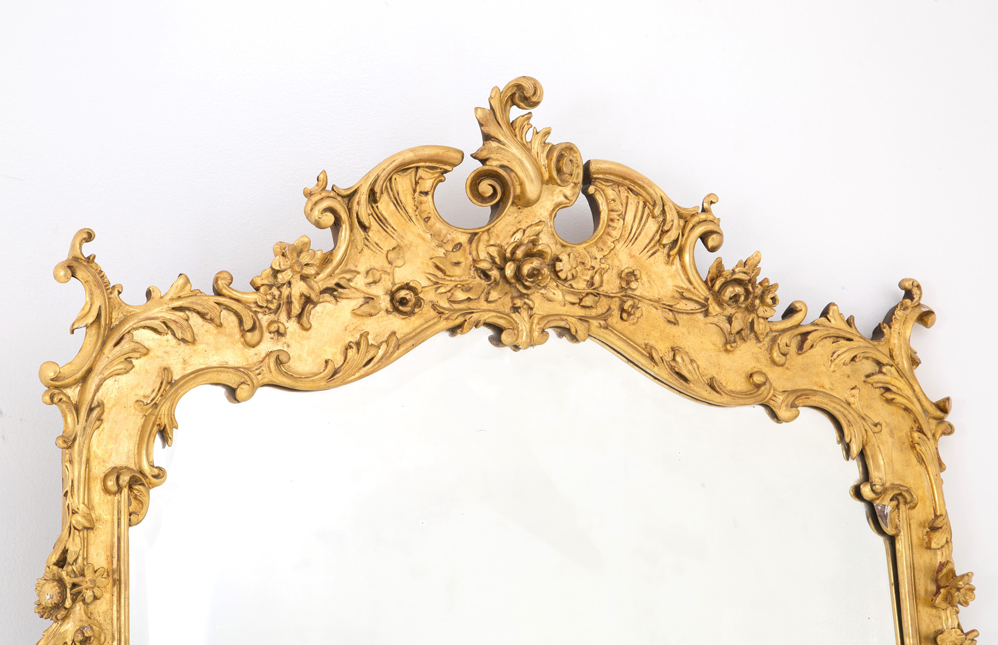 Scrolled mirror in carved and gilded wood. Late 19th century. Minor defects. 220x120 cm approx. Specchiera a volute in legno intagliato e dorato. Fine XIX secolo. Lievi difetti. 220x120 cm ca.
