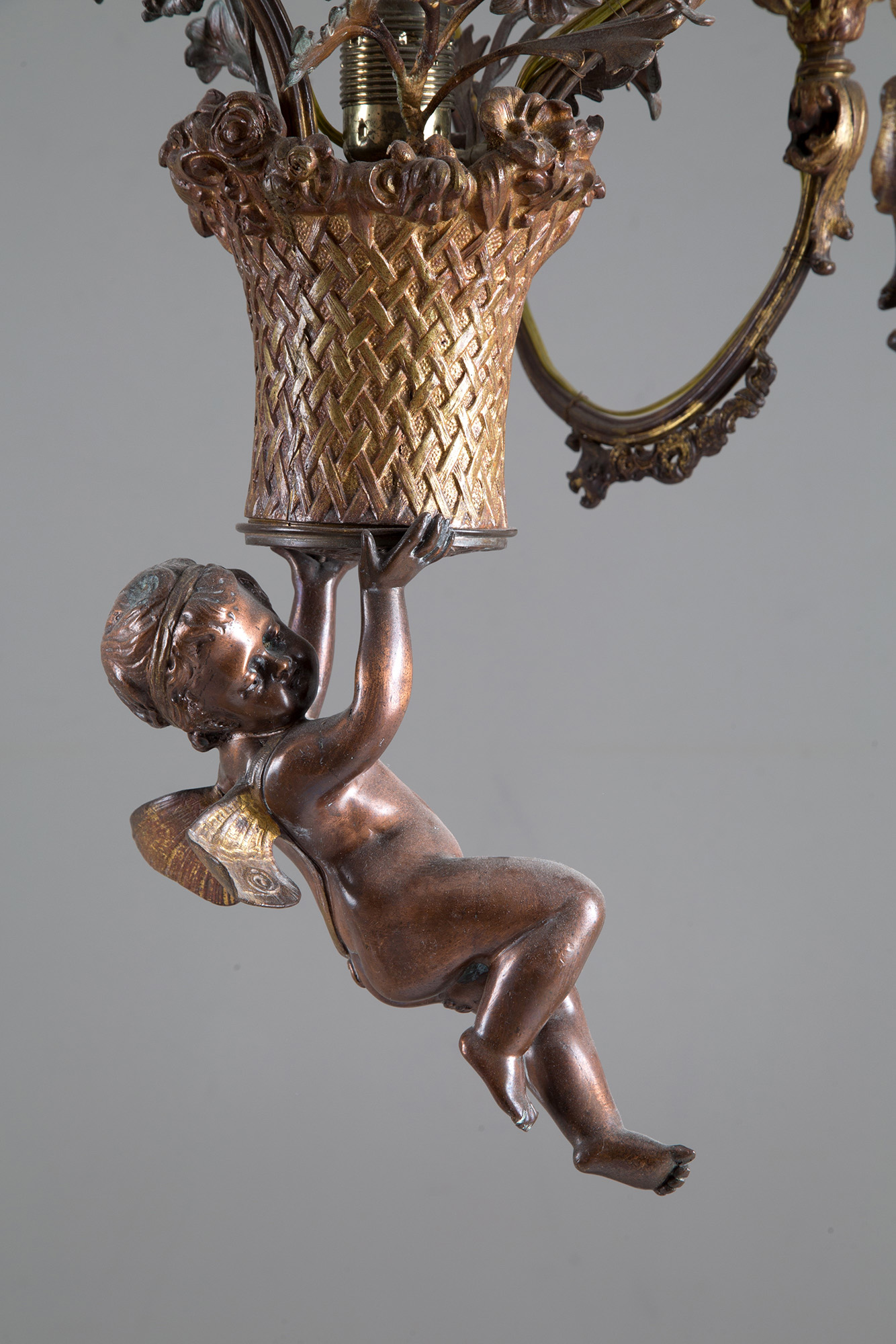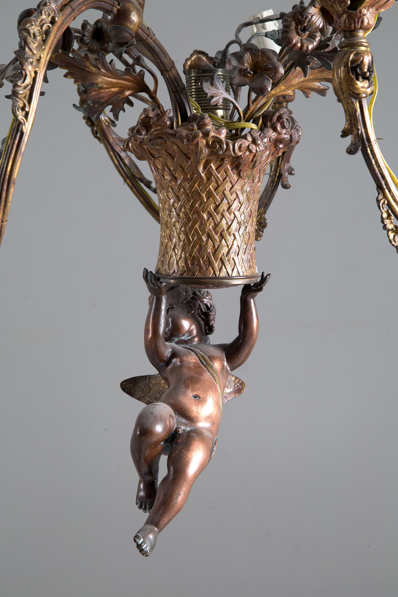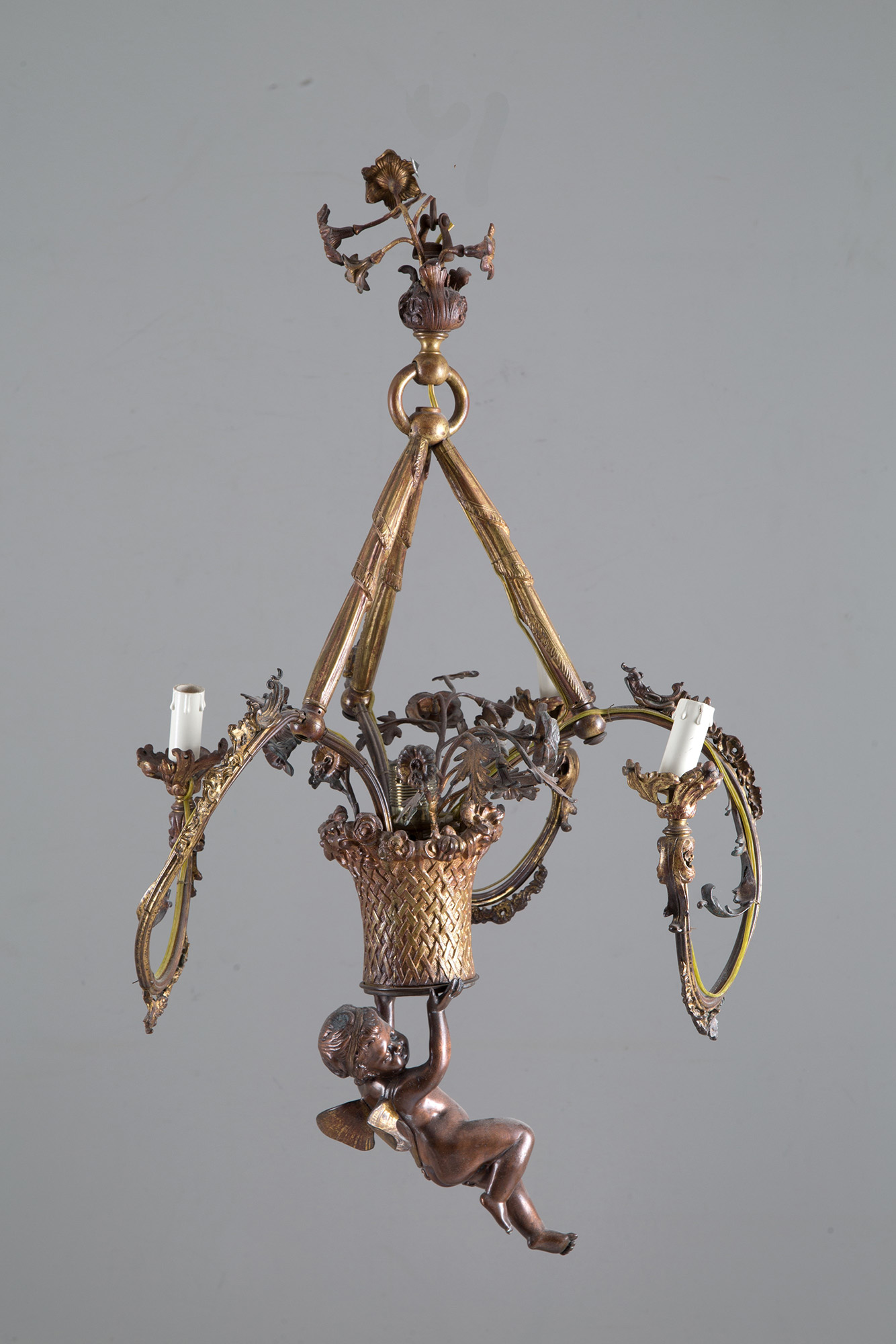 Three-light bronze chandelier highlighted in gold and patinated with a cherub hanging from a basket of flowers. Late 19th century. Defects. 90x60 cm approx. Lampadario tre luci in bronzo lumeggiato in oro e patinato con cherubino appeso ad una cesta di fiori. Fine XIX secolo. Difetti. 90x60 cm ca.