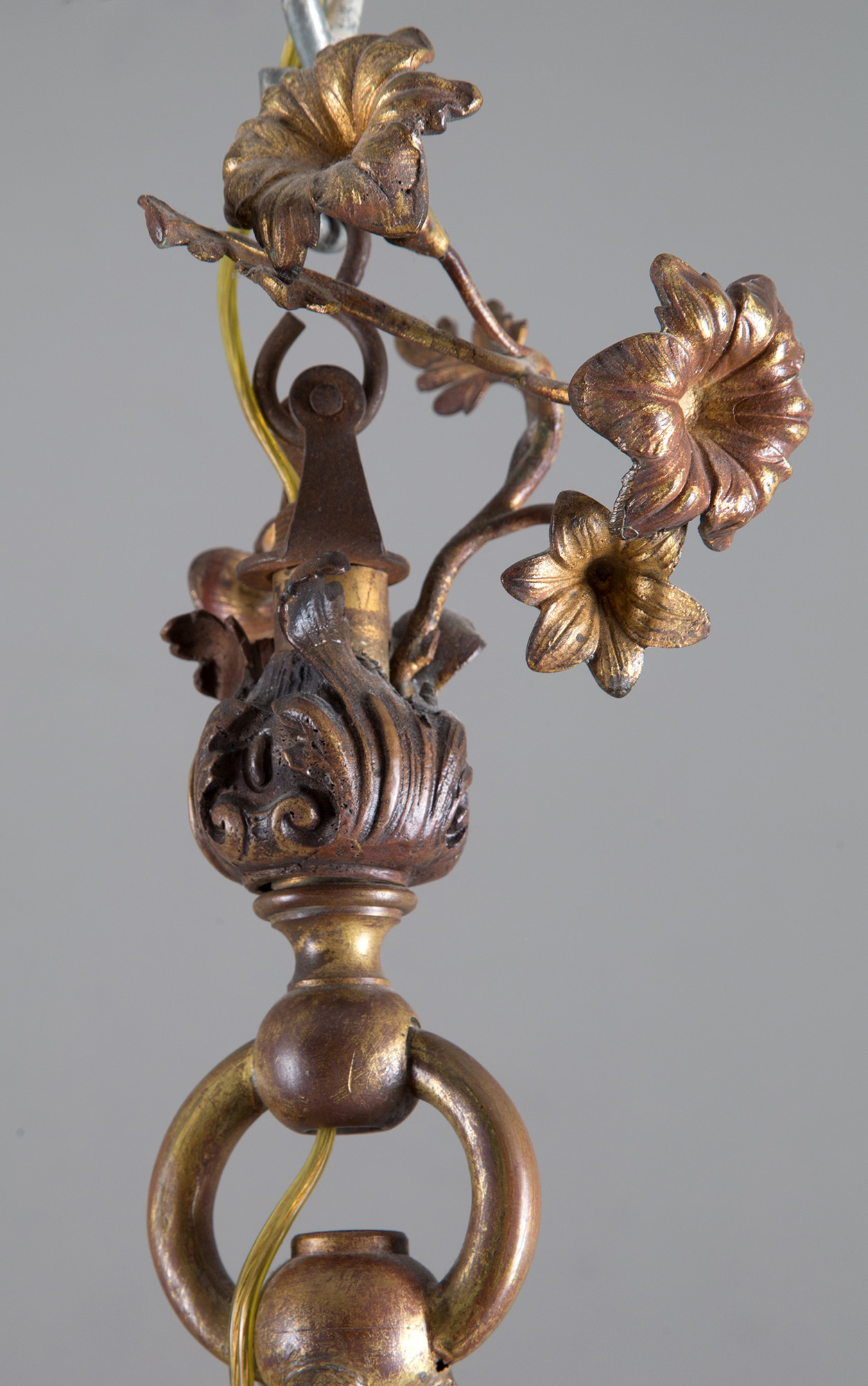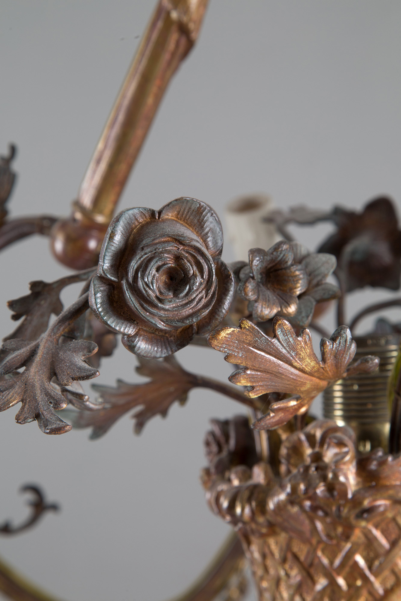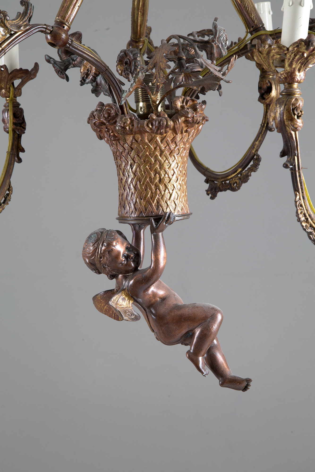 Three-light bronze chandelier highlighted in gold and patinated with a cherub hanging from a basket of flowers. Late 19th century. Defects. 90x60 cm approx. Lampadario tre luci in bronzo lumeggiato in oro e patinato con cherubino appeso ad una cesta di fiori. Fine XIX secolo. Difetti. 90x60 cm ca.