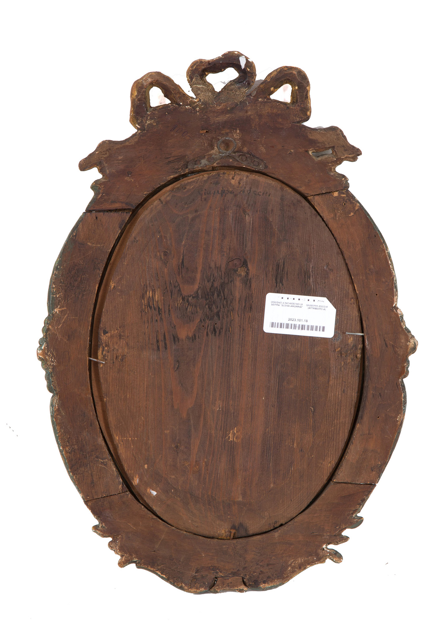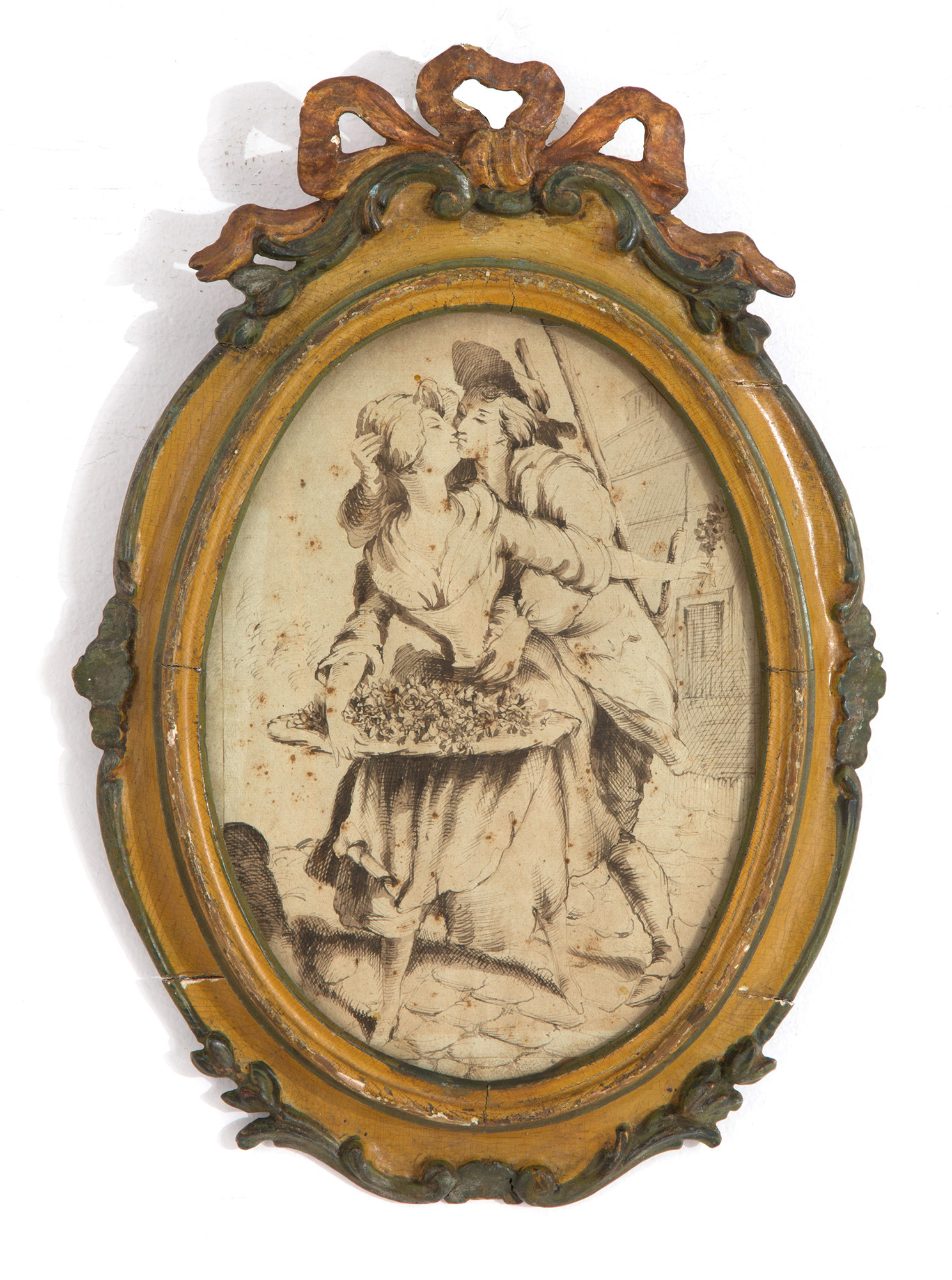 GIUSEPPE ZOCCHI (attr.)(Firenze 1711-1767). Sepia ink drawing on paper depicting "LOVE SCENE". Veneto. In carved, lacquered and painted wooden frame. 43x31 cm approx. GIUSEPPE ZOCCHI (attr.)(Firenze 1711-1767). Disegno a inchiostro di seppia su carta raffigurante "SCENA AMORINA". Veneto. In cornice in legno intagliata, laccata e dipinta. 43x31 cm ca.