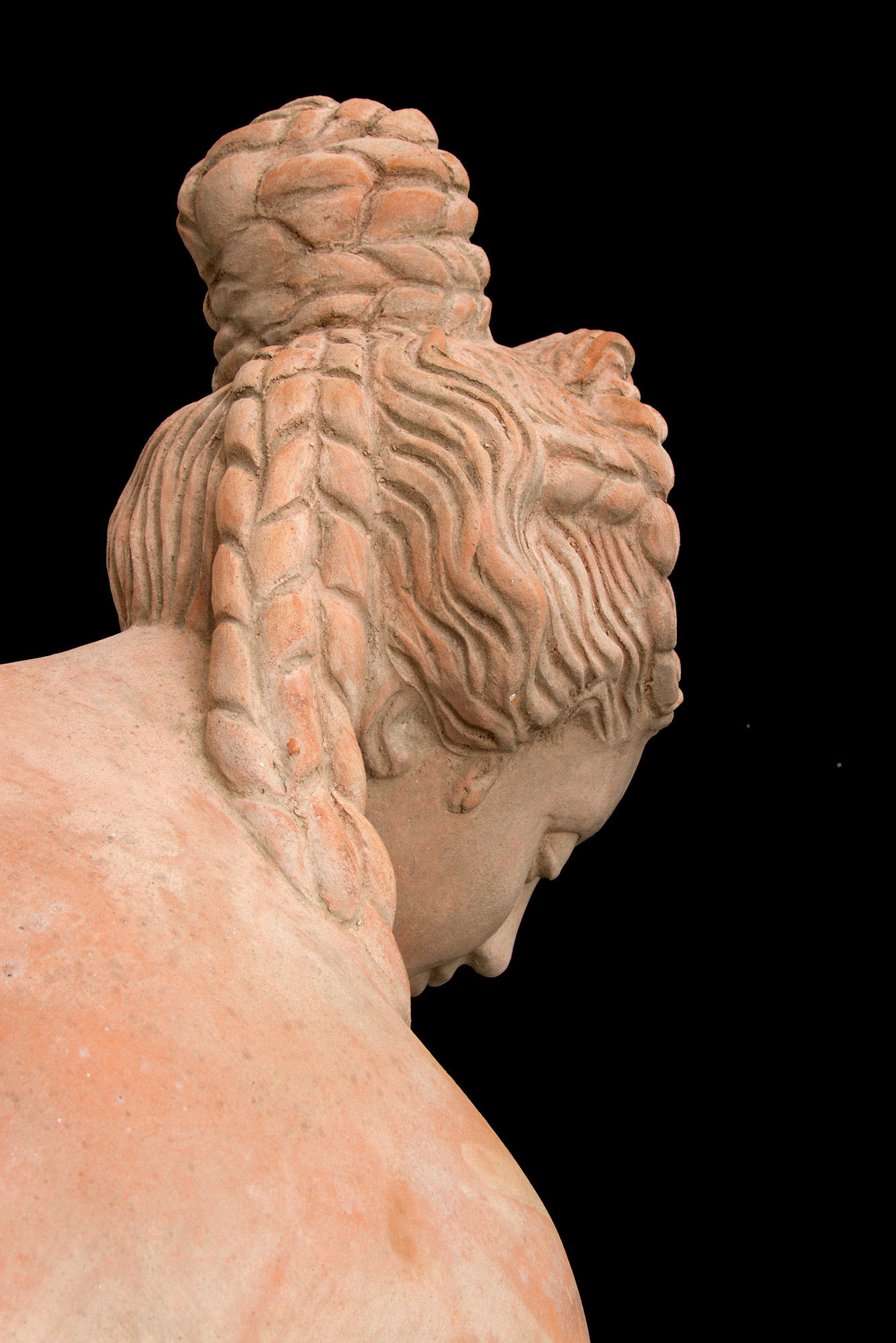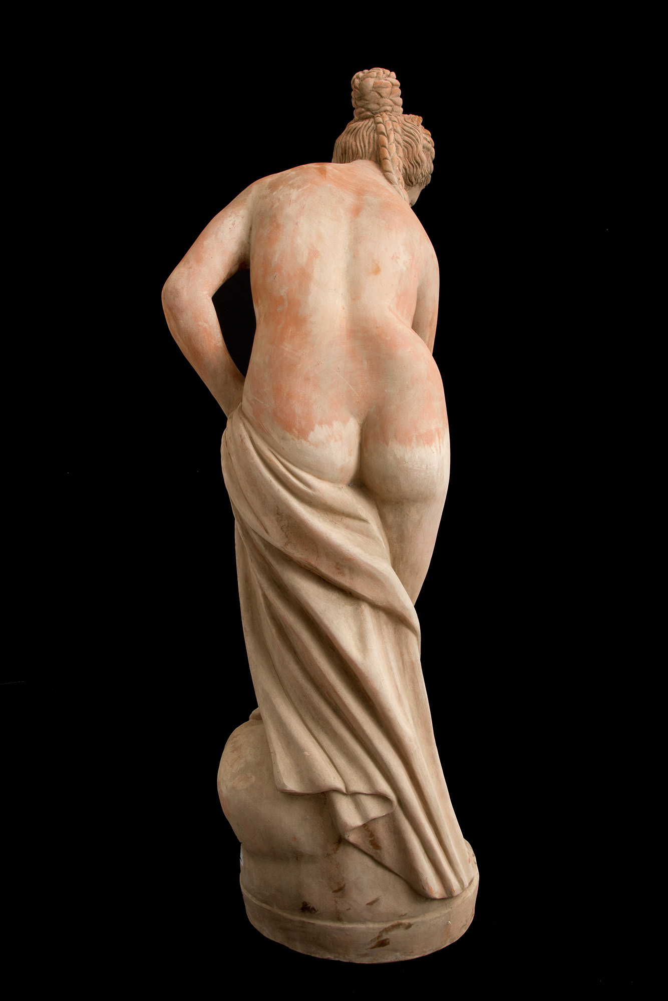 Terracotta sculpture depicting "VENUS AT THE BATH". Early 20th century. Signs of wear over time. 147x65x45 cm approx. Scultura in terracotta raffigurante "VENERE AL BAGNO". Inizi XX secolo. Segni di usura del tempo. 147x65x45 cm ca.