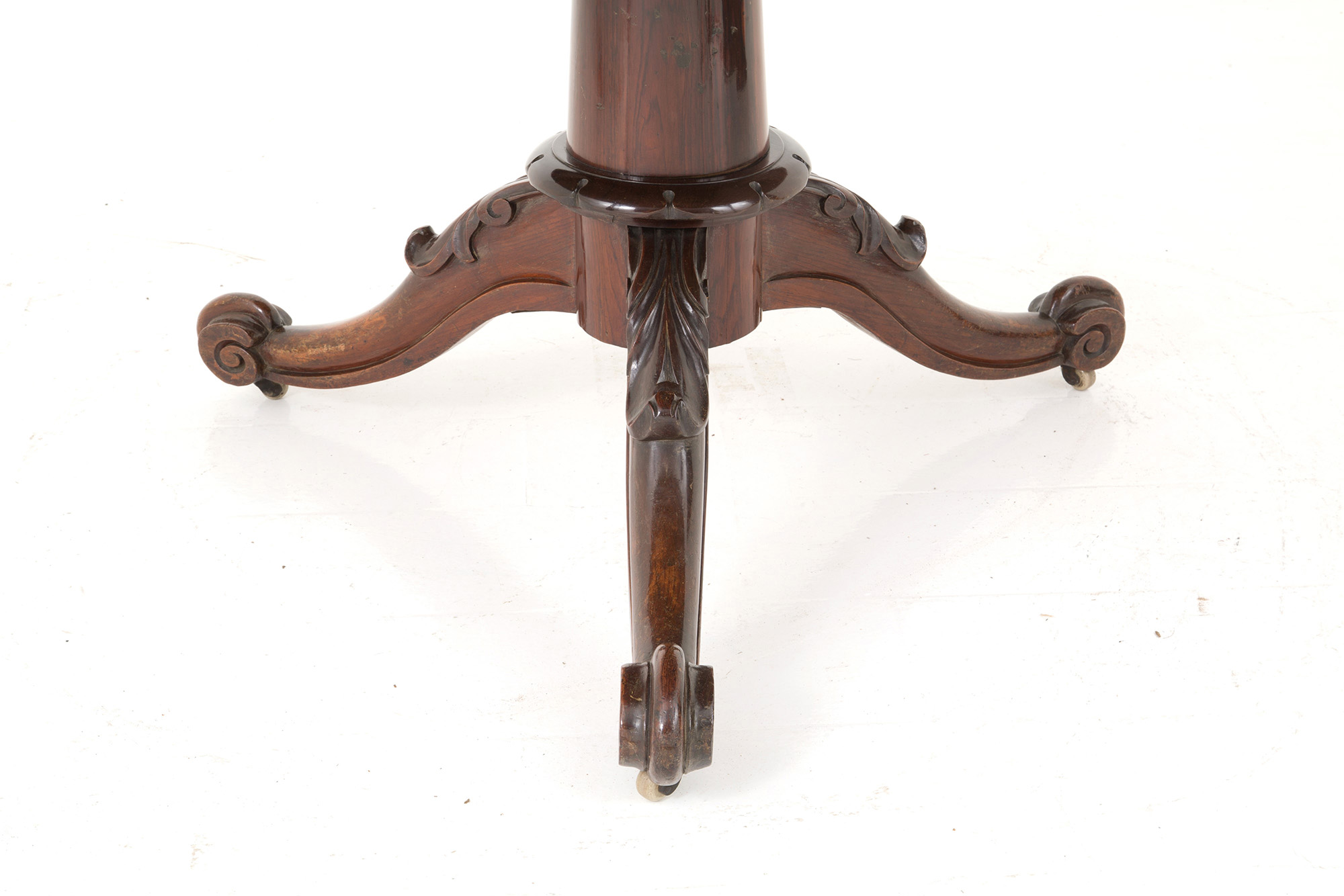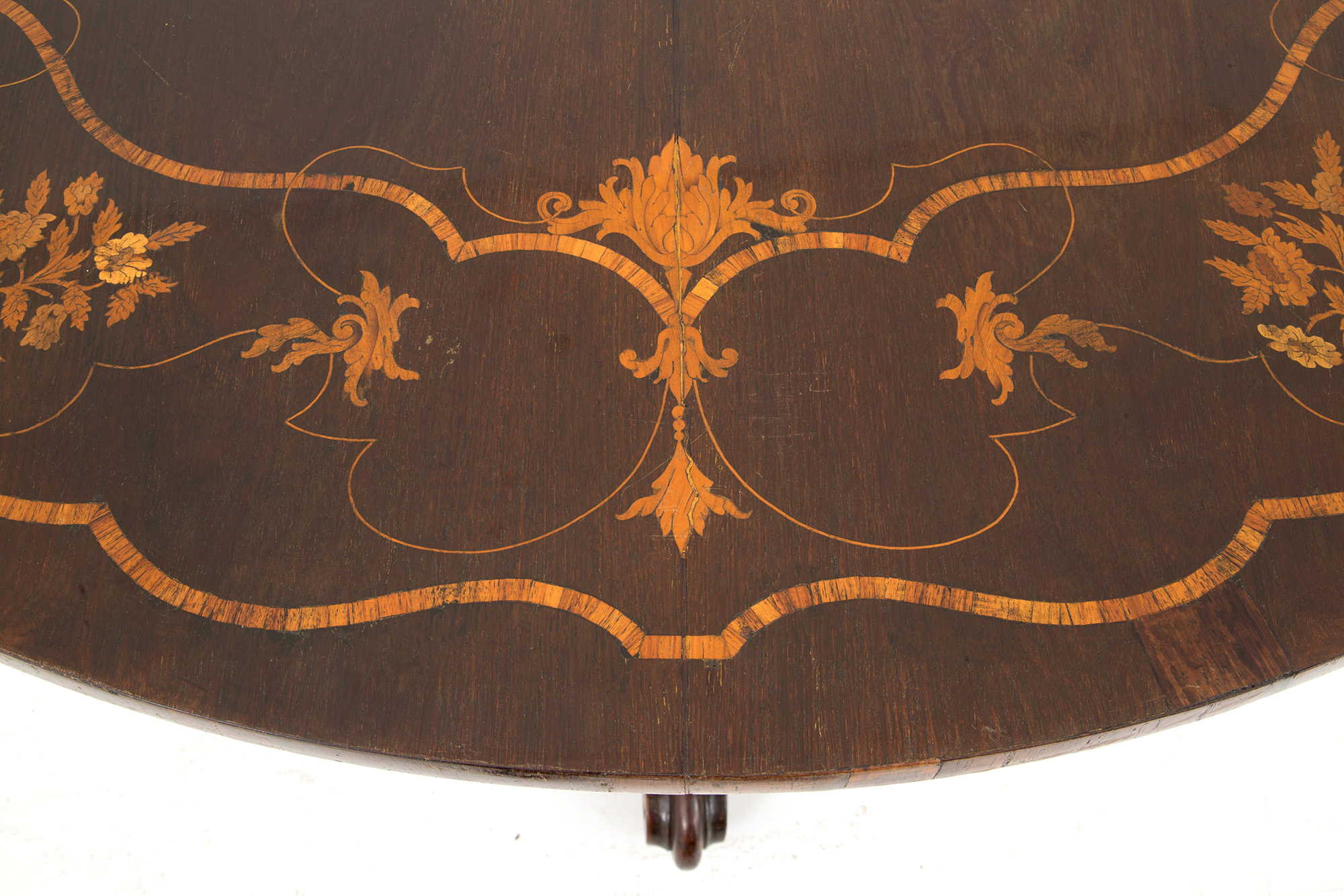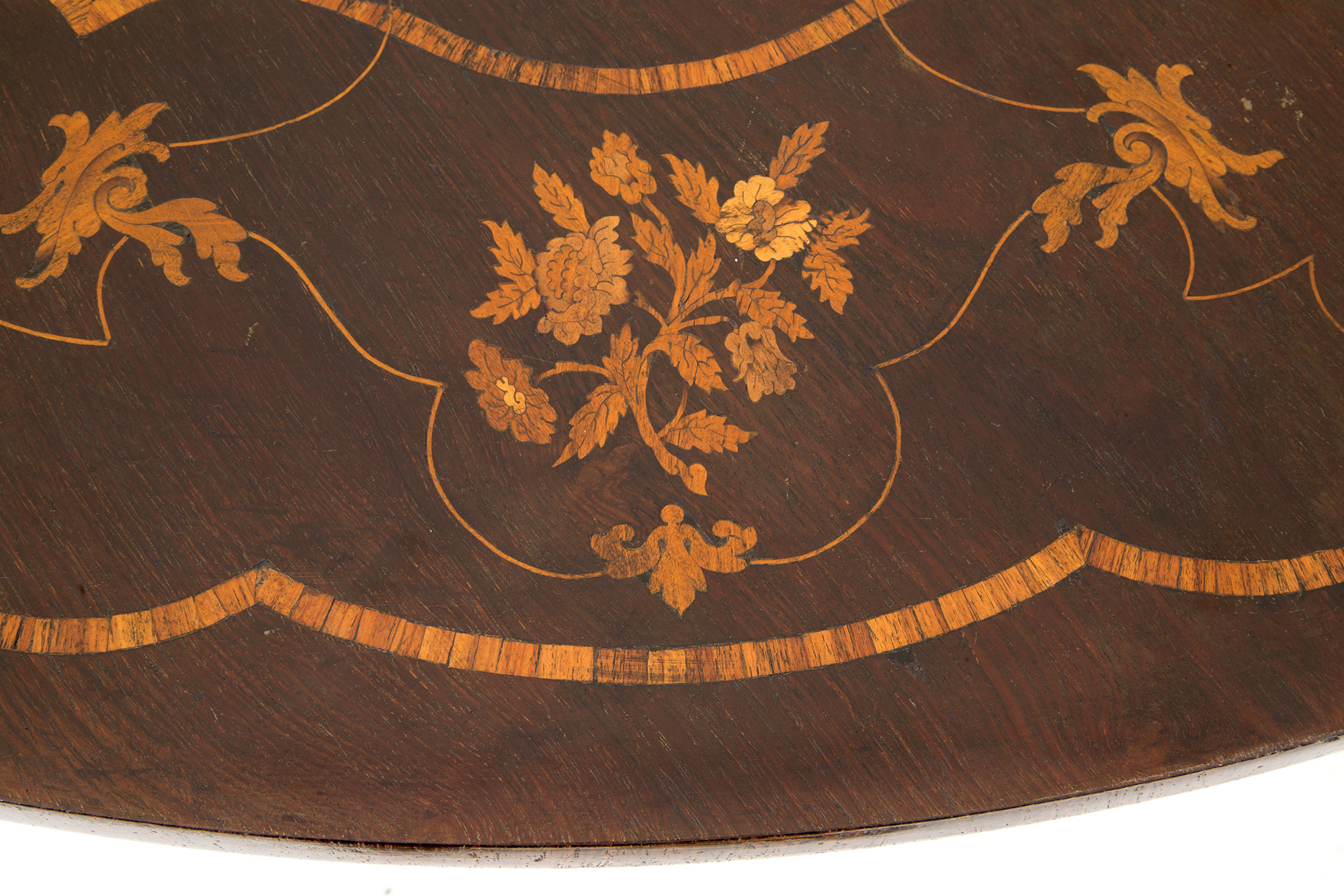 Round table veneered in various woods with top inlaid with floral motifs on tripod column with wheels. England. 19th century. 78x130 cm approx. Tavolo rotondo lastronato in legni vari con piano intarsiato a motivi floreali su colonna tripode con rotelle. Inghilterra. XIX secolo. 78x130 cm ca.