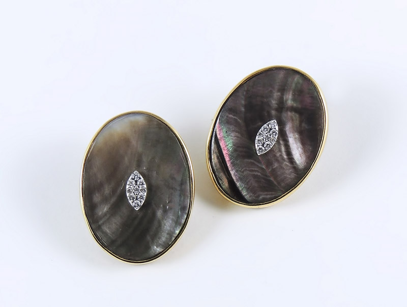 PAIO DI ORECCHINI IN ORO GIALLO, MADREPERLA E DIAMANTI - GOLD, MOTHER OF PEARL AND DIAMOND EARRINGS ciascuno di forma ovale, rivestito in madreperla impreziosito al centro da losanga in brillanti gr 17,9