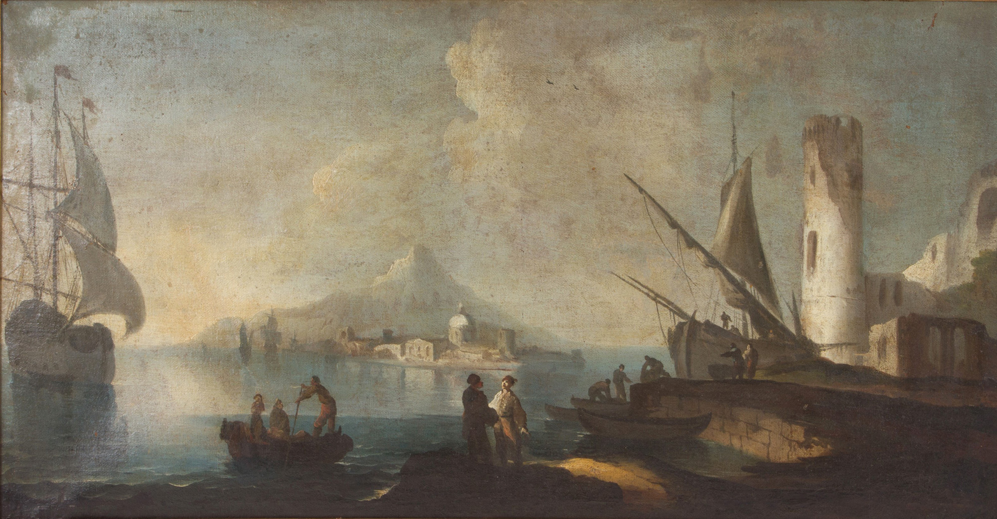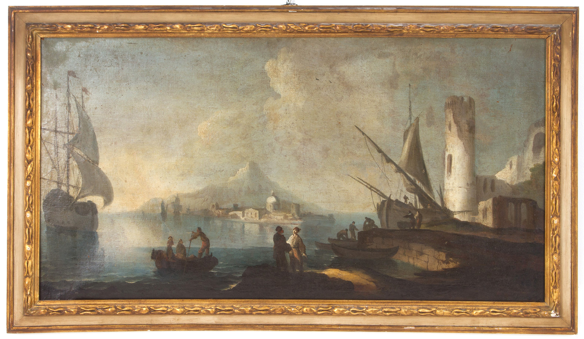 VENETIAN SCHOOL OF THE 18TH CENTURY. Oil painting on canvas depicting "MARINA WITH CHARACTERS". In frame. Already reframed. Defects. 63x122 cm approx. SCUOLA VENETA DEL XVIII SECOLO. Dipinto olio su tela raffigurante "MARINA CON PERSONAGGI". In cornice. Gia' rintelaiato. Difetti. 63x122 cm ca.