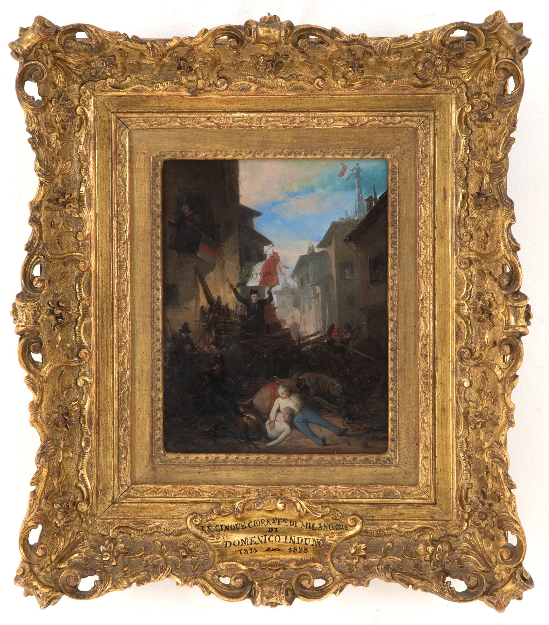 DOMENICO INDUNO (Milano 1815-1878). Oil painting on cardboard depicting "THE FIVE DAYS OF MILAN IN 1848". In frame. With attribution letter signed by Dr. Giorgio Nicodemi dated 11.19.1963. 24x19cm approx. DOMENICO INDUNO (Milano 1815-1878). Dipinto olio su cartone raffigurante "LE CINQUE GIORNATE DI MILANO NEL 1848". In cornice. Con lettera di attribuzione firmata dal Dott. Giorgio Nicodemi del 19.11.1963. 24x19 cm ca.