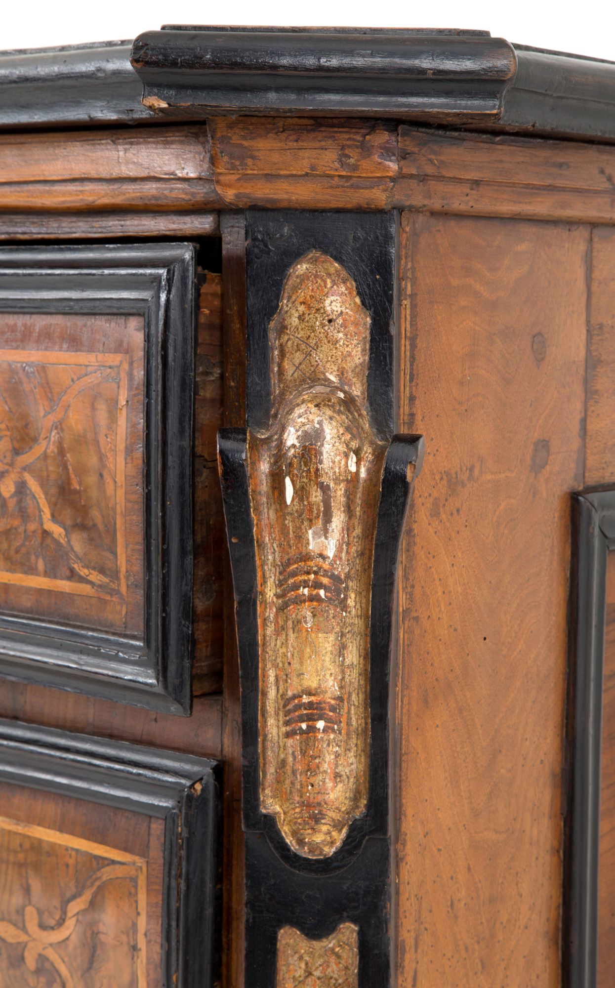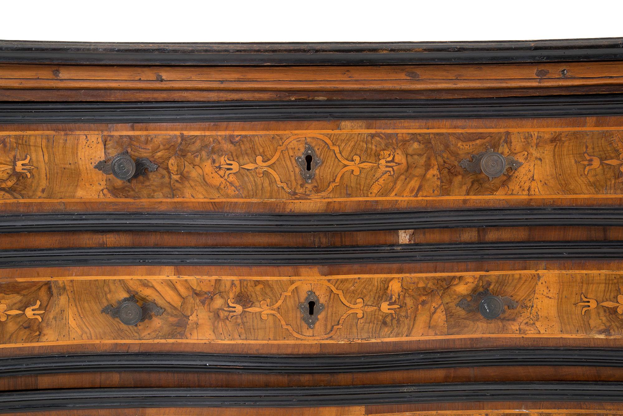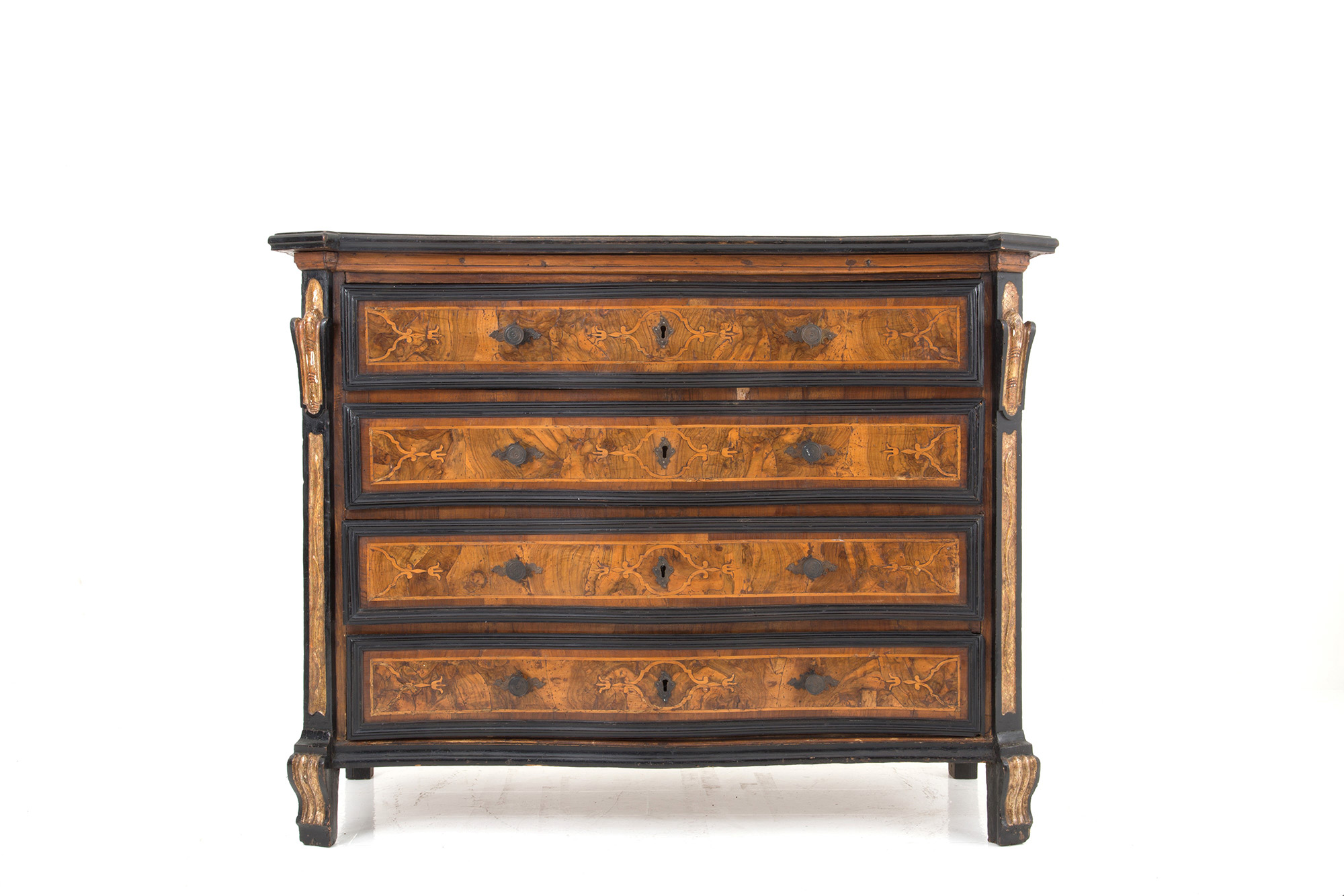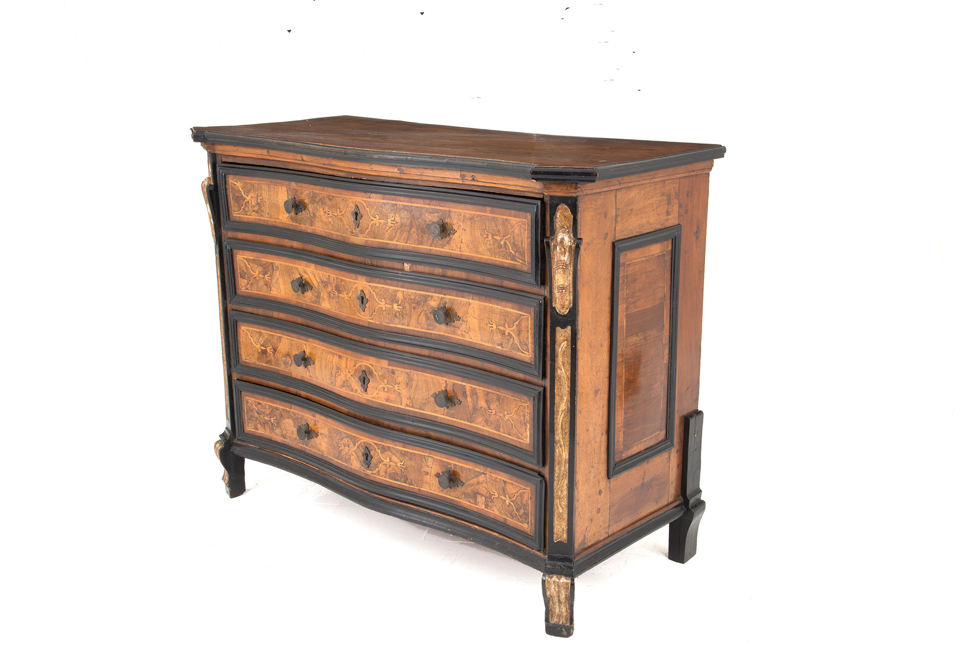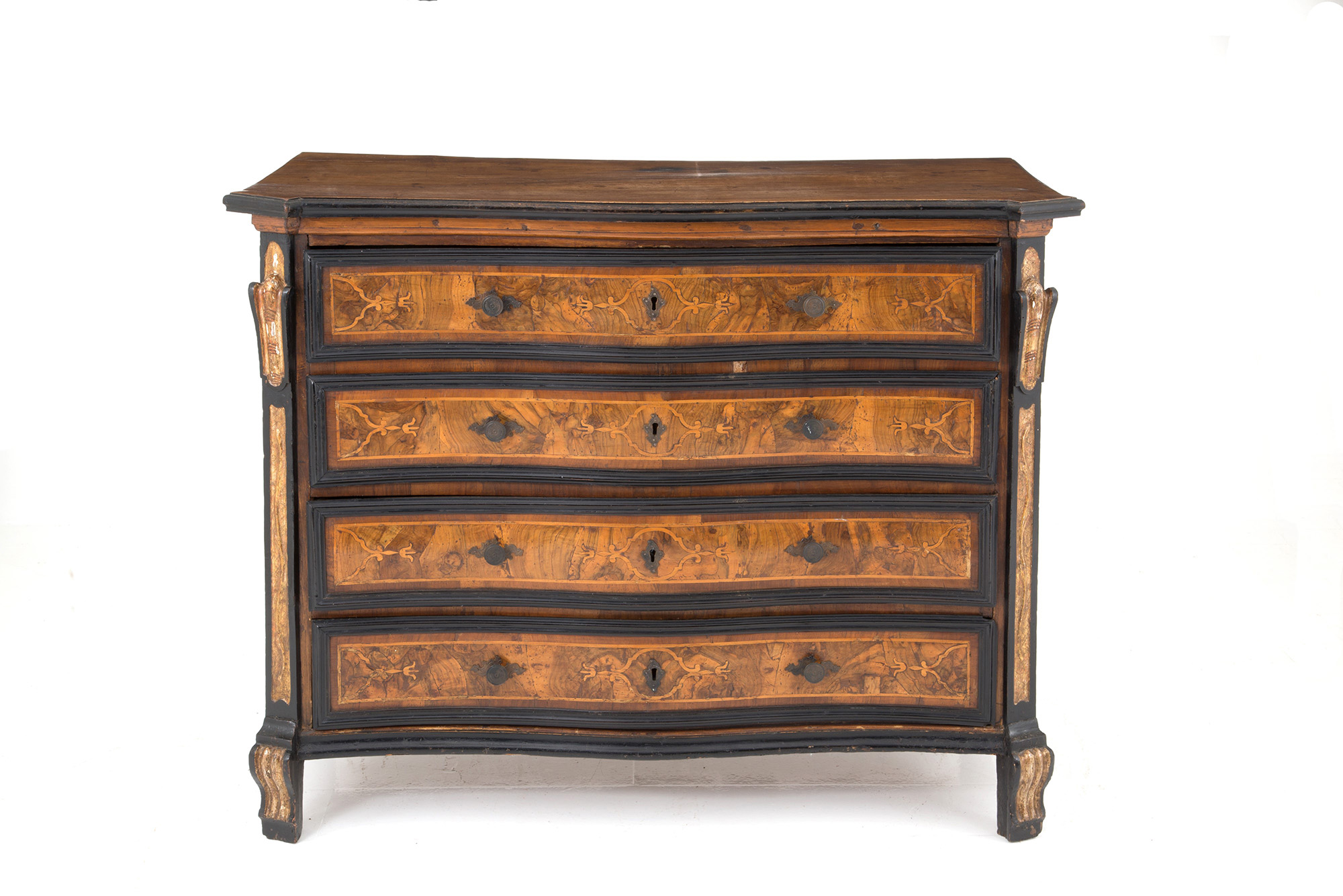 Chest of drawers with a wavy front, veneered in walnut and inlaid in light woods with gilded and ebonized finishes and four drawers. Lombardy. 17th century. Defects. 111x142x62 cm approx. Canterano a fronte mosso lastronato in noce e intarsiato in legni chiari con finiture dorate ed ebanizzate e quattro cassetti. Lombardia. XVII secolo. Difetti. 111x142x62 cm ca.