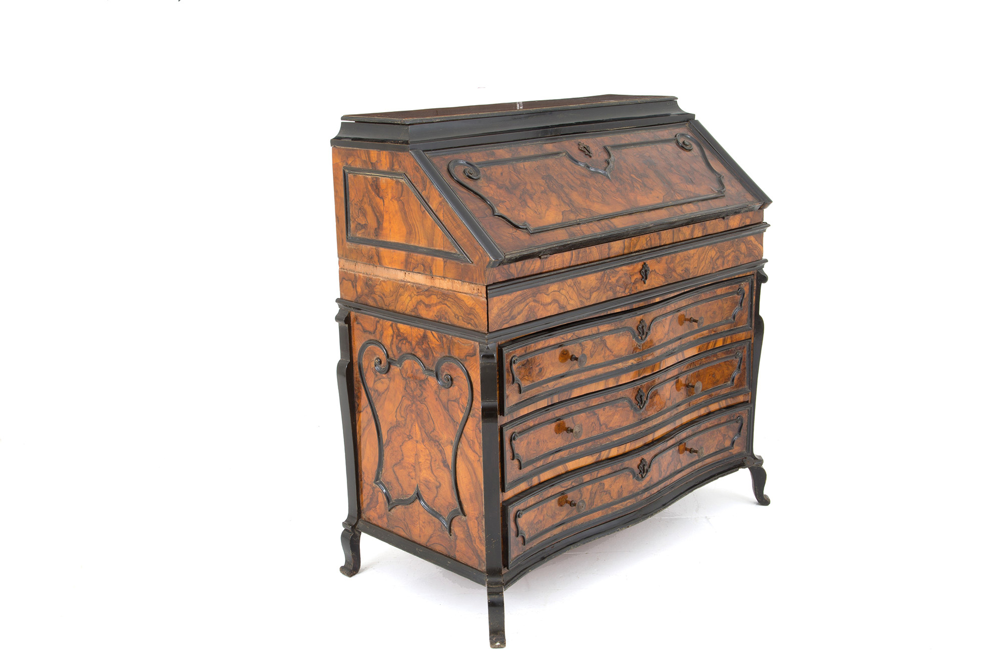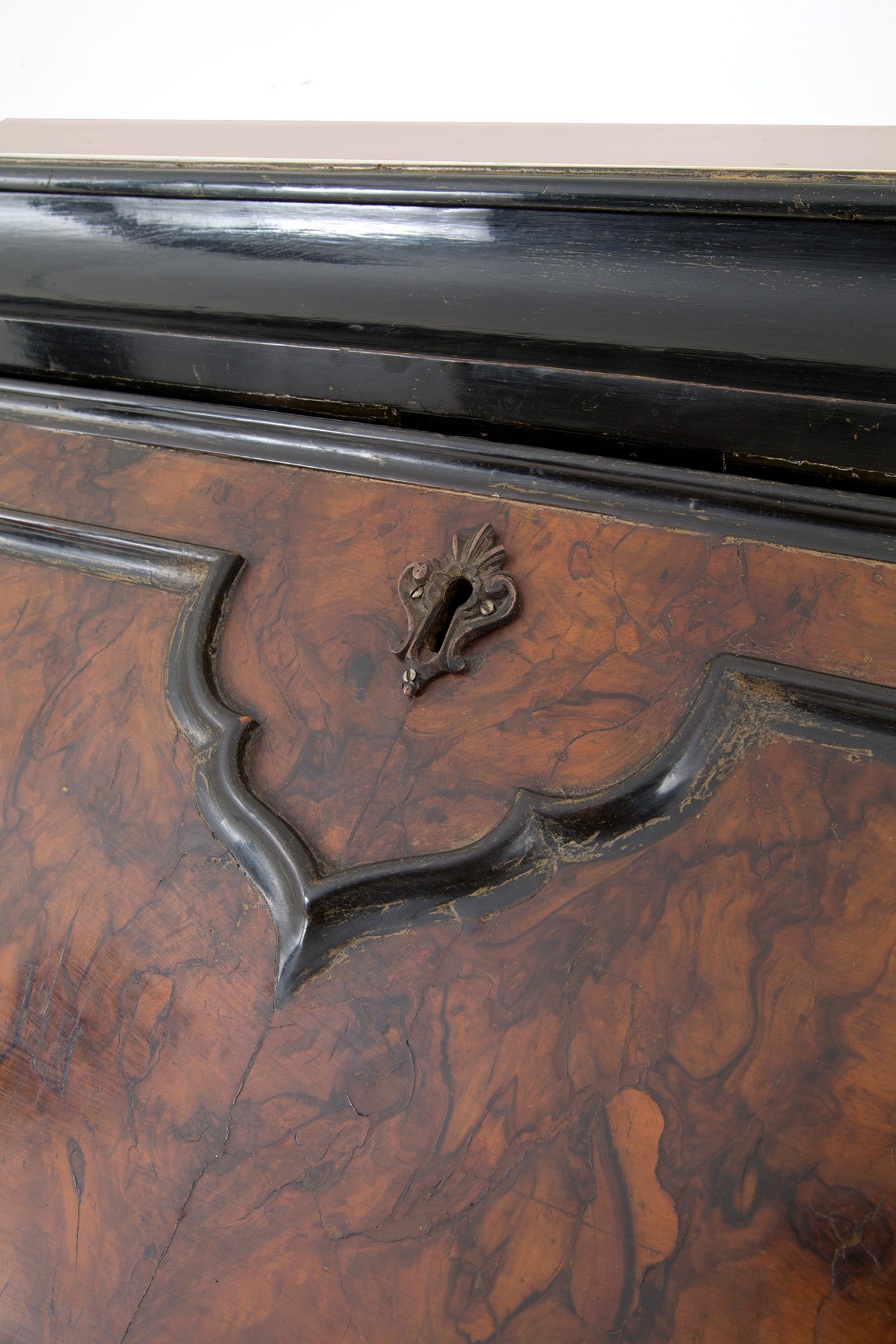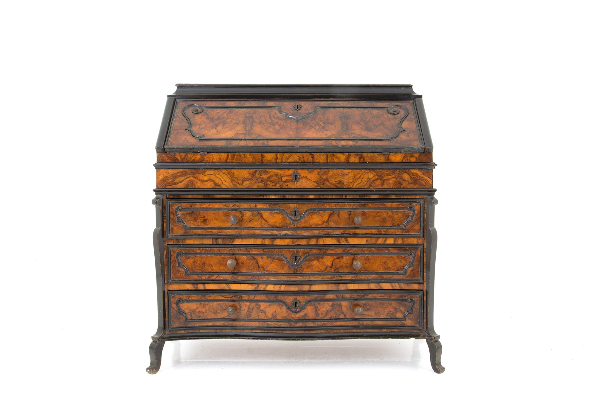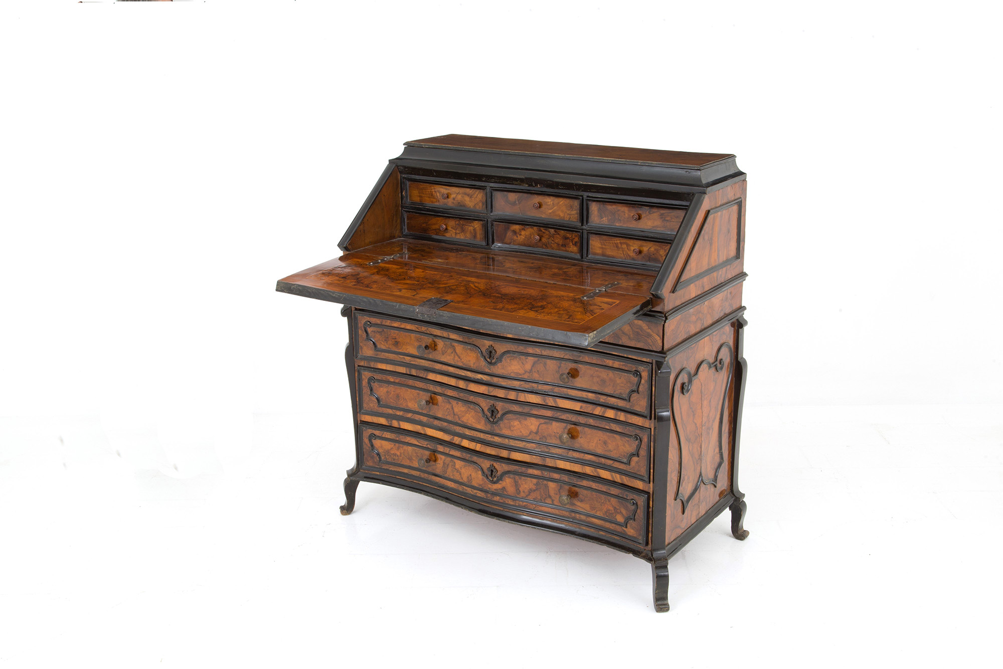 Veneered flap cabinet in walnut root with ebonized profiles, wavy front with three drawers and a flap. Lombardy. Early 17th century. 112x105x50 cm approx. Ribalta latronata in radica di noce con profili ebanizzati, fronte mosso a tre cassetti e calatoia. Lombardia. Inizi XVII secolo. 112x105x50 cm ca.