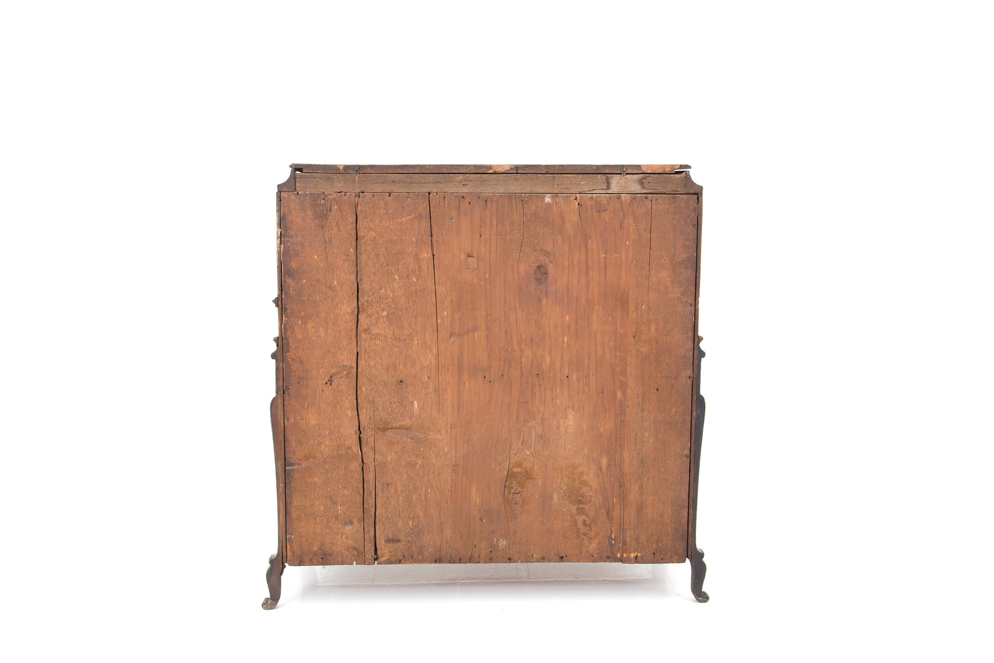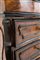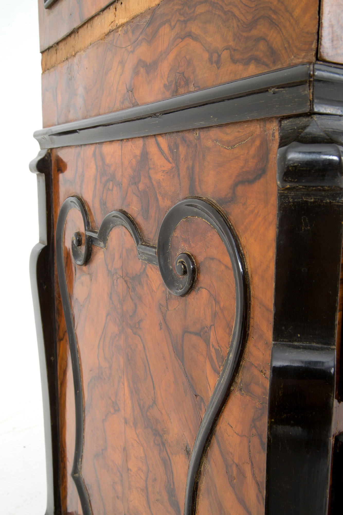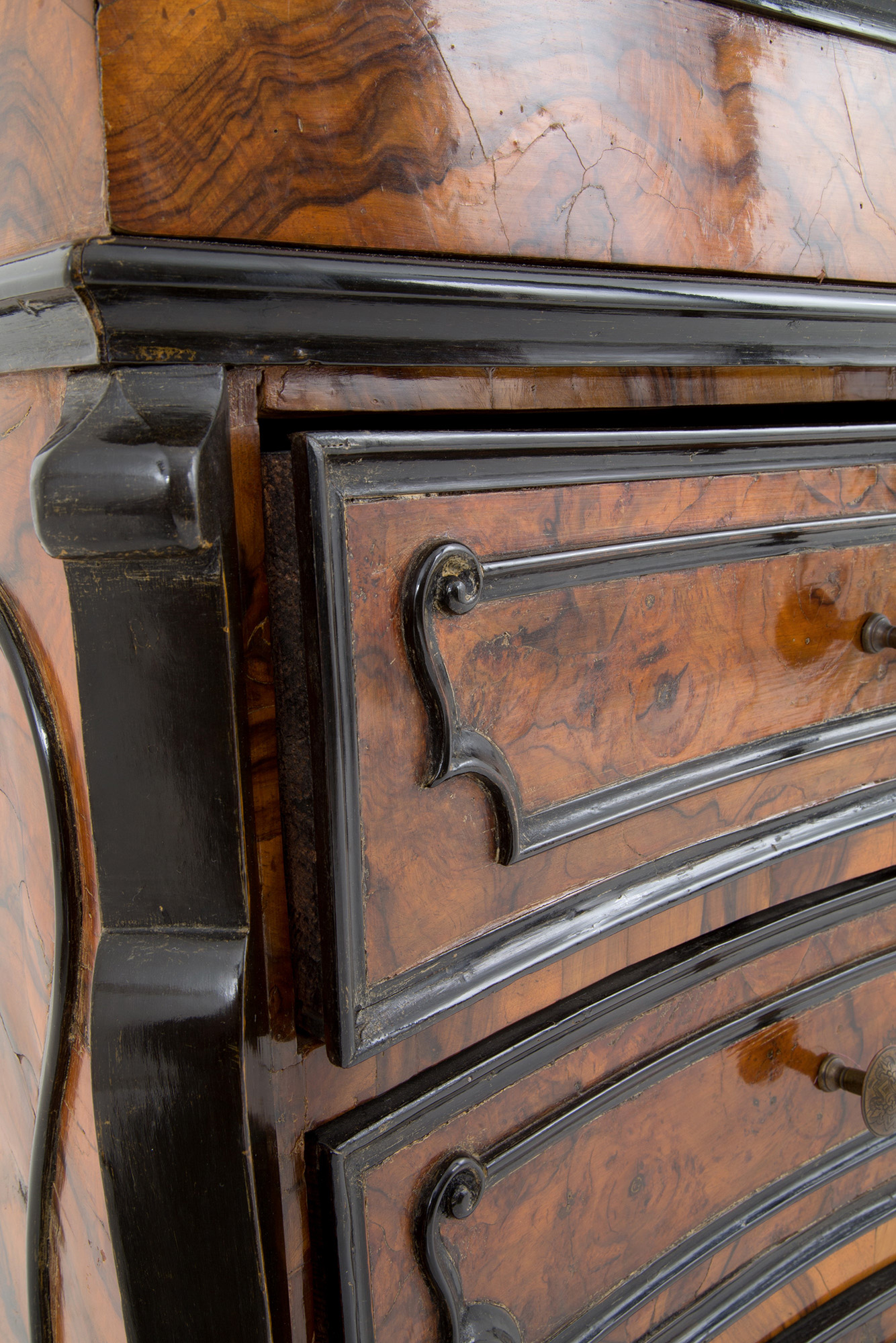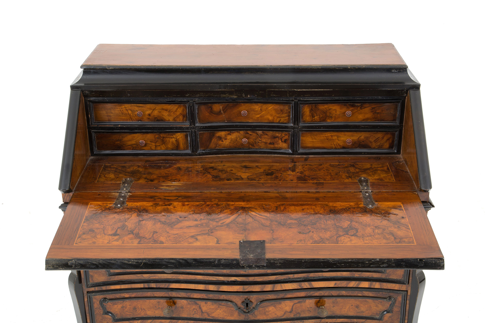 Veneered flap cabinet in walnut root with ebonized profiles, wavy front with three drawers and a flap. Lombardy. Early 17th century. 112x105x50 cm approx. Ribalta latronata in radica di noce con profili ebanizzati, fronte mosso a tre cassetti e calatoia. Lombardia. Inizi XVII secolo. 112x105x50 cm ca.