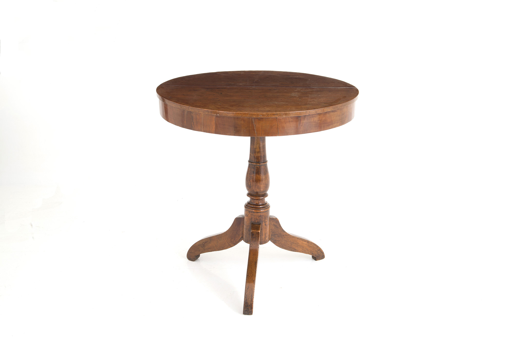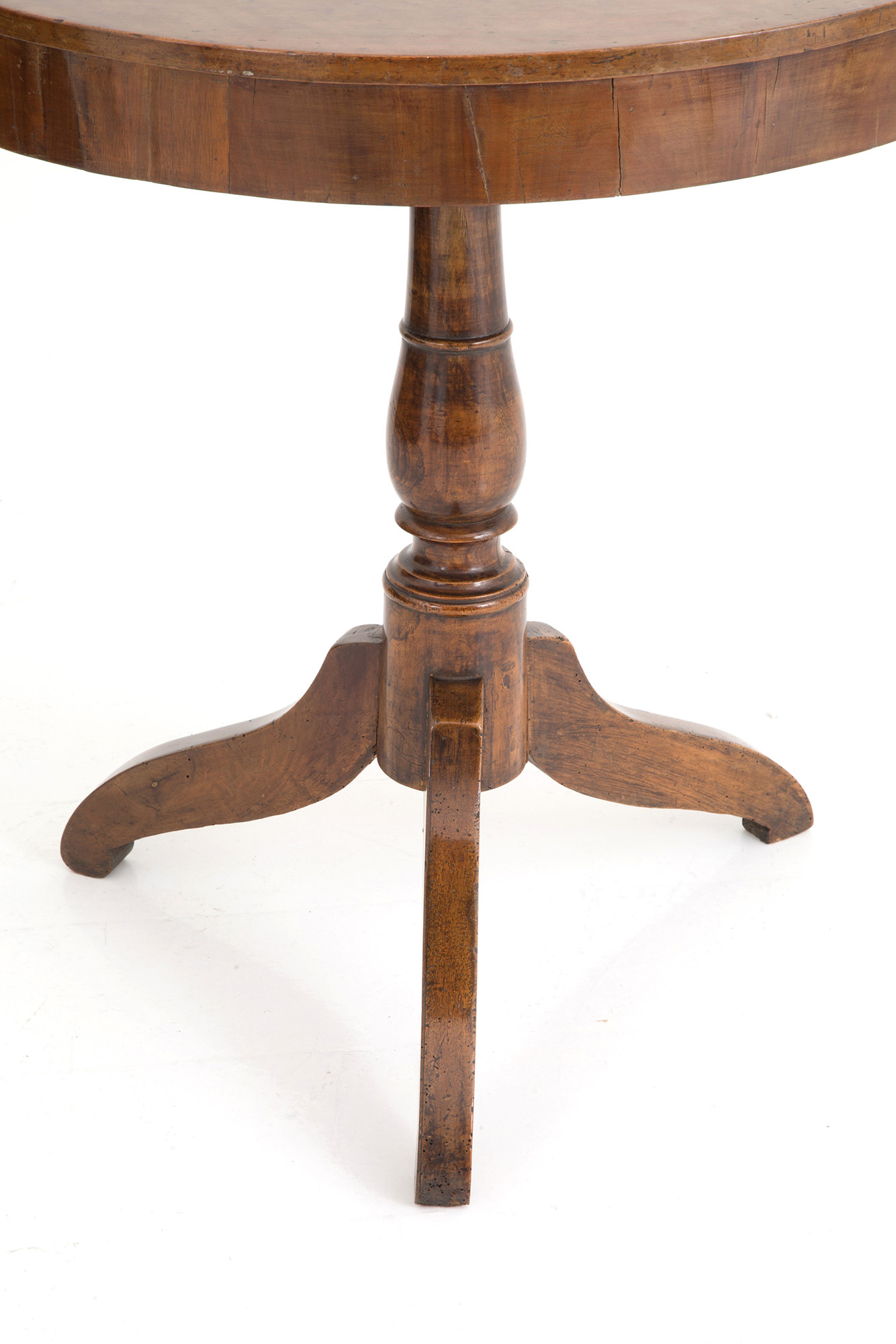 Round walnut veneered coffee table with turned tripod leg. Northern Italy. 19th century. 80x74 cm approx. Tavolino rotondo lastronato in noce con gamba tornita tripode. Italia settentrionale. XIX secolo. 80x74 cm ca.