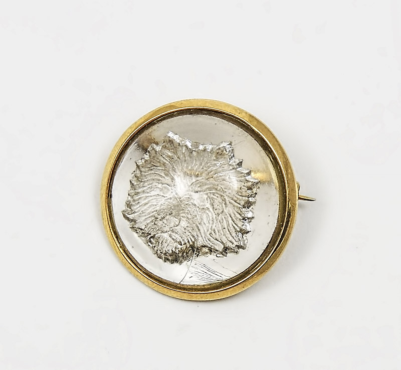 SPILLA CIRCOLARE IN ORO GIALLO E CRISTALLO - WHITE GOLD AND CRYSTAL BROOCH Anni Settanta - 70s al centro cristallo inciso con testa di cagnolino gr 6,6