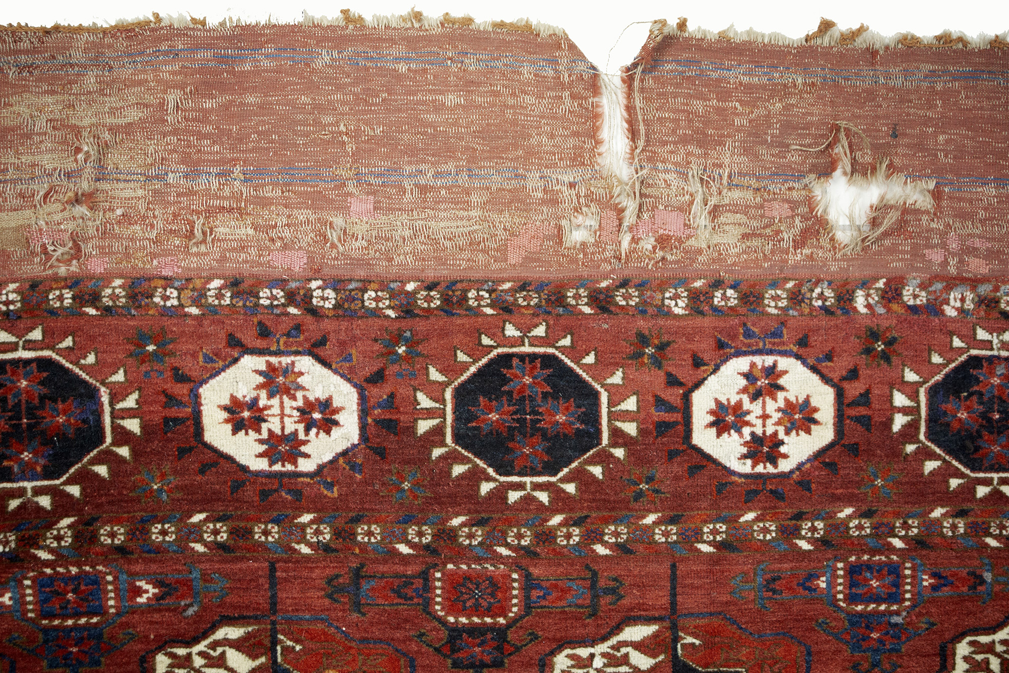 Tekke' main carpet. West Turkestan. Mid 19th century. Published in the catalog of the exhibition curated by James Cohen "Turkoman", 2011. Fleece carpet, small old restorations due to moths. 245x195 cm approx. Tekke' main carpet. Turkestan Occidentale. Meta' XIX secolo. Pubblicato nel catalogo della mostra curata da James Cohen "Turkoman", 2011. Tappeto in vello, piccoli vecchi restauri a causa della tarmatura. 245x195 cm ca.