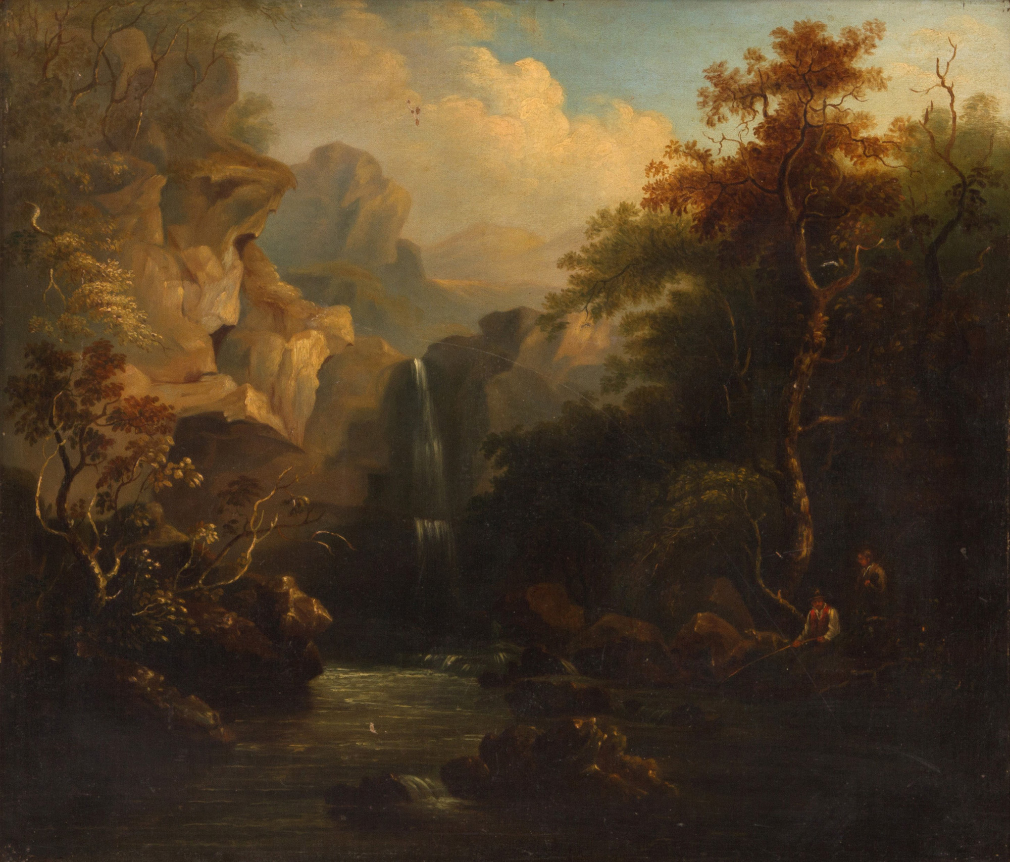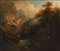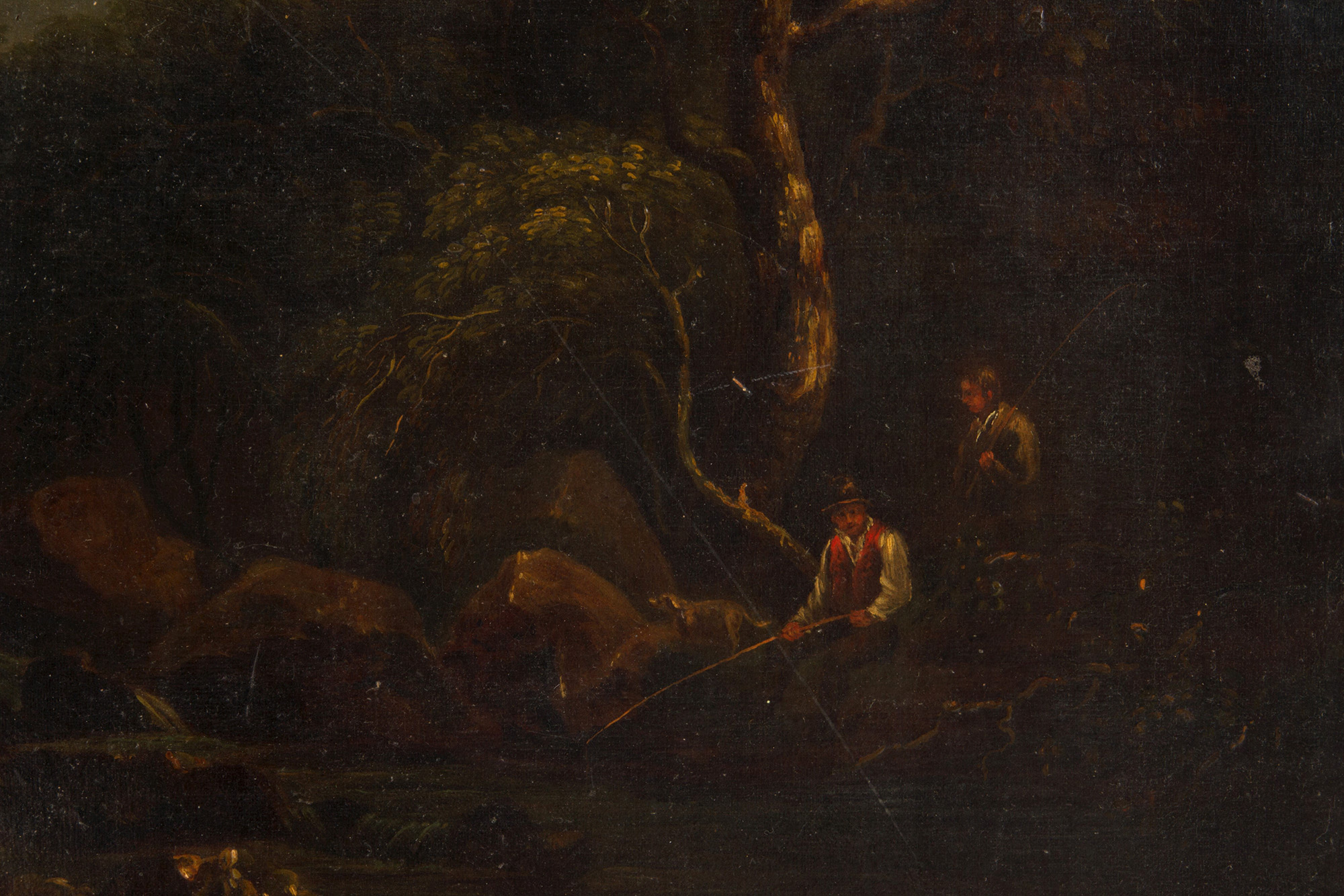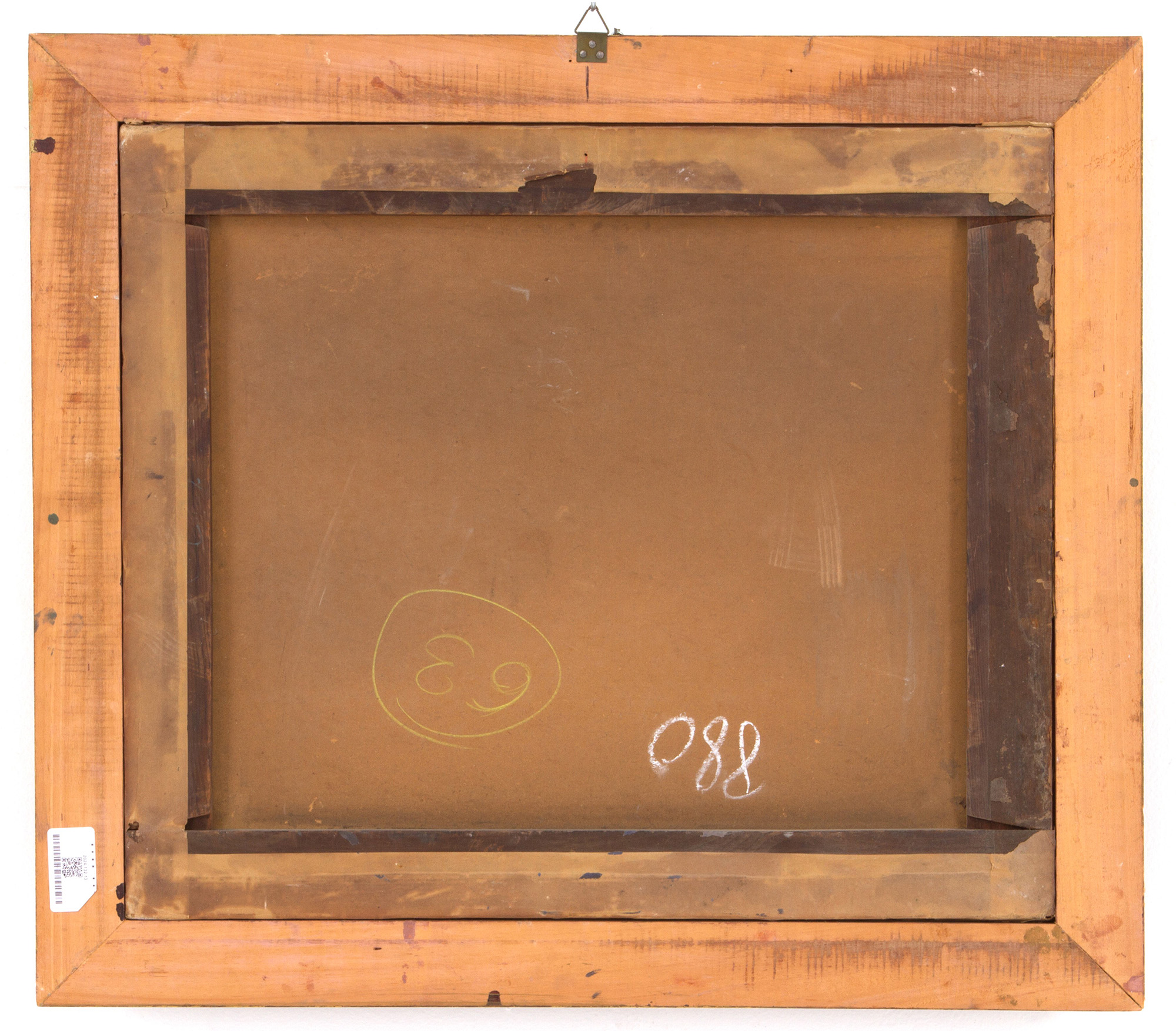 Oil painting on canvas applied on cardboard depicting "LANDSCAPE WITH FIGURES". 19th century. In frame. Defects. 54x63 cm approx. Dipinto olio su tela applicata su cartone raffigurante "PAESAGGIO CON FIGURE". XIX secolo. In cornice. Difetti. 54x63 cm ca.