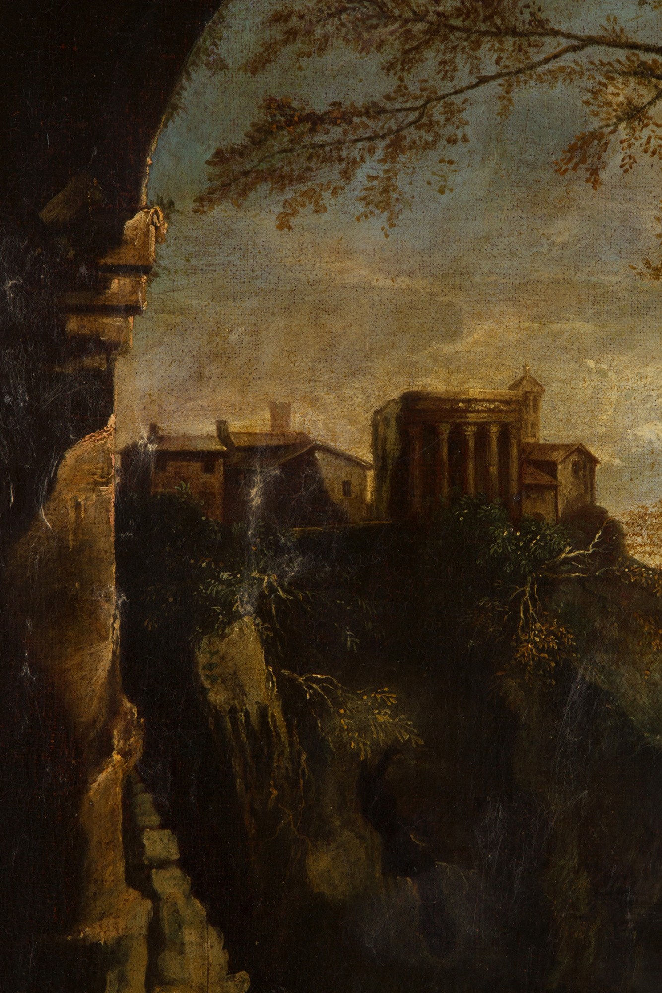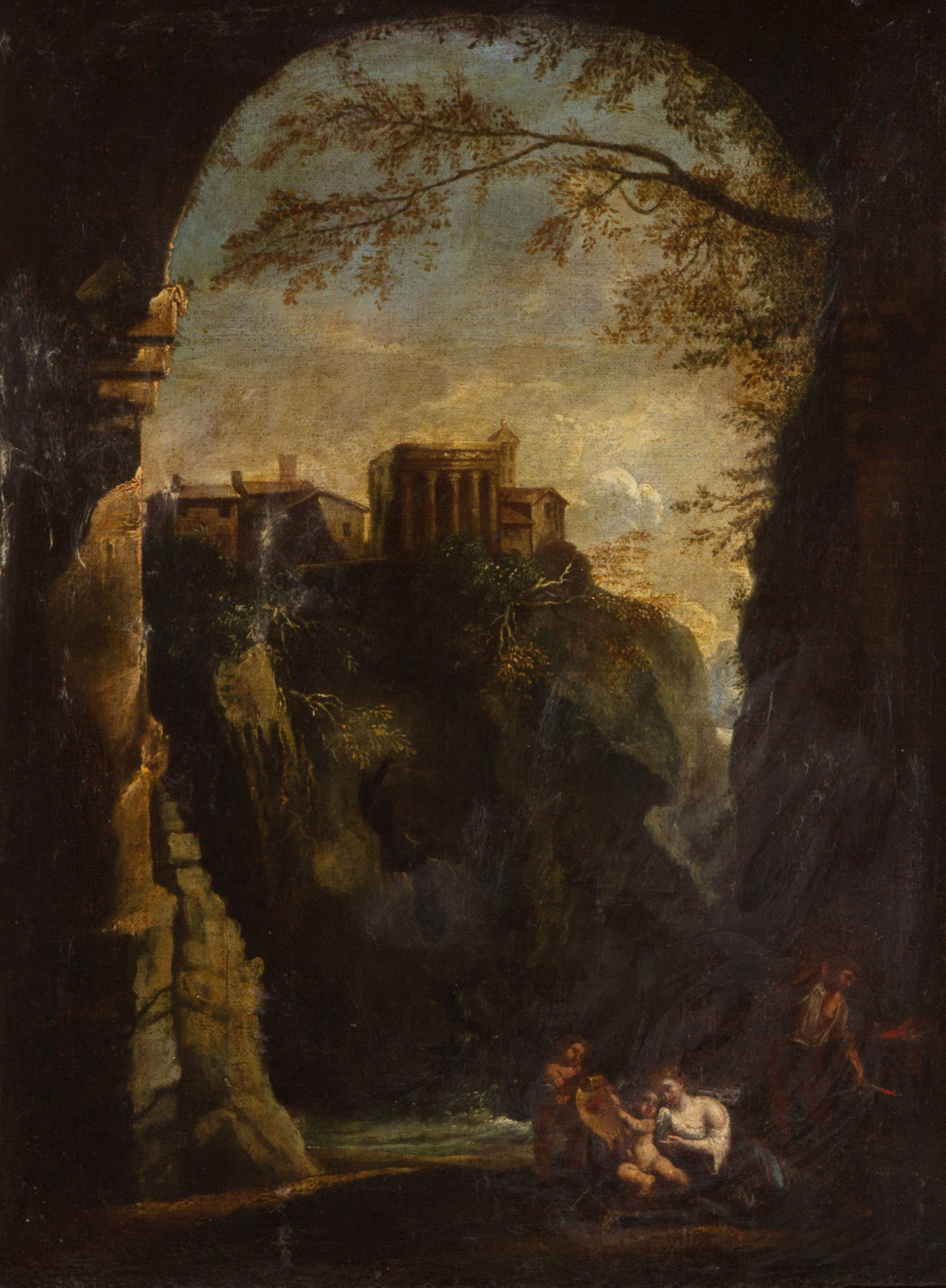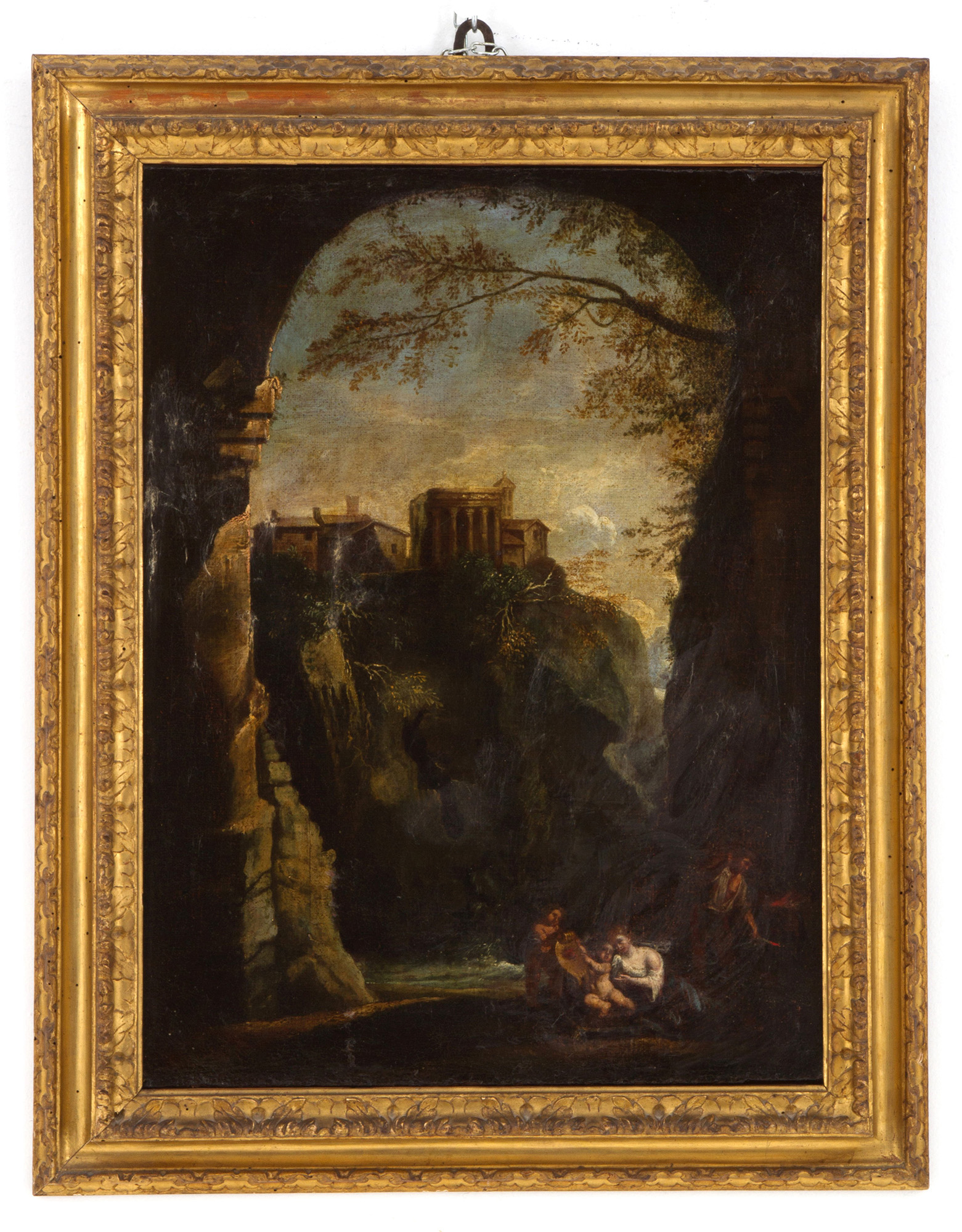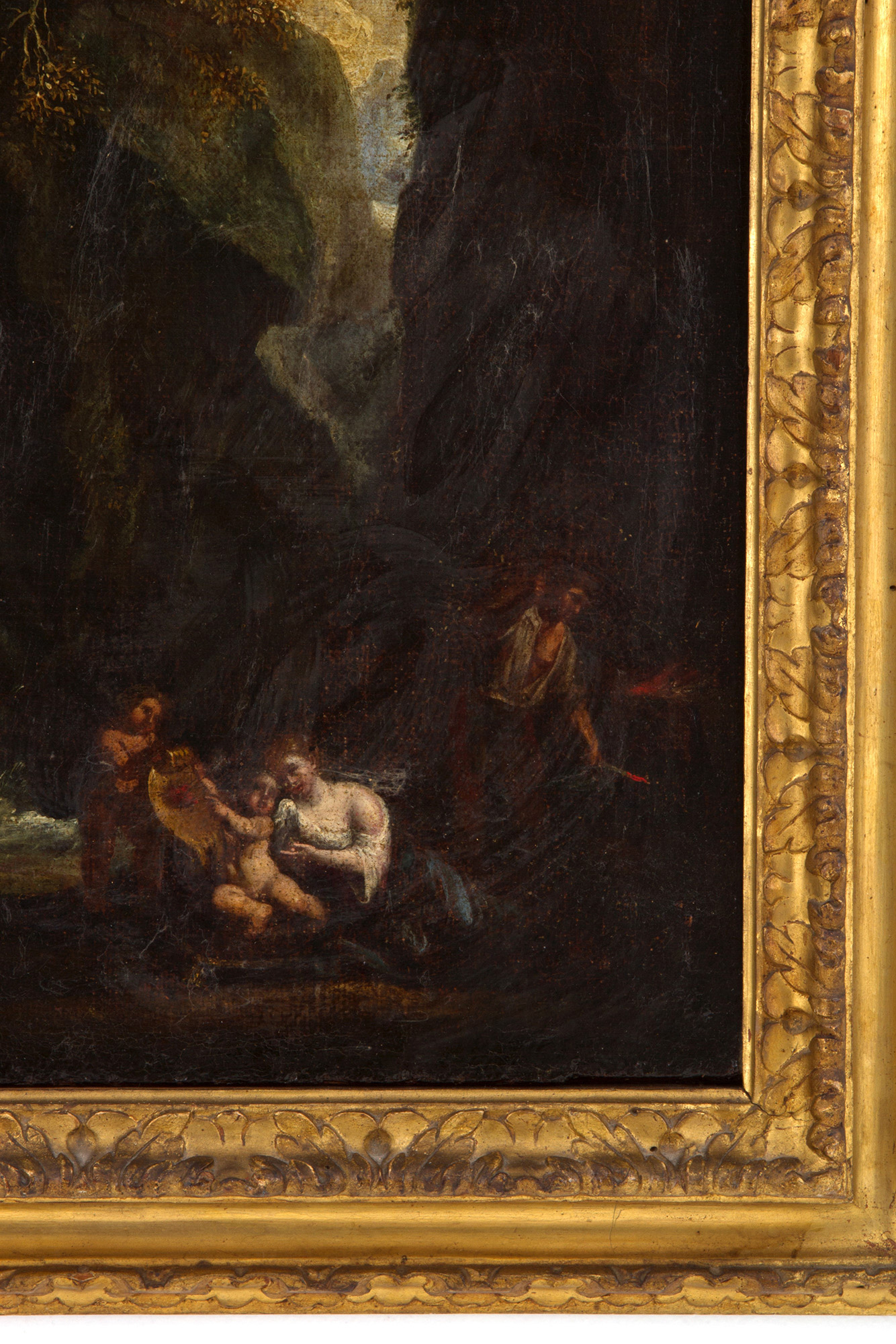 Oil painting on canvas depicting "LANDSCAPE WITH VENUS AND VULCAN". 17th century. In frame. Defects. Already relined and reframed. 61x47 cm approx. Dipinto olio su tela raffigurante "PAESAGGIO CON VENERE E VULCANO". XVII secolo. In cornice. Difetti. Gia' rintelato e rintelaiato. 61x47 cm ca.