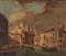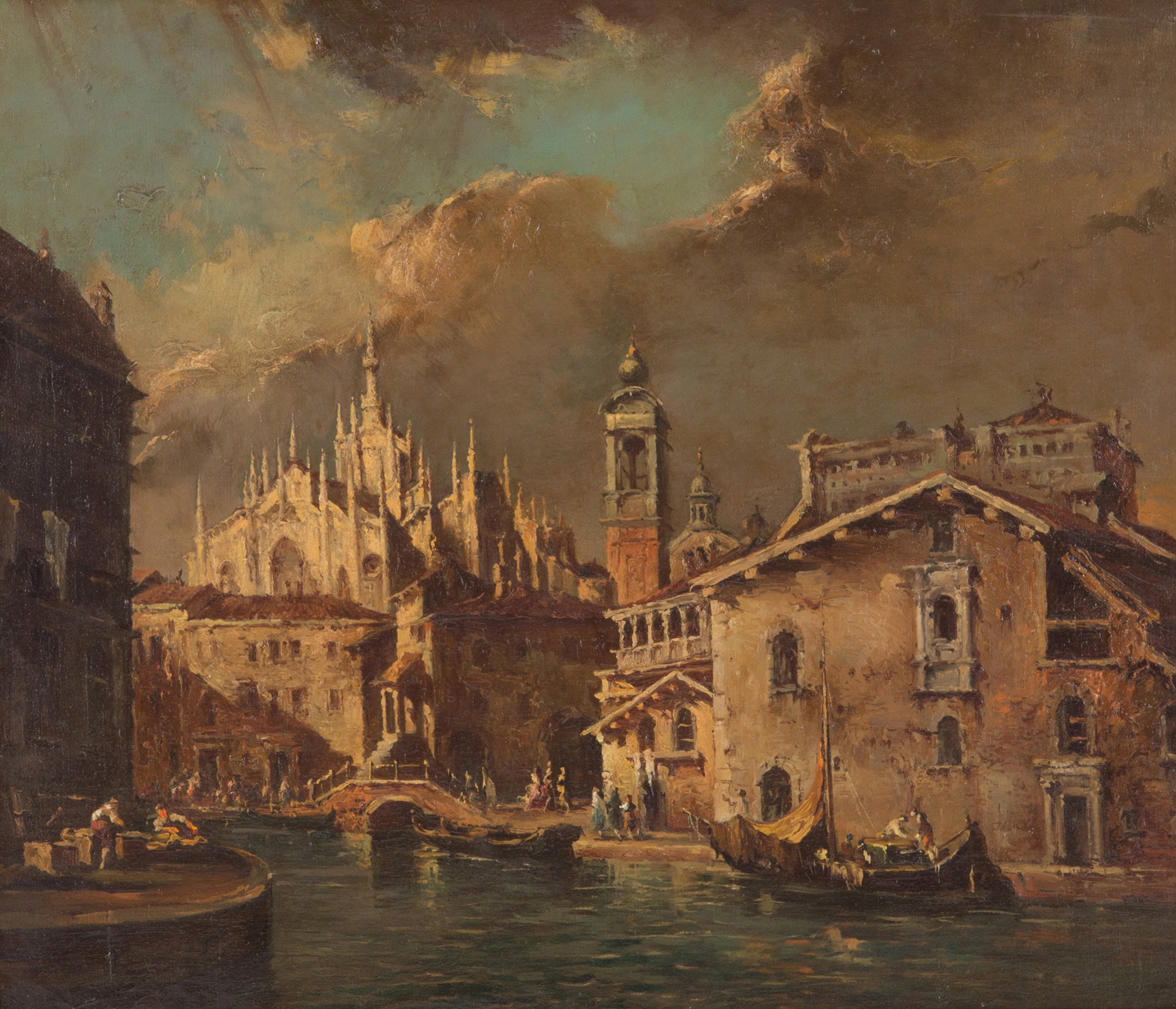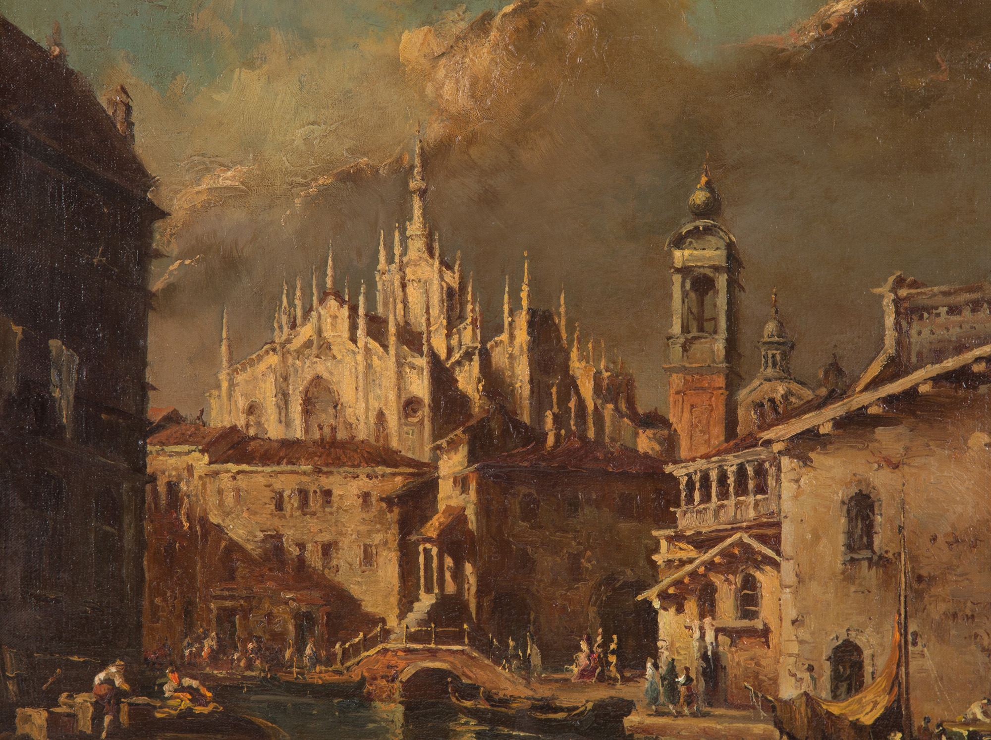 Oil painting on canvas applied on a panel depicting "OLD MILAN, IL LAGHETTO". Late 18th century. In a contemporary gilded frame. 47.5x55x5 cm approx. Dipinto olio su tela applicata su tavoletta raffigurante "VECCHIA MILANO, IL LAGHETTO". Fine XVIII secolo. In cornice dorata coeva. 47,5x55x5 cm ca.