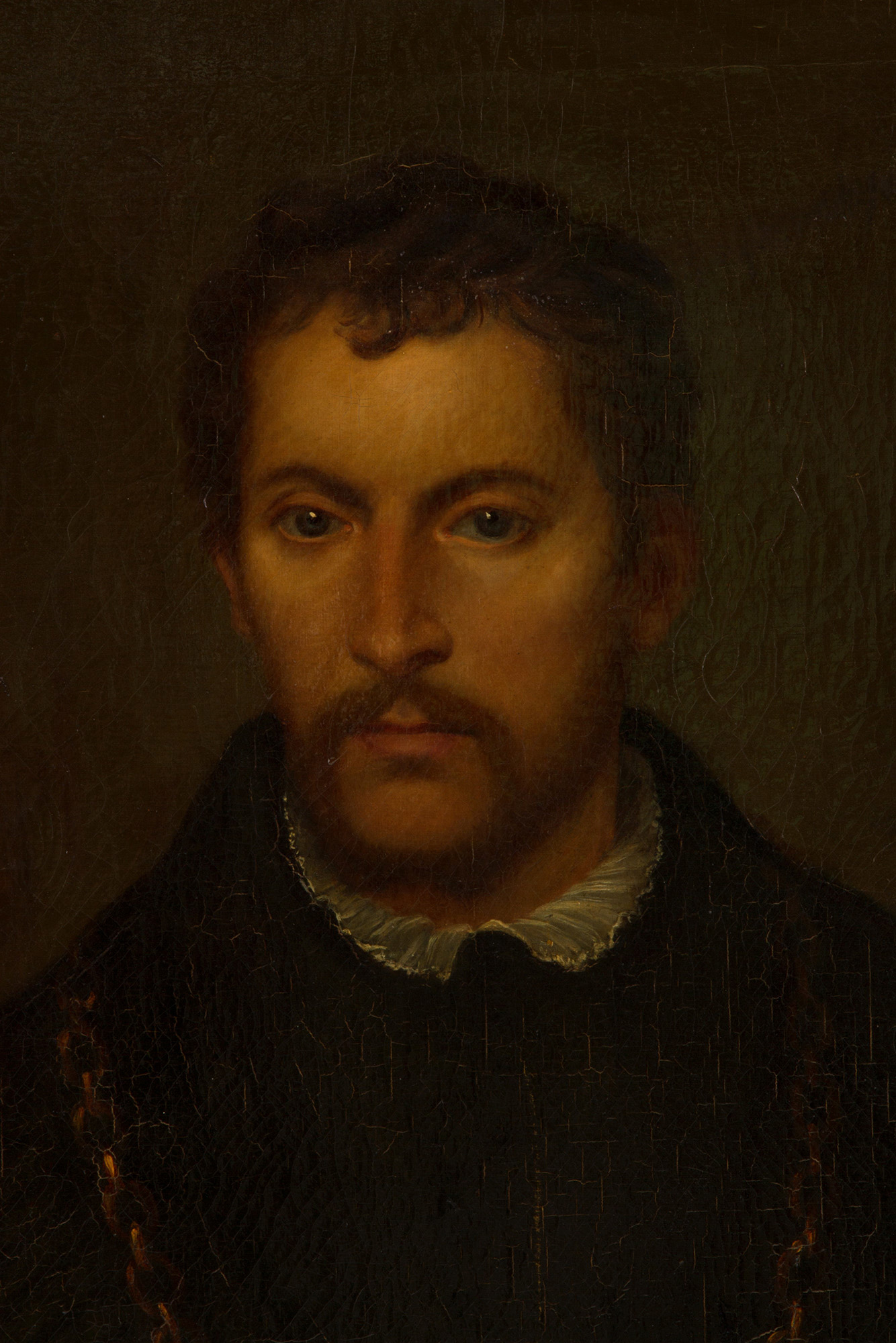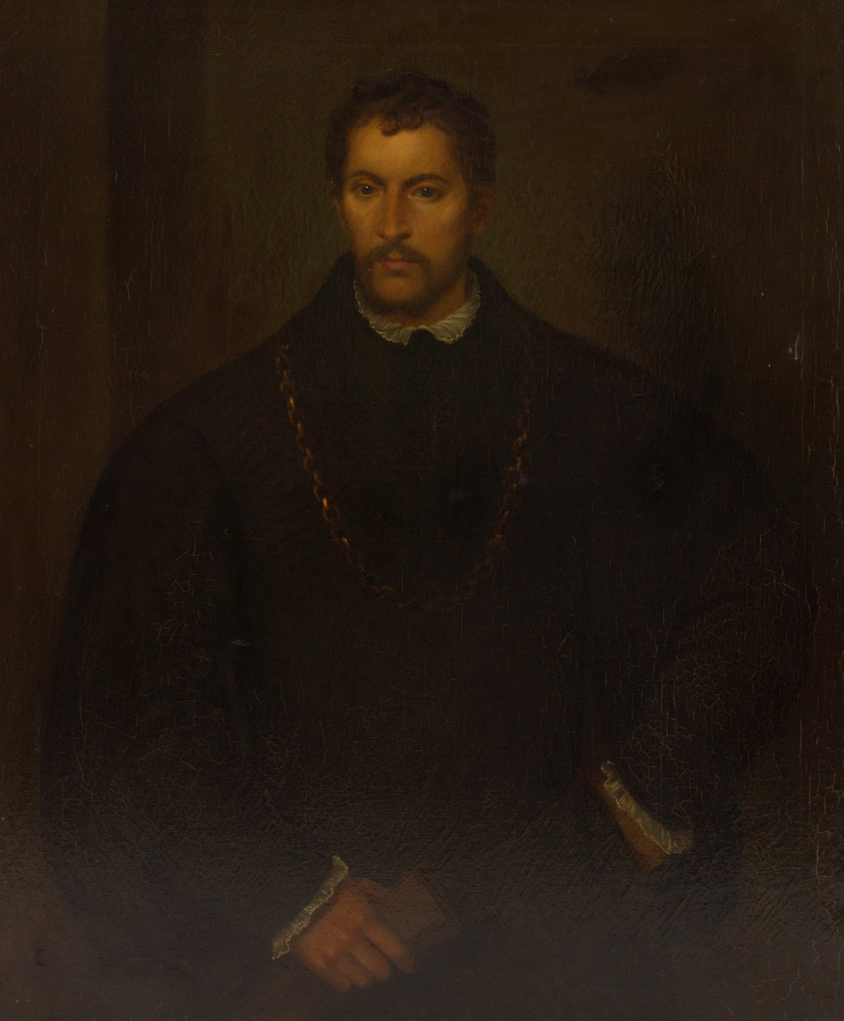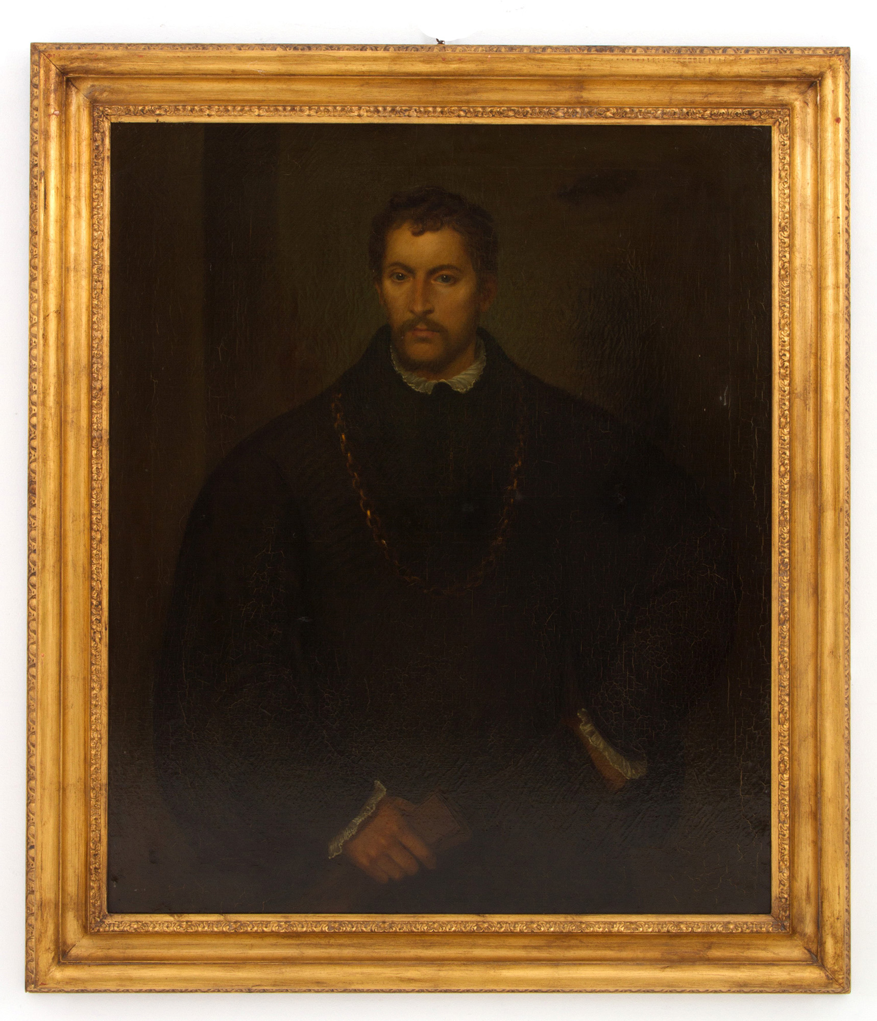 Oil painting on canvas depicting "THE YOUNG ENGLISHMAN. PORTRAIT OF A MAN". By Tiziano Vecellio. 19th century. In a carved and gilded frame. Already relined and reframed. Restoration. 114x95 cm approx. Dipinto olio su tela raffigurante "IL GIOVANE INGLESE. RITRATTO D'UOMO". Da Tiziano Vecellio. XIX secolo. In cornice intagliata e dorata. Gia' rintelato e rintelaiato. Restauro. 114x95 cm ca.