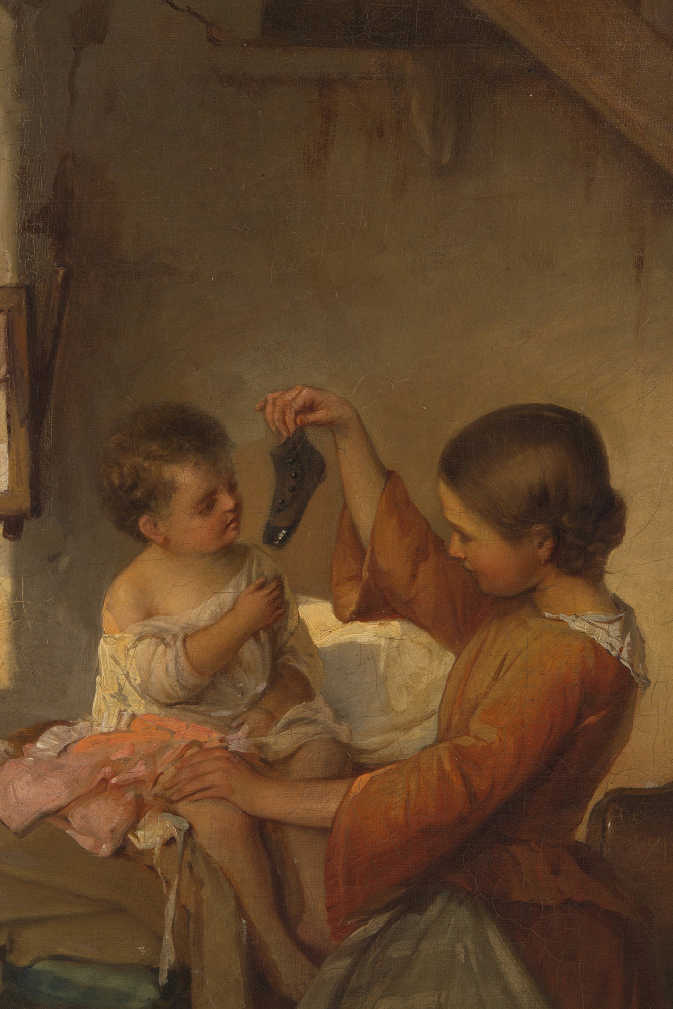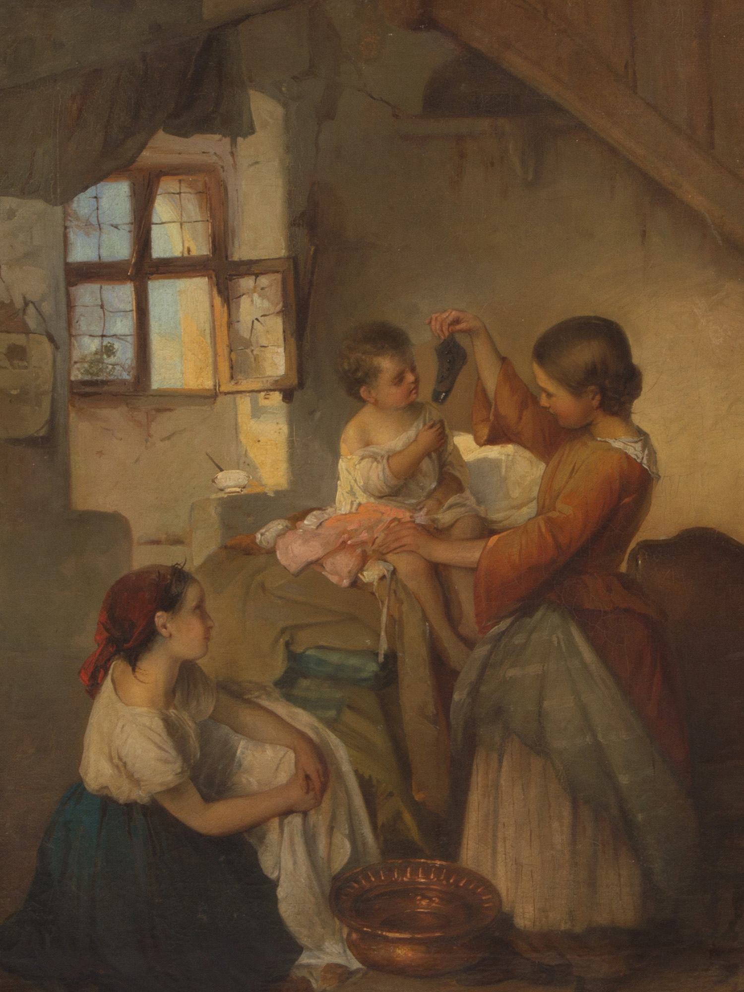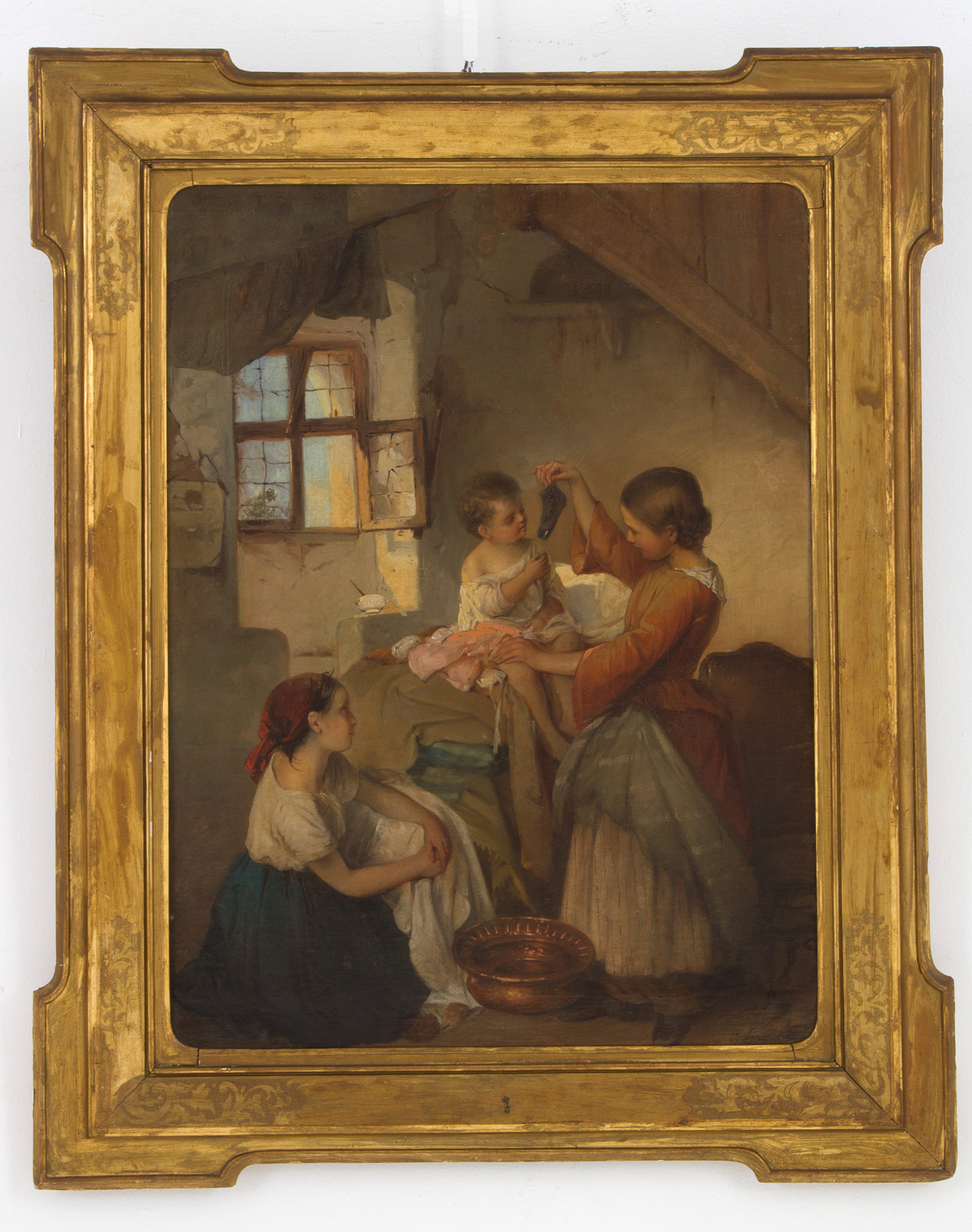 Oil painting on canvas depicting "INNER WITH GIRLS". 19th century. In a golden frame. 80x60 cm approx. Dipinto olio su tela raffigurante "INTERNO CON BAMBINE". XIX secolo. In cornice dorata. 80x60 cm ca.