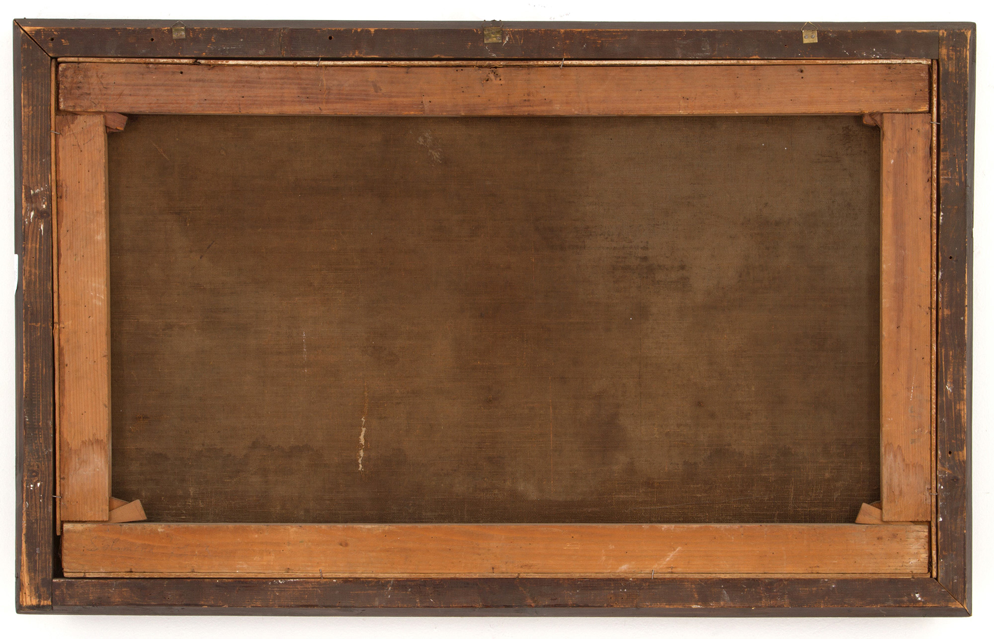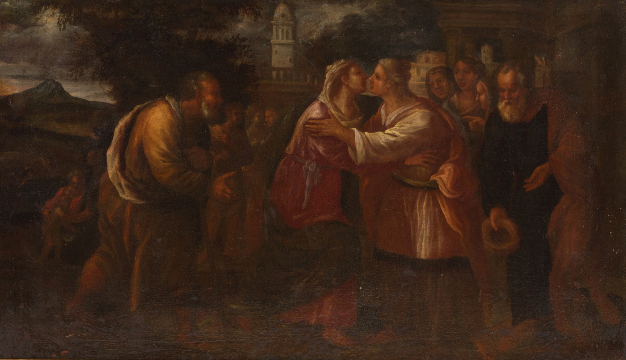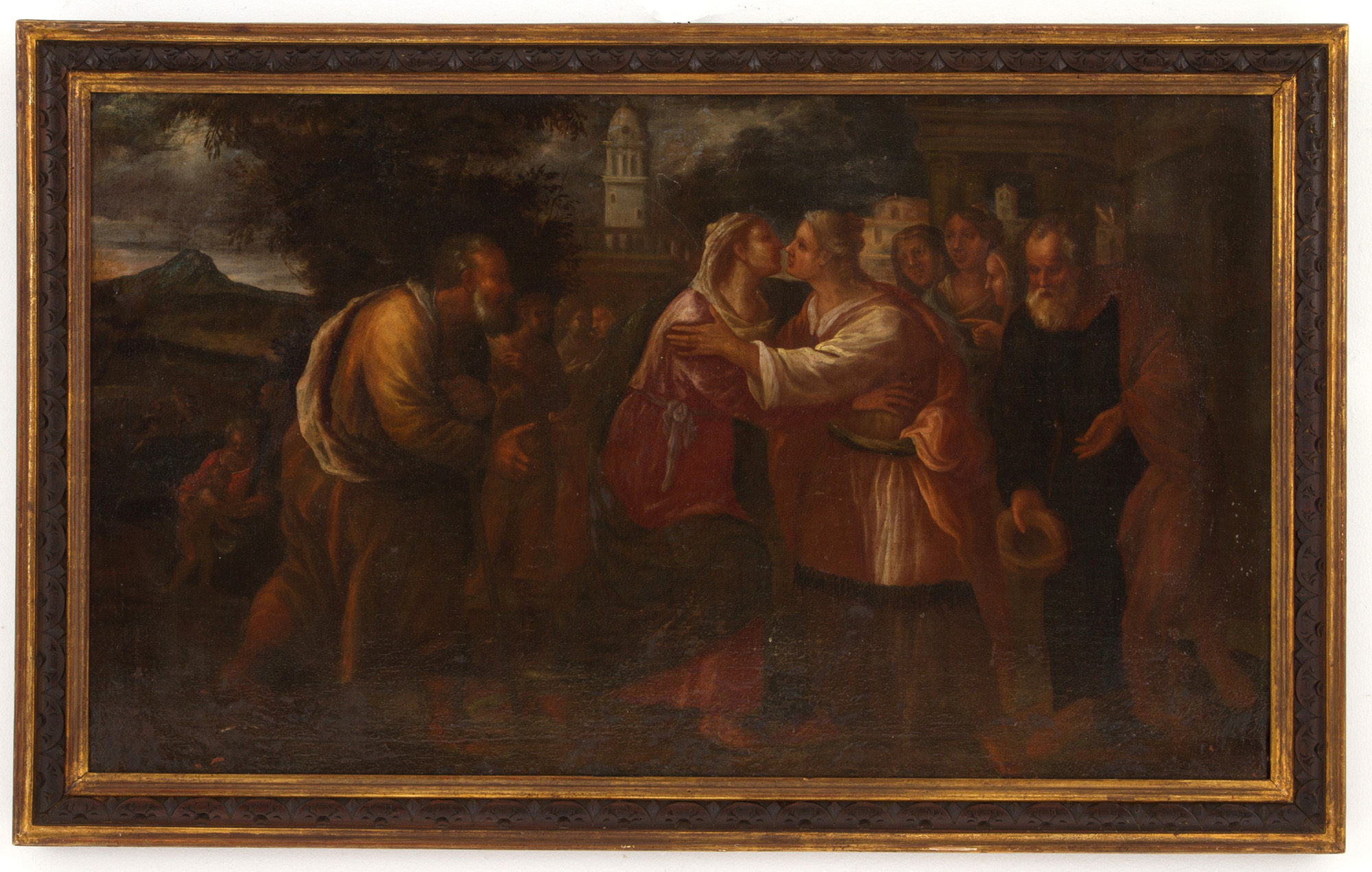 Oil painting on canvas depicting "VISITATION OF MARY TO SAINT ELIZABETH". 17th century. In a carved, lacquered and gilded wooden frame. Already relined and reframed. Restorations. 65.5x112 cm approx. Dipinto olio su tela raffigurante "VISITAZIONE DI MARIA A SANTA ELISABETTA". XVII secolo. In cornice in legno intagliato, laccato e dorato. Gia' rintelato e rintelaiato. Restauri. 65,5x112 cm ca.