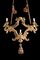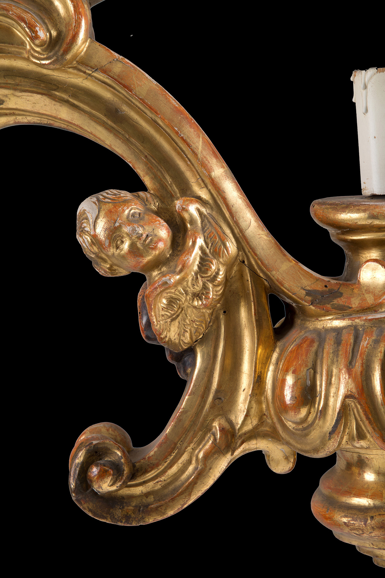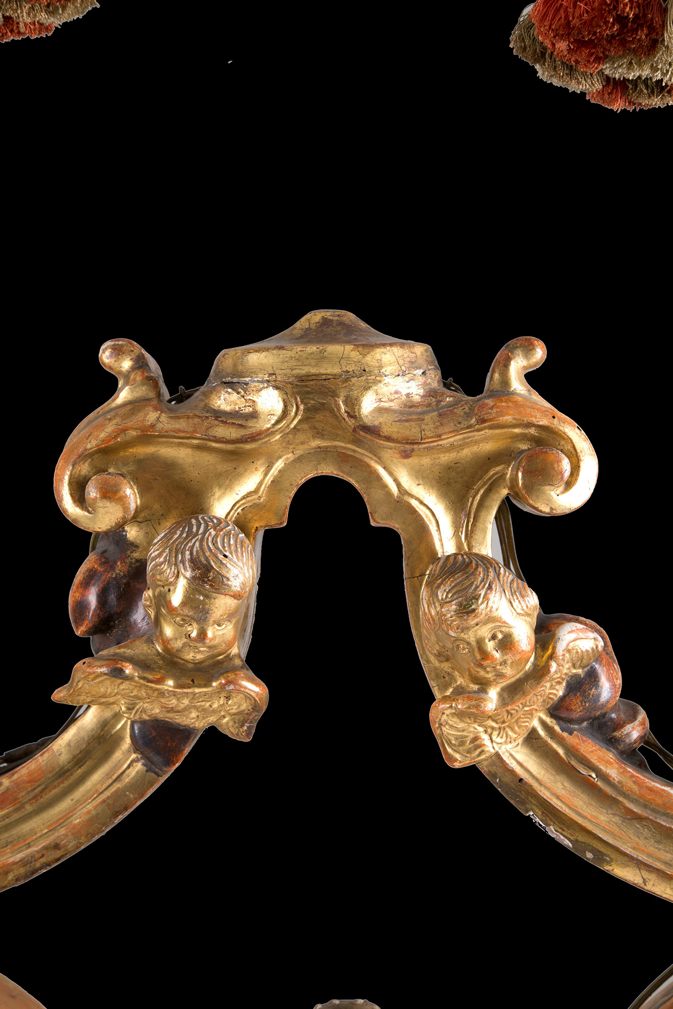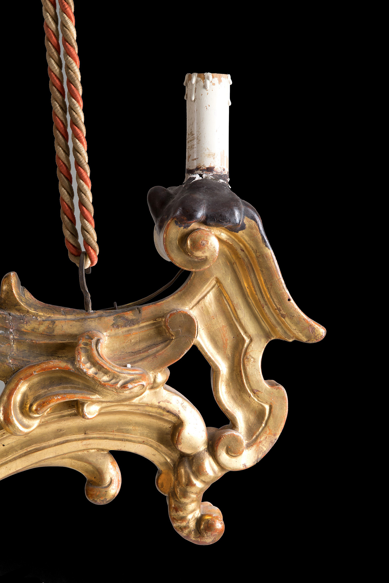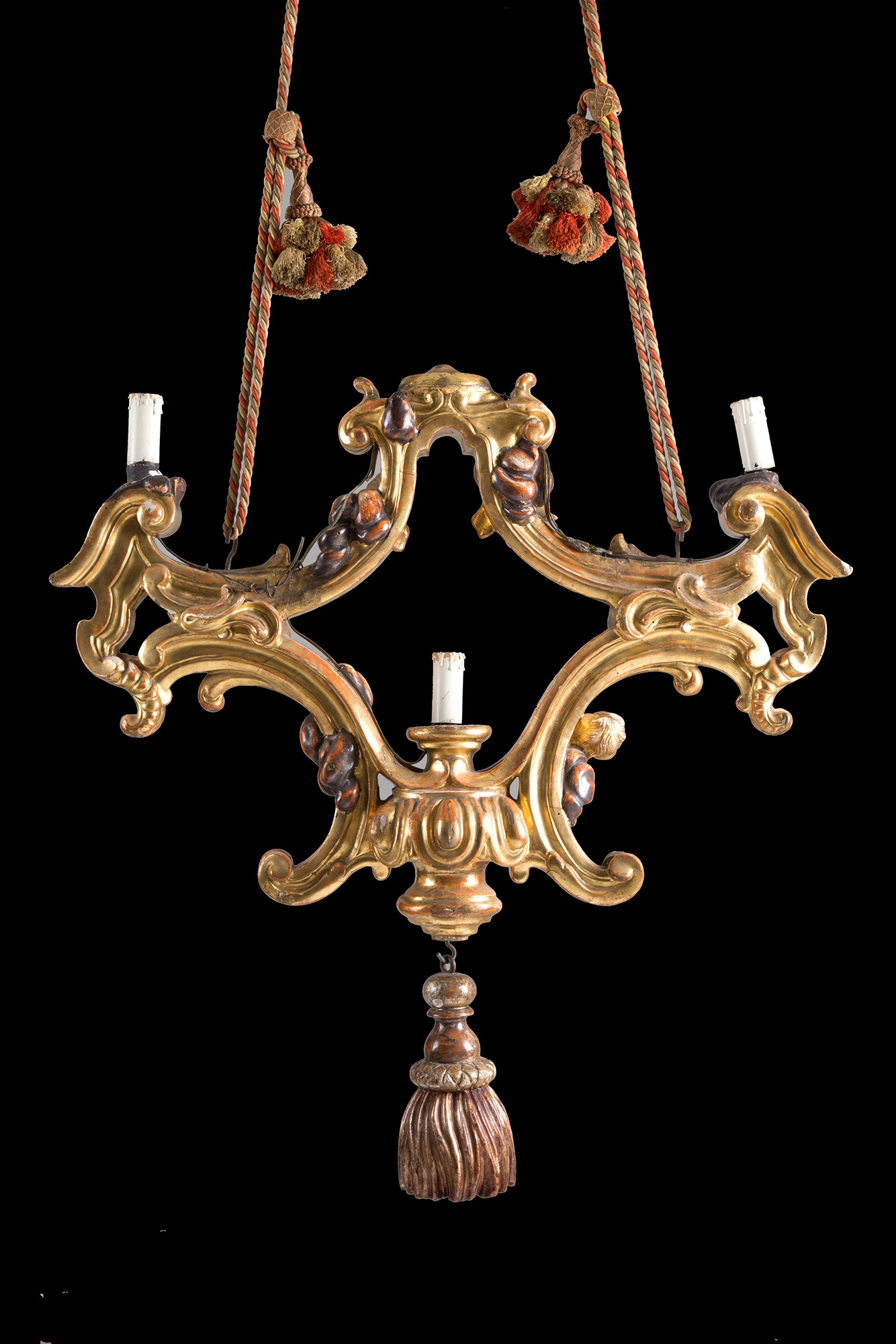 Three-light chandelier in carved, gilded, lacquered and mecca gilded wood with cherubs, supported by ropes. Late 17th century. Defects. 152x92x20 cm approx. Lampadario tre luci in legno intagliato, dorato, laccato e a mecca con cherubini, sorretto da corde. Fine XVII secolo. Difetti. 152x92x20 cm ca.