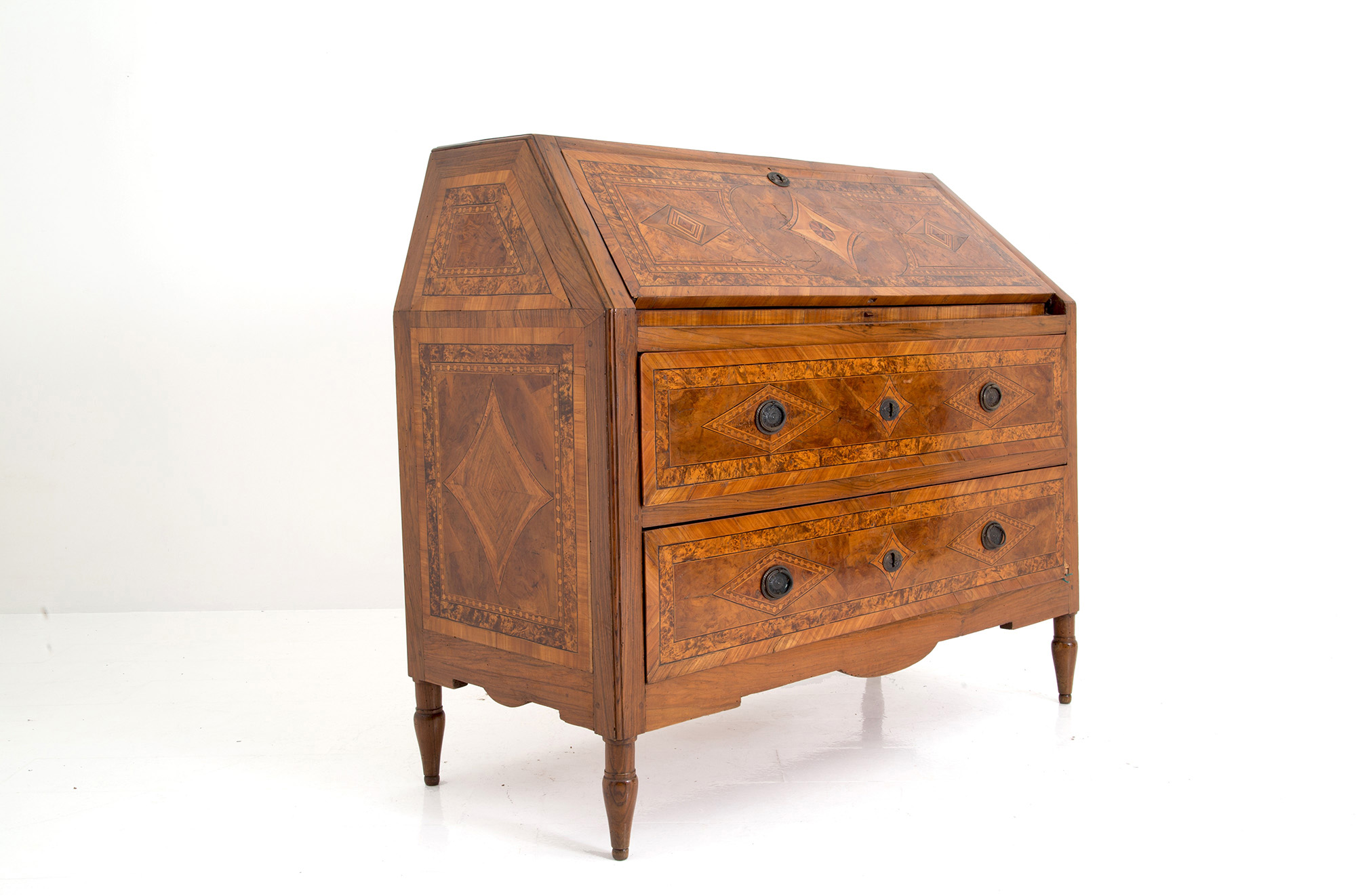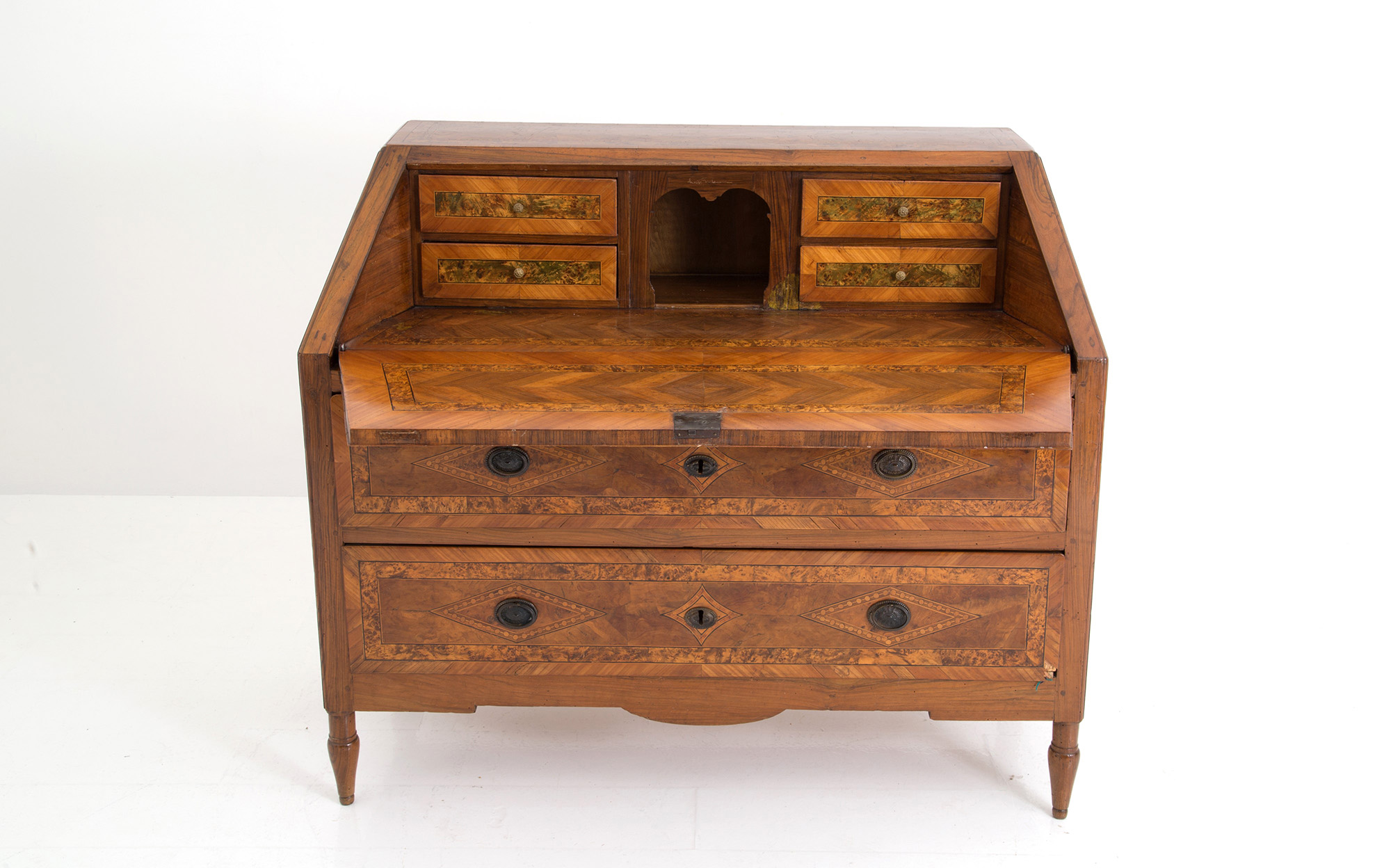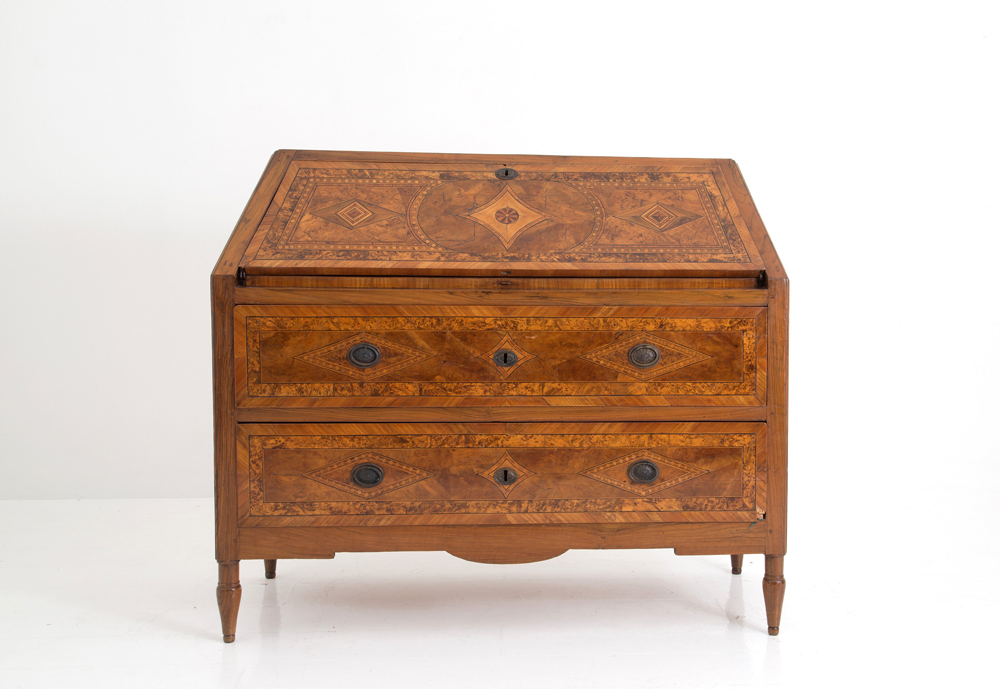Veneered and threaded flap cabinet in various woods with two drawers and a flap. Piacenza. 18th century. 110x127x55 cm approx. Ribalta lastronata e filettata in legni vari con due cassetti e calatoia. Piacenza. XVIII secolo. 110x127x55 cm ca.