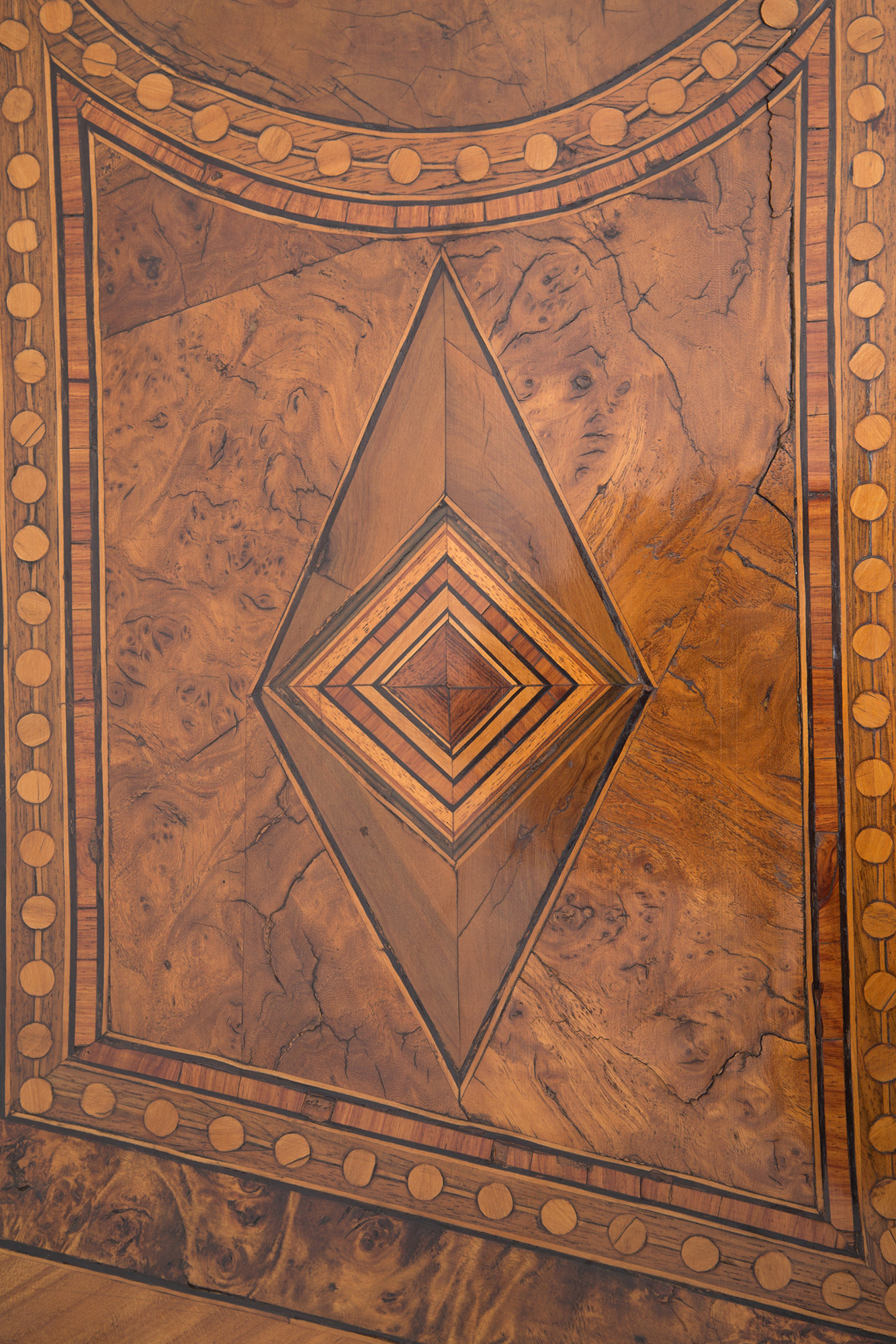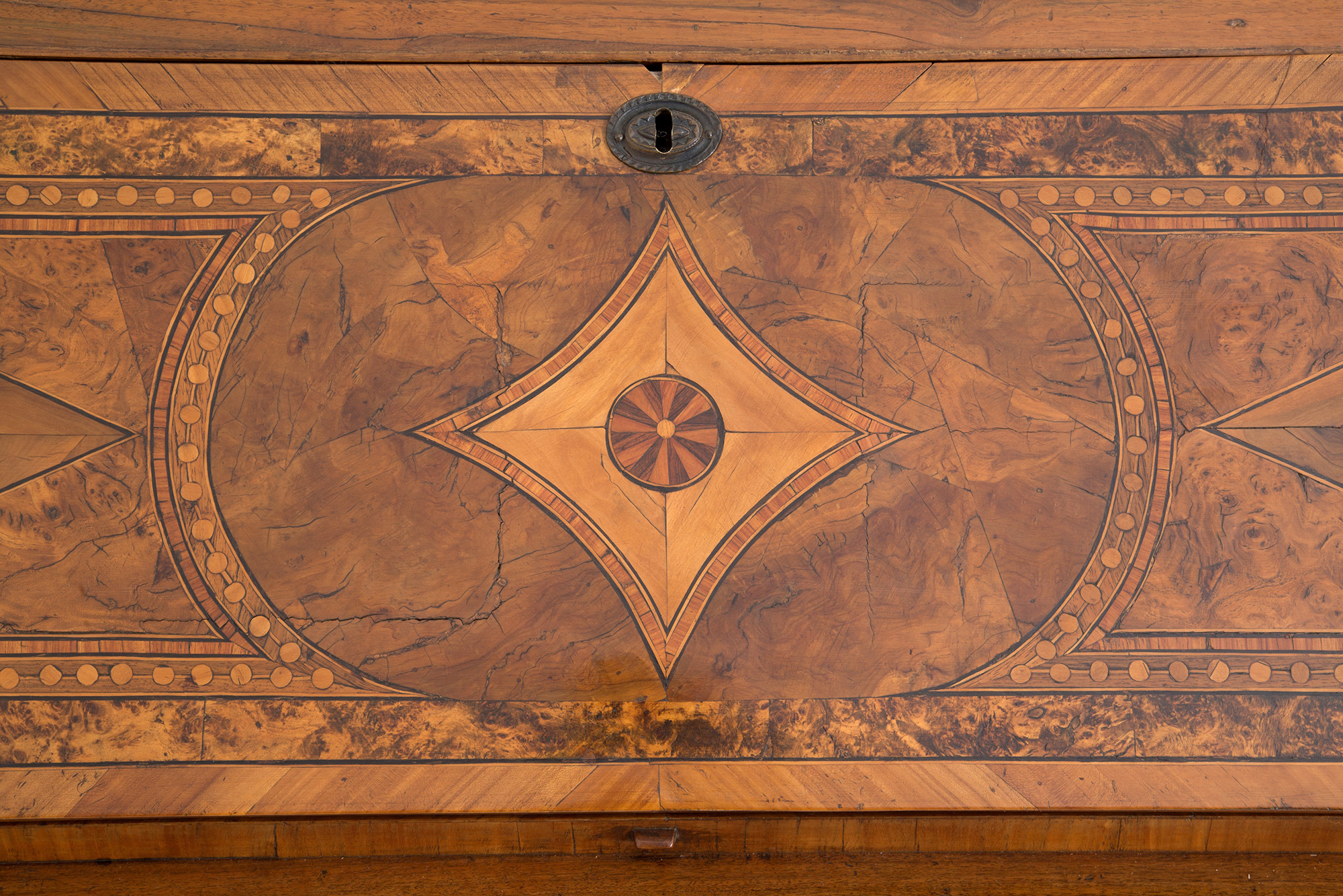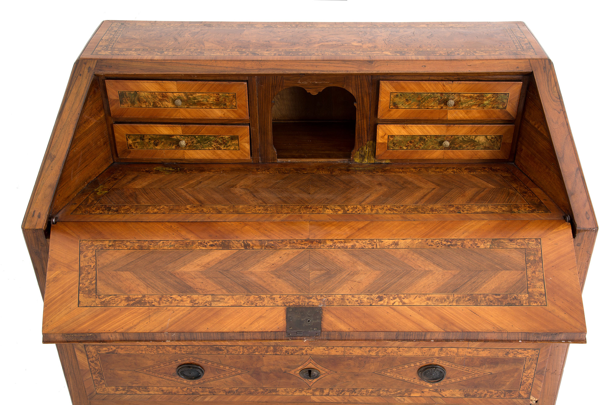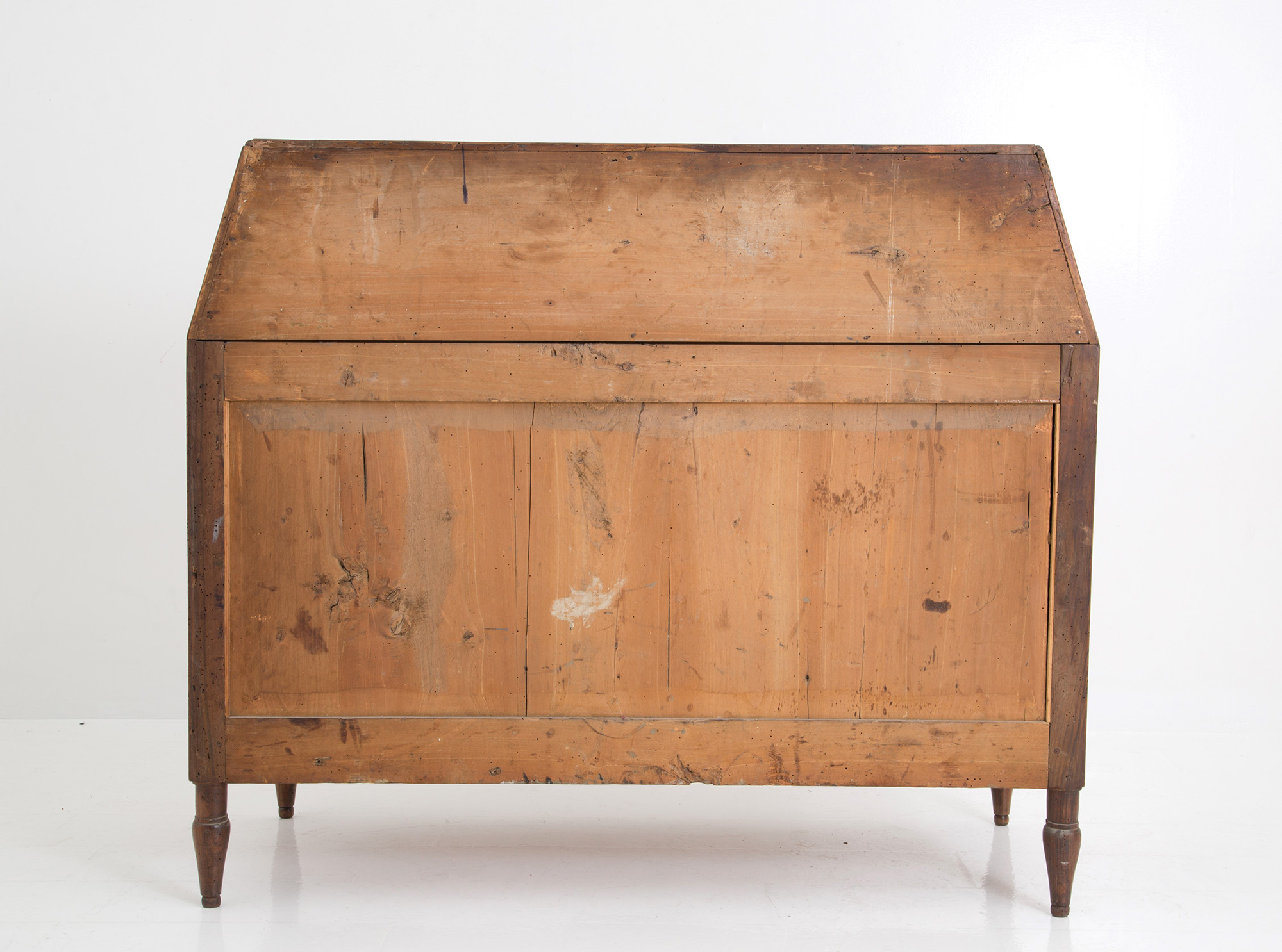 Veneered and threaded flap cabinet in various woods with two drawers and a flap. Piacenza. 18th century. 110x127x55 cm approx. Ribalta lastronata e filettata in legni vari con due cassetti e calatoia. Piacenza. XVIII secolo. 110x127x55 cm ca.