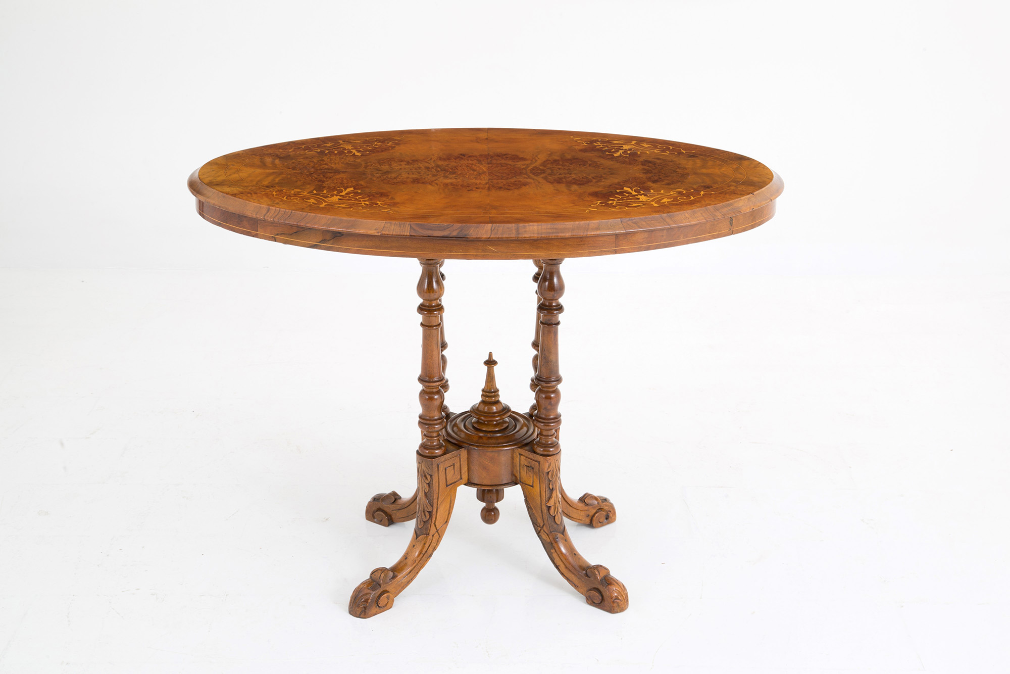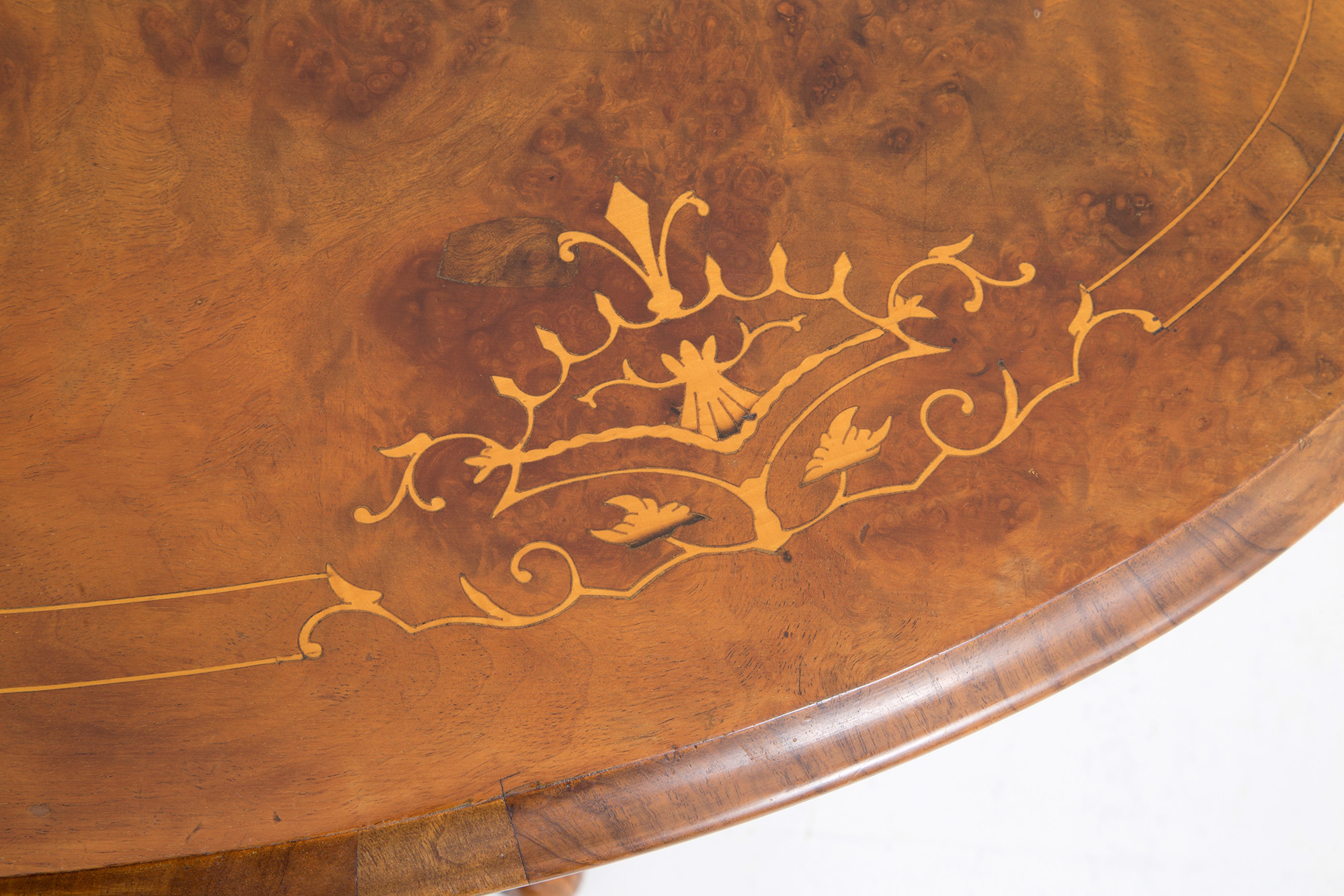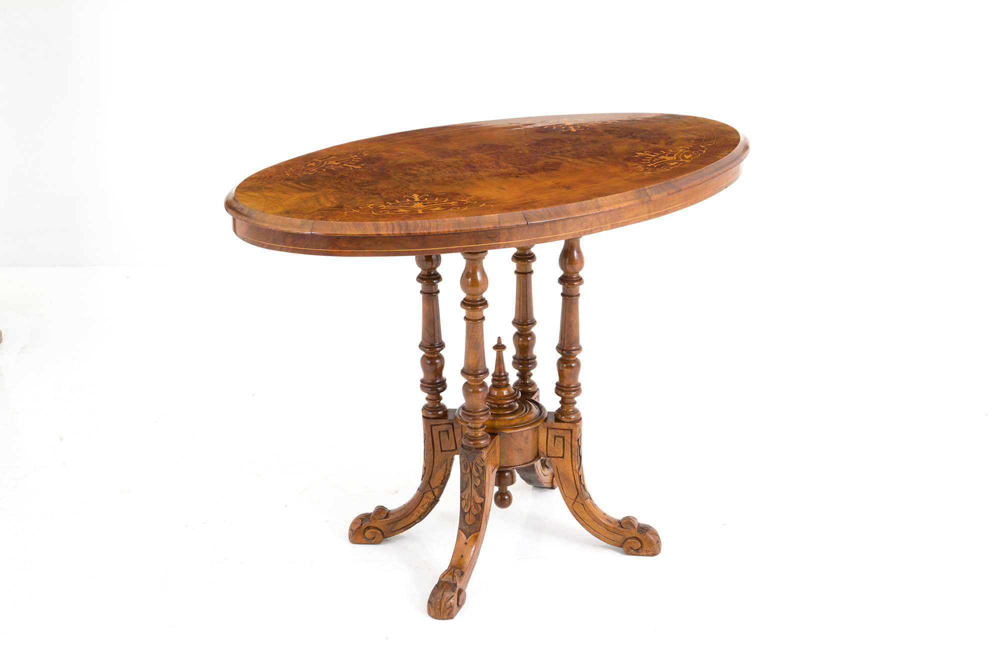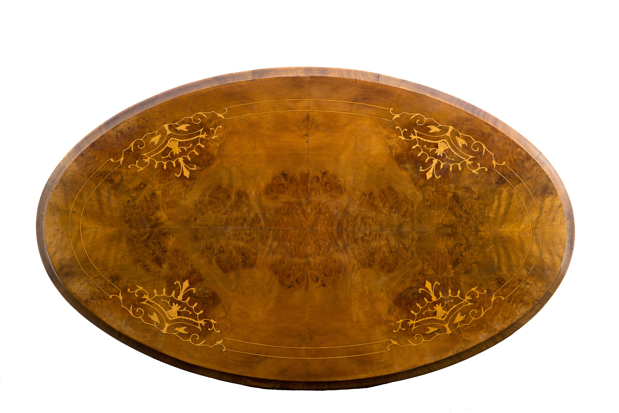 Oval quadripod coffee table in birch wood with inlaid maple wood top. England. 19th century. 68.5x91.5x55.5 cm approx. Tavolino ovale quadripode in legno di betulla intarsiato sul piano in legno di acero. Inghilterra. XIX secolo. 68,5x91,5x55,5 cm ca.