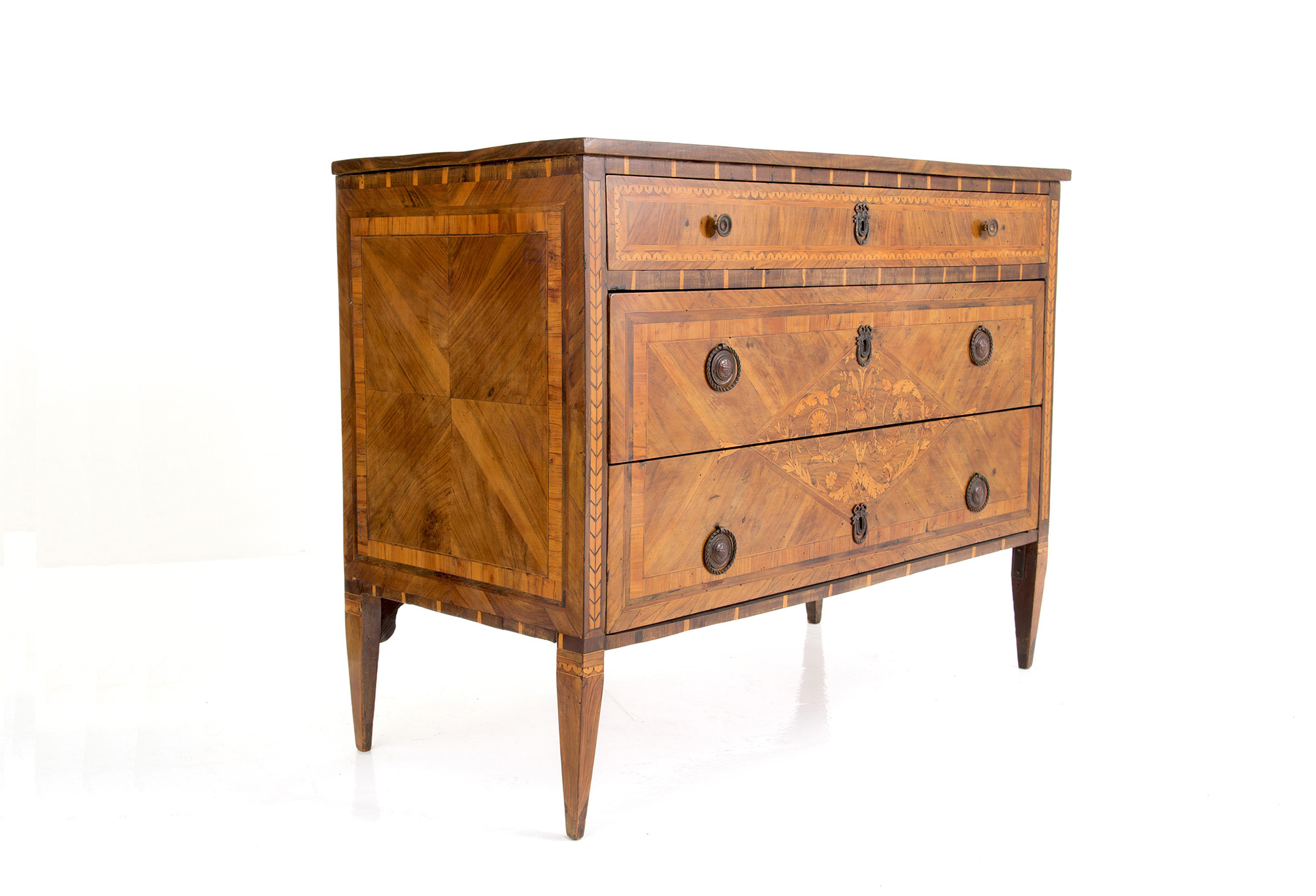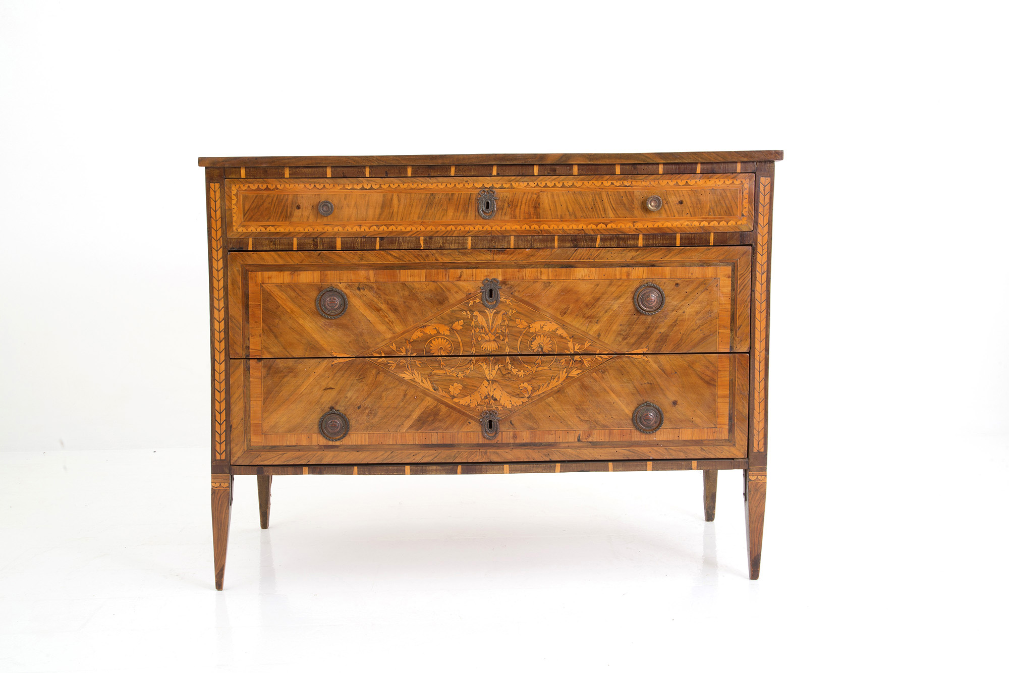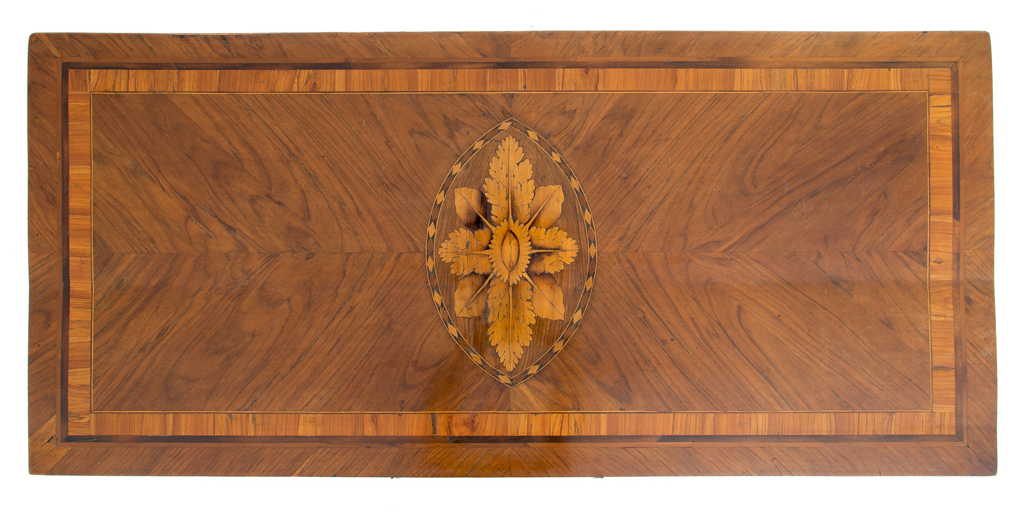 Walnut veneered dresser with bois de rose threads and reserve with floral inlay in the center of the top and three drawers. Lombardy. 18th century. Defects. 90x118x55 cm approx. Como' lastronato in noce con filettature in bois de rose e riserva con intarsio floreale al centro del piano e tre cassetti. Lombardia. XVIII secolo. Difetti. 90x118x55 cm ca.