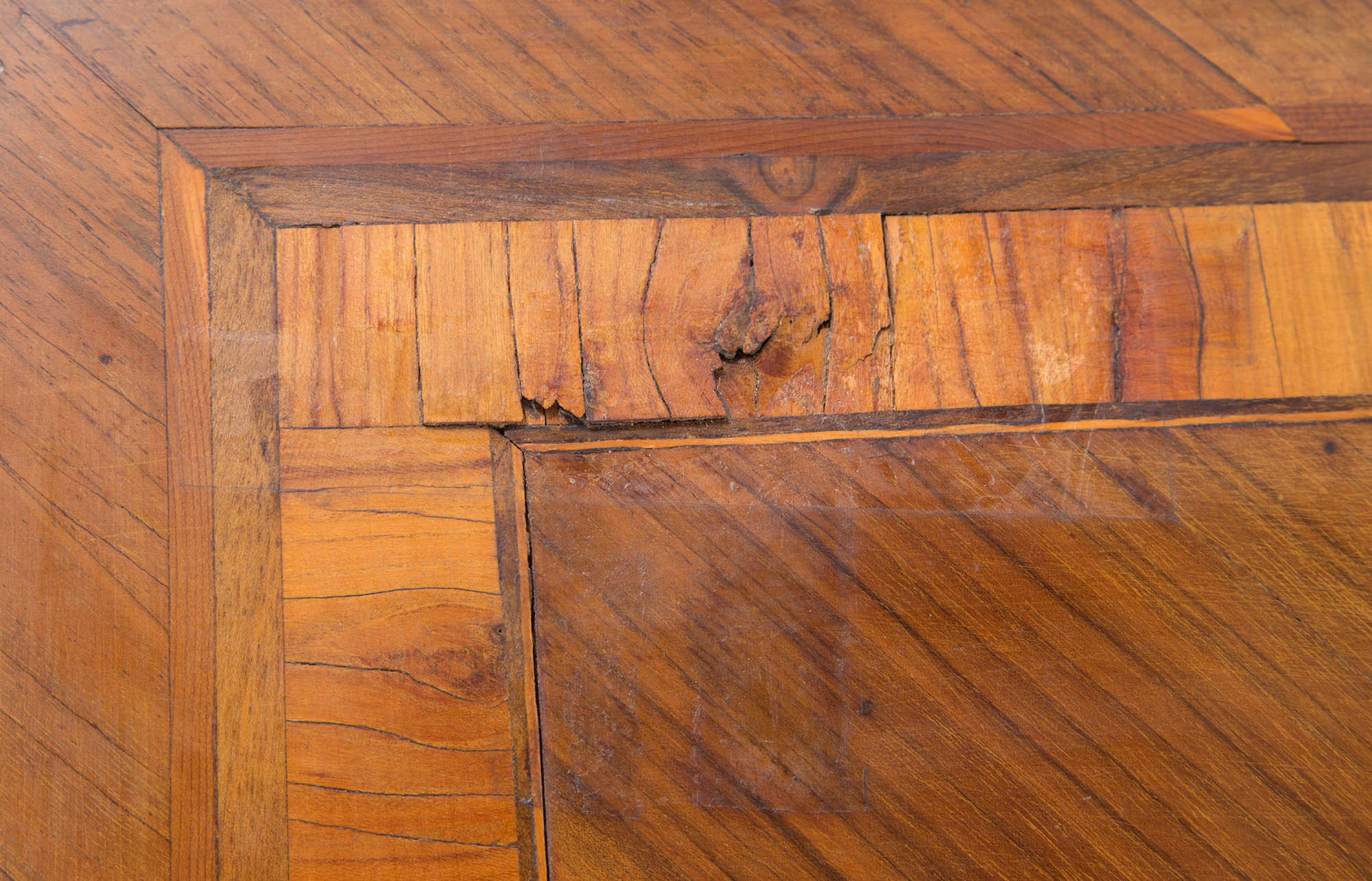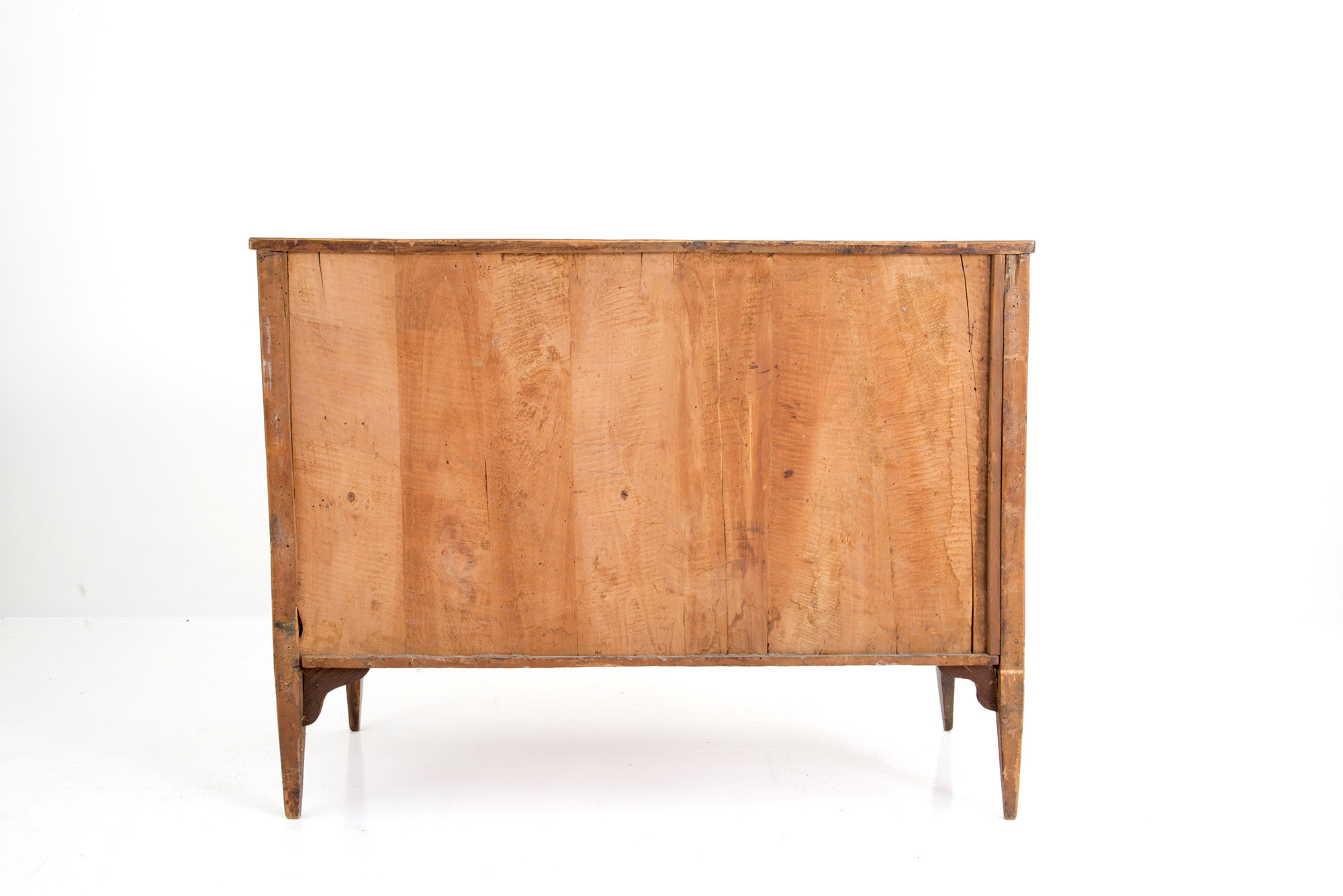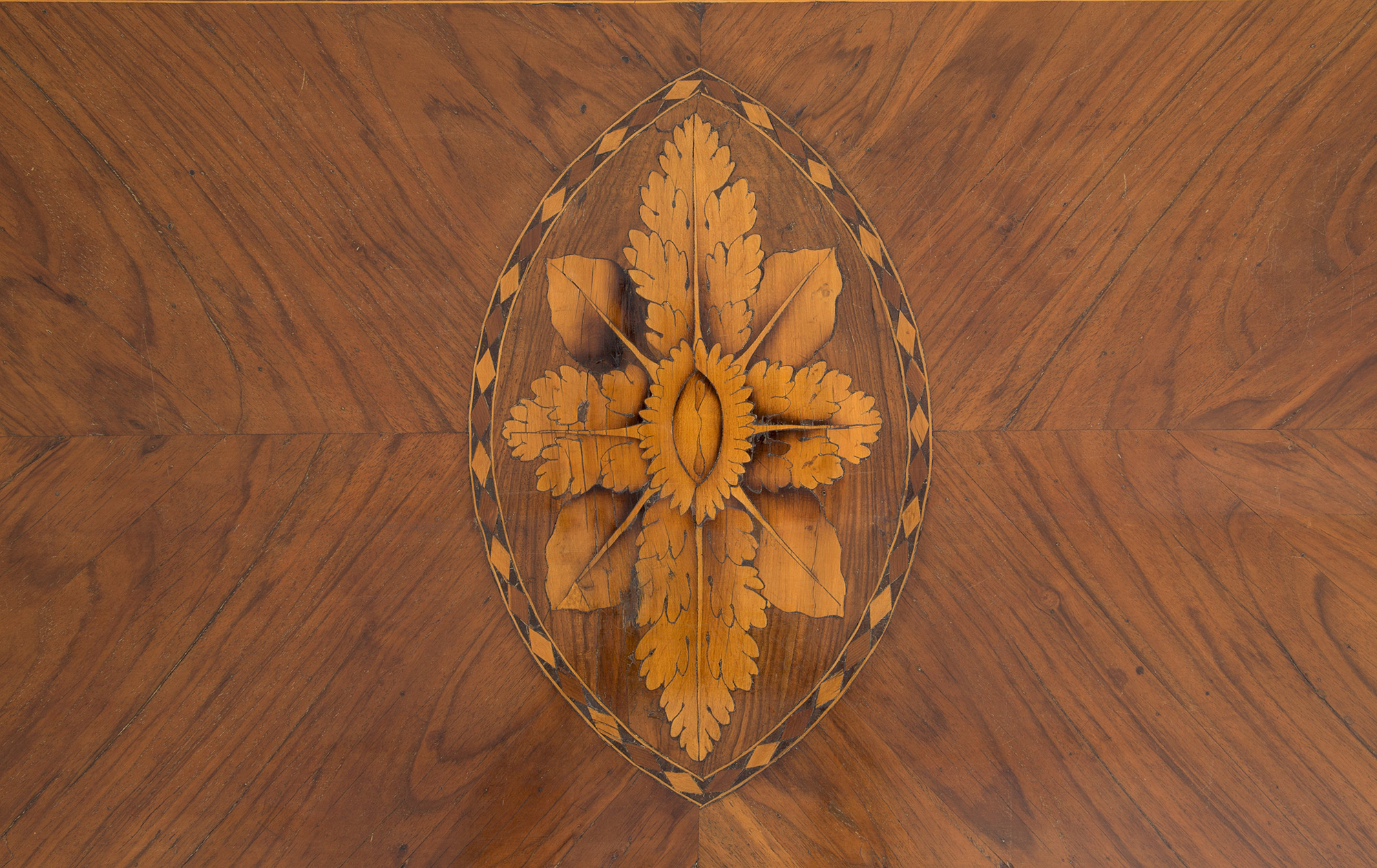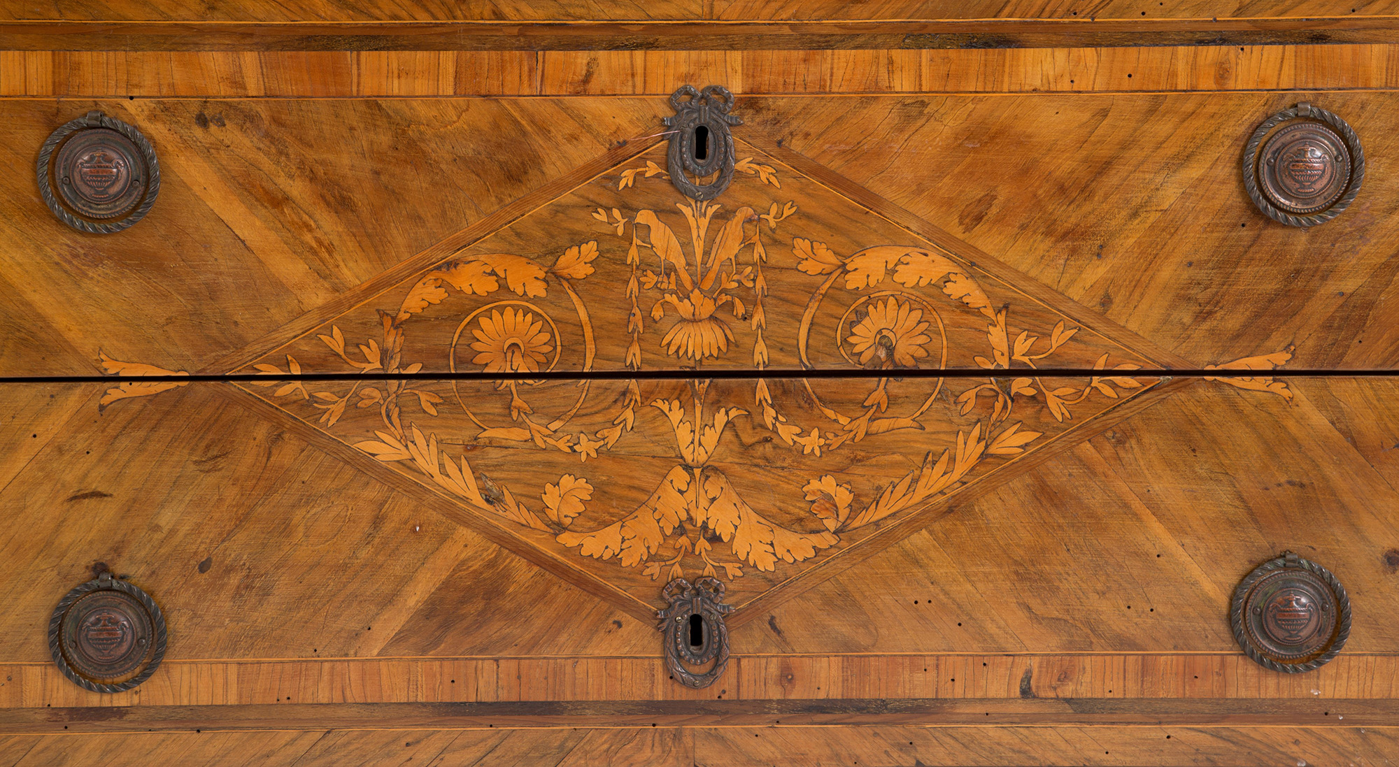 Walnut veneered dresser with bois de rose threads and reserve with floral inlay in the center of the top and three drawers. Lombardy. 18th century. Defects. 90x118x55 cm approx. Como' lastronato in noce con filettature in bois de rose e riserva con intarsio floreale al centro del piano e tre cassetti. Lombardia. XVIII secolo. Difetti. 90x118x55 cm ca.
