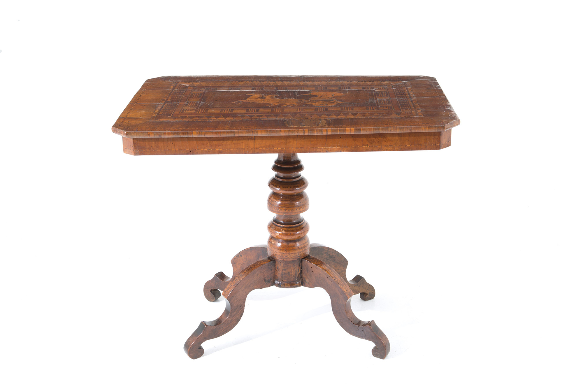 Veneered and inlaid coffee table in various woods with a top decorated with a chariot within the reserve. Rolo manufacturing. 19th century. Defects. 75x90x60 cm approx. Tavolino lastronato e intarsiato in legni vari con piano decorato con biga entro riserva. Manifattura Rolo. XIX secolo. Difetti. 75x90x60 cm ca.