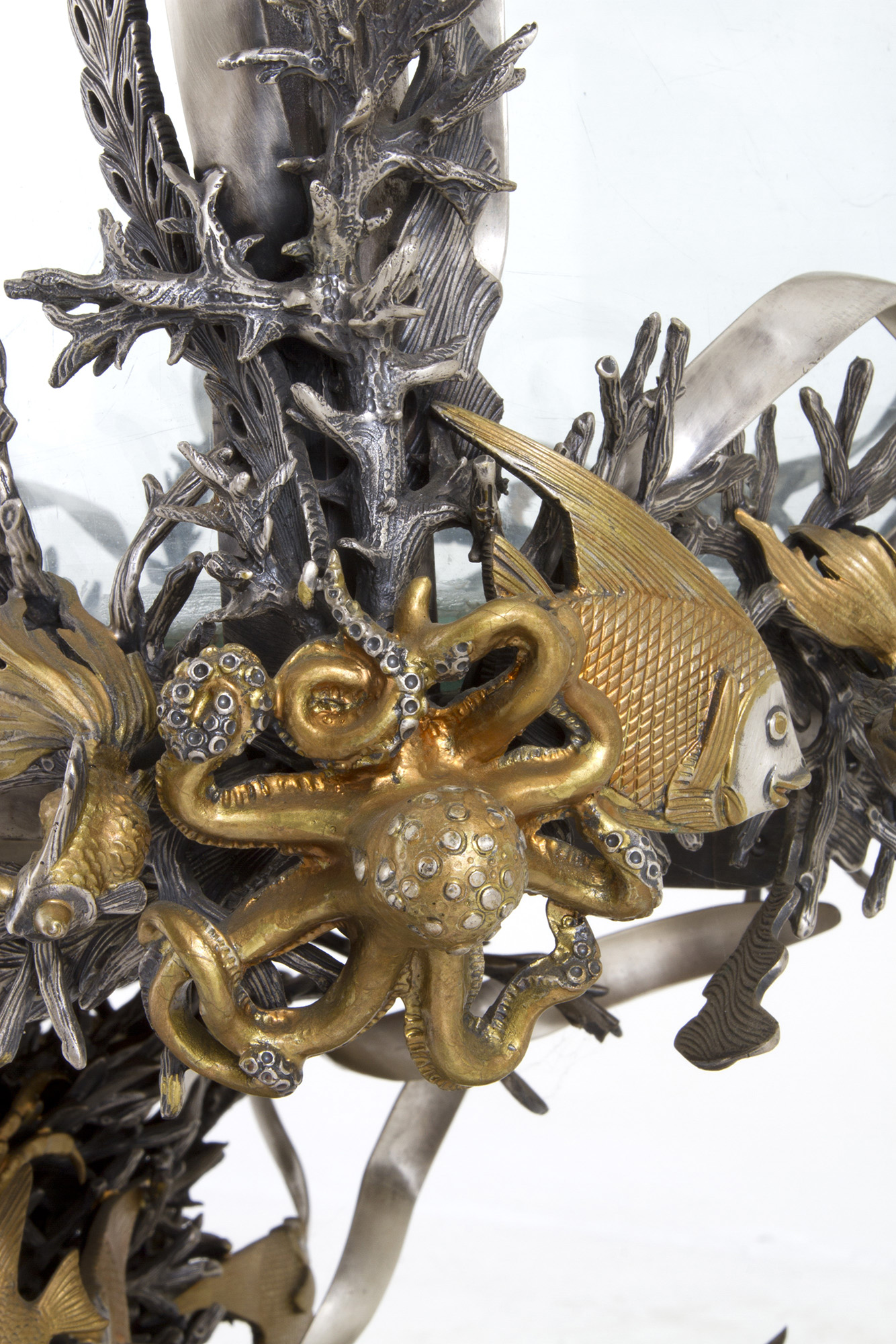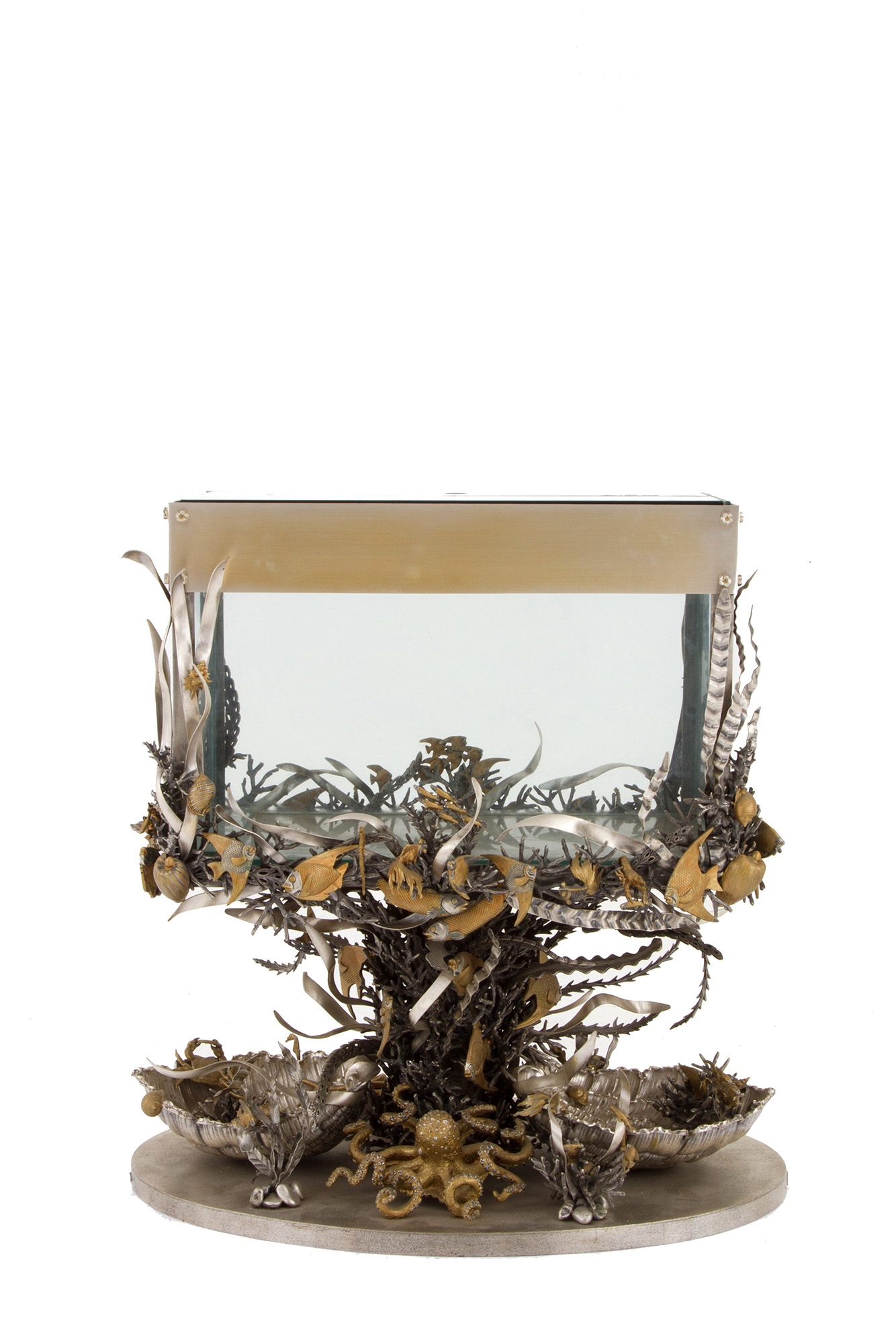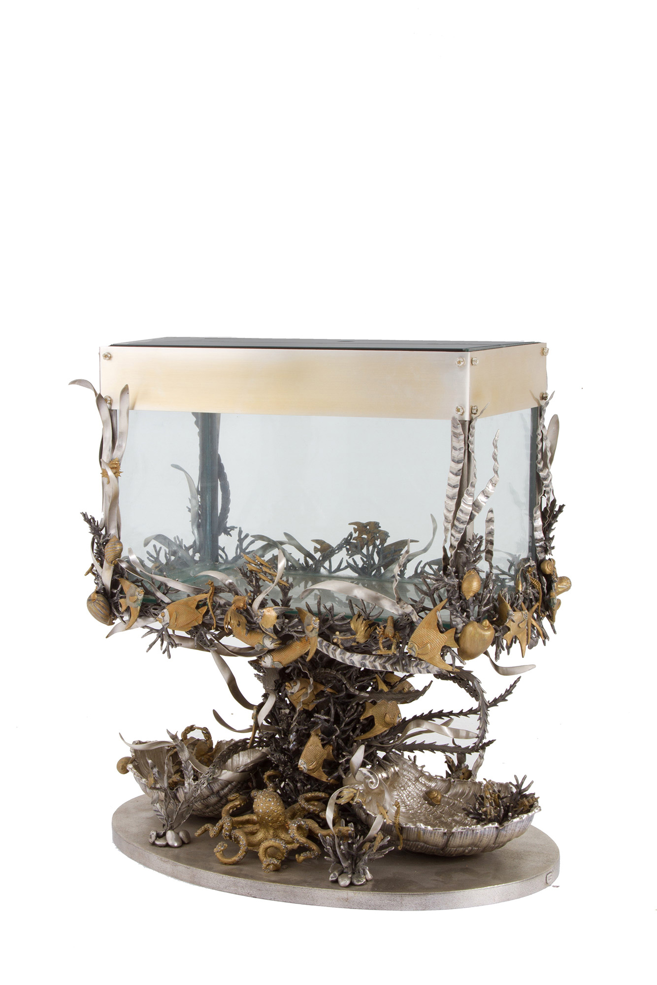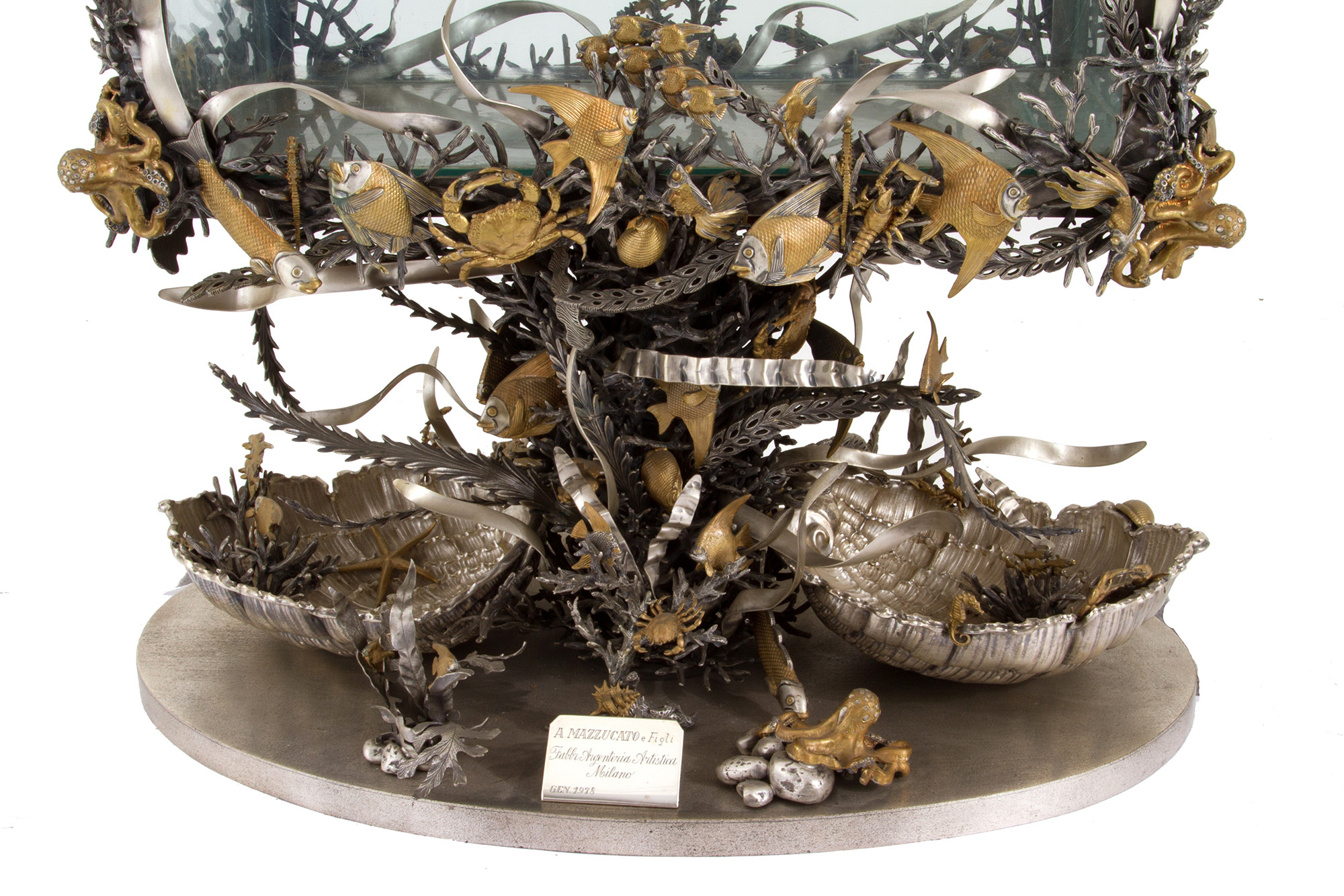 925 silver aquarium with golden parts. MAZZUCATO. With silversmith's tag. 1978. Weight of silver alone approx. 62 kg. 80x81x50 cm approx. Acquario in argento 925 con parti dorate. MAZZUCATO. Con targhetta dell'argentiere. Peso del solo argento 62 kg ca. 1978. 80x81x50 cm ca.
