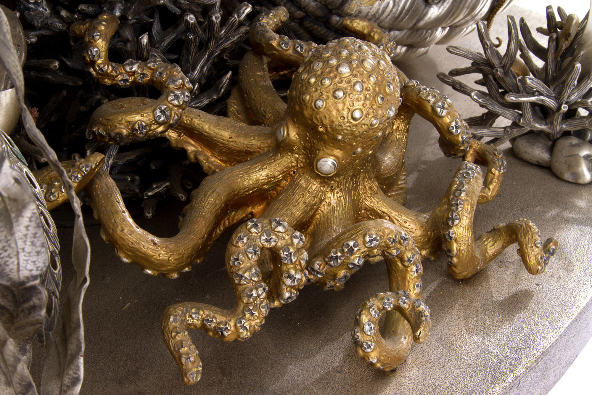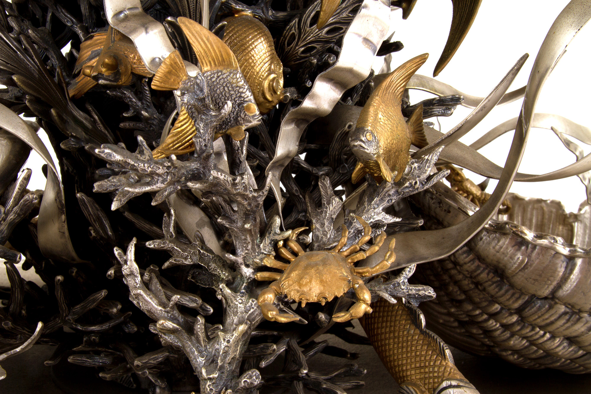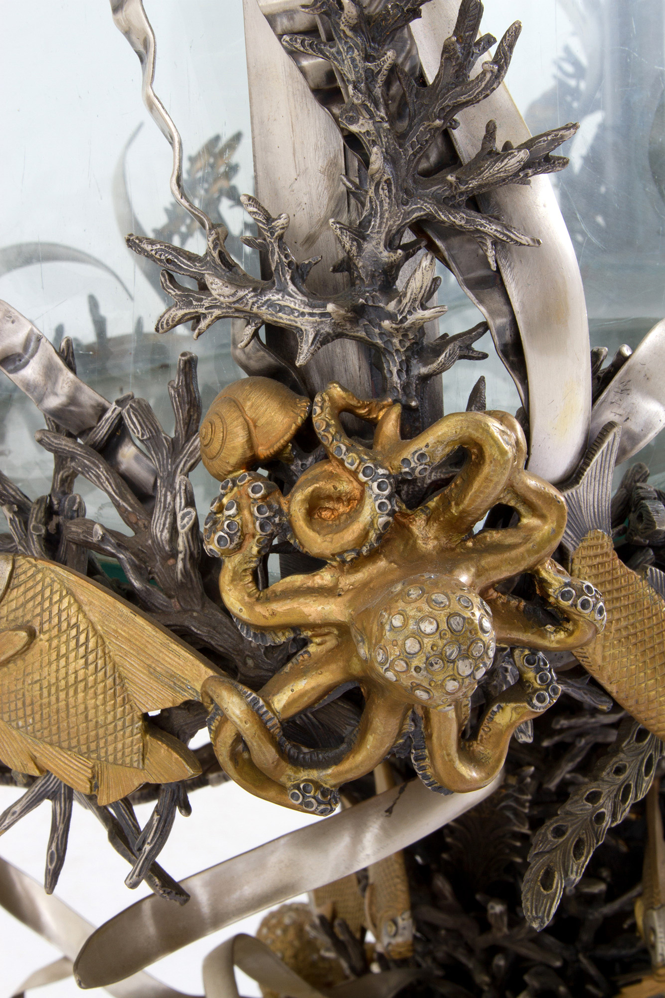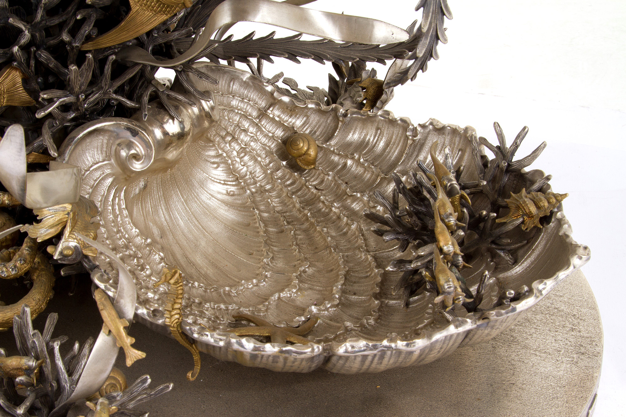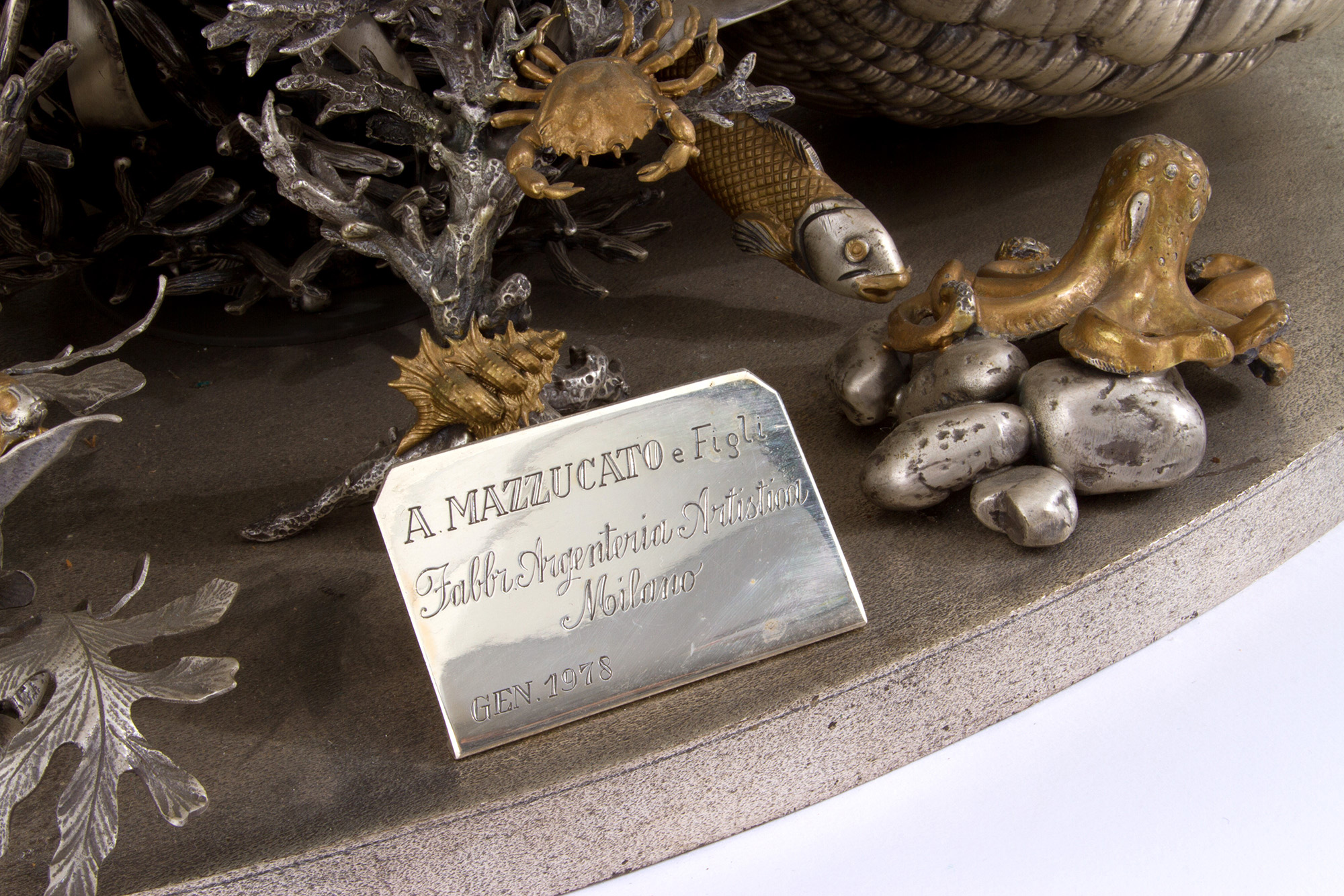 925 silver aquarium with golden parts. MAZZUCATO. With silversmith's tag. 1978. Weight of silver alone approx. 62 kg. 80x81x50 cm approx. Acquario in argento 925 con parti dorate. MAZZUCATO. Con targhetta dell'argentiere. Peso del solo argento 62 kg ca. 1978. 80x81x50 cm ca.