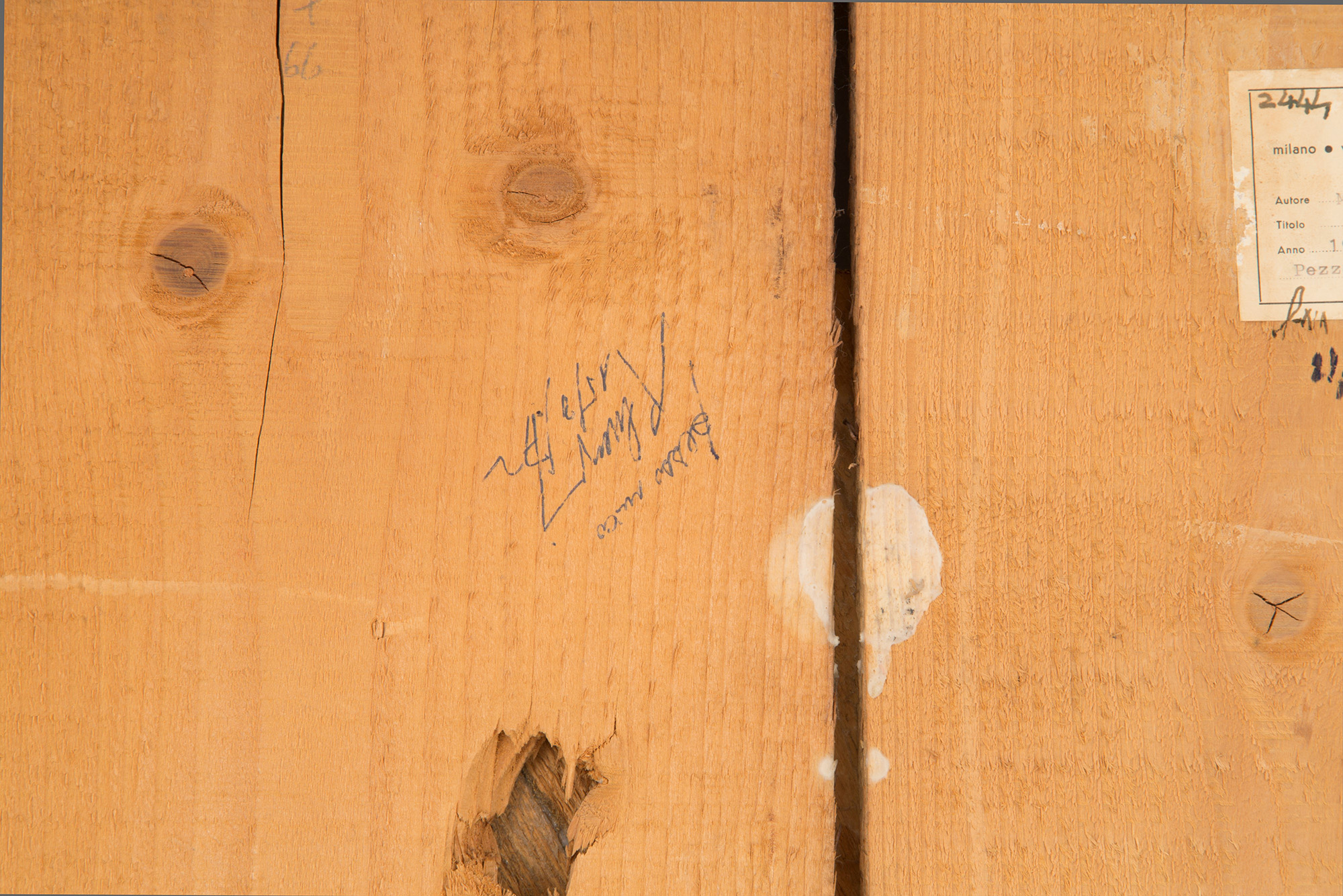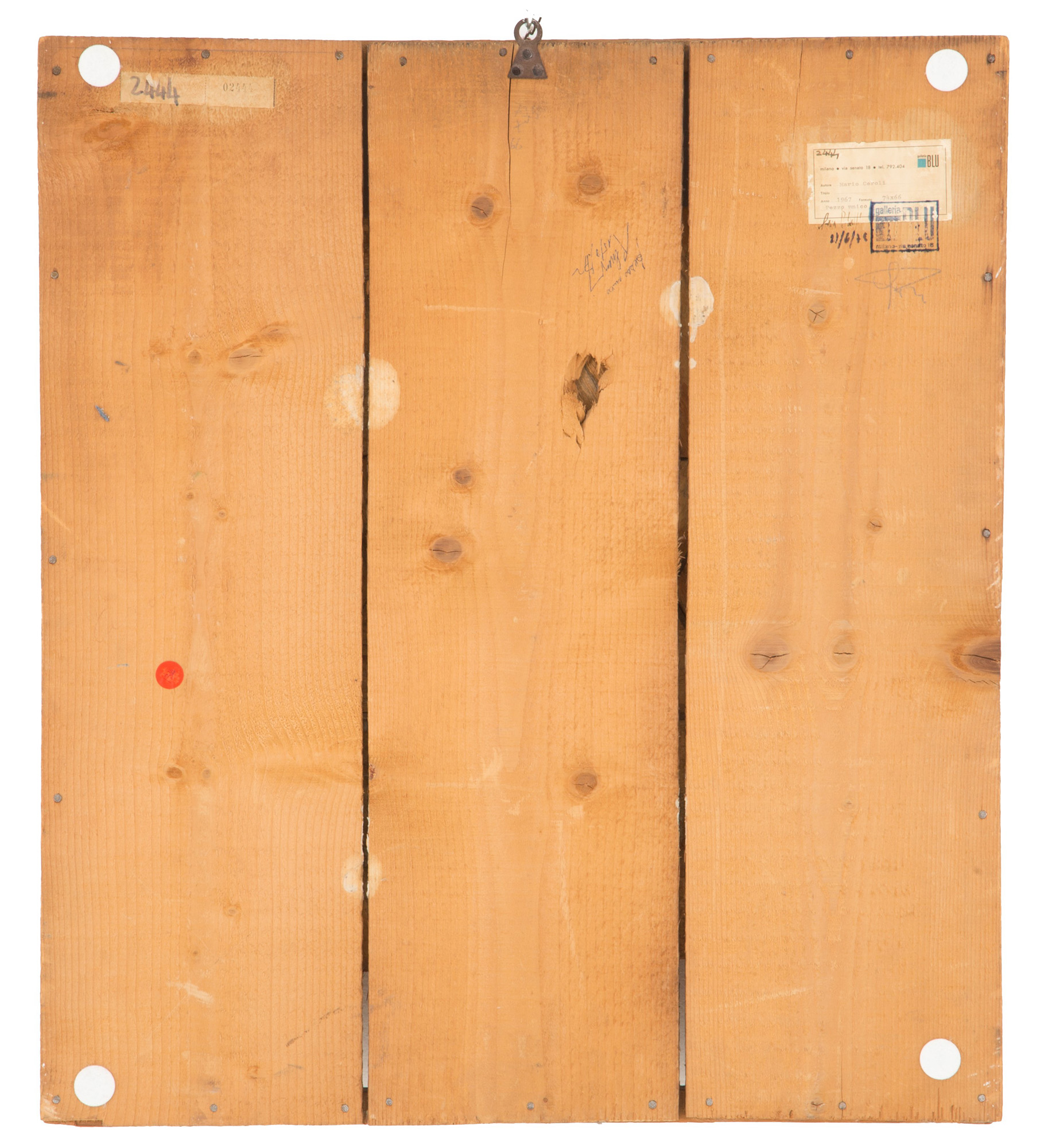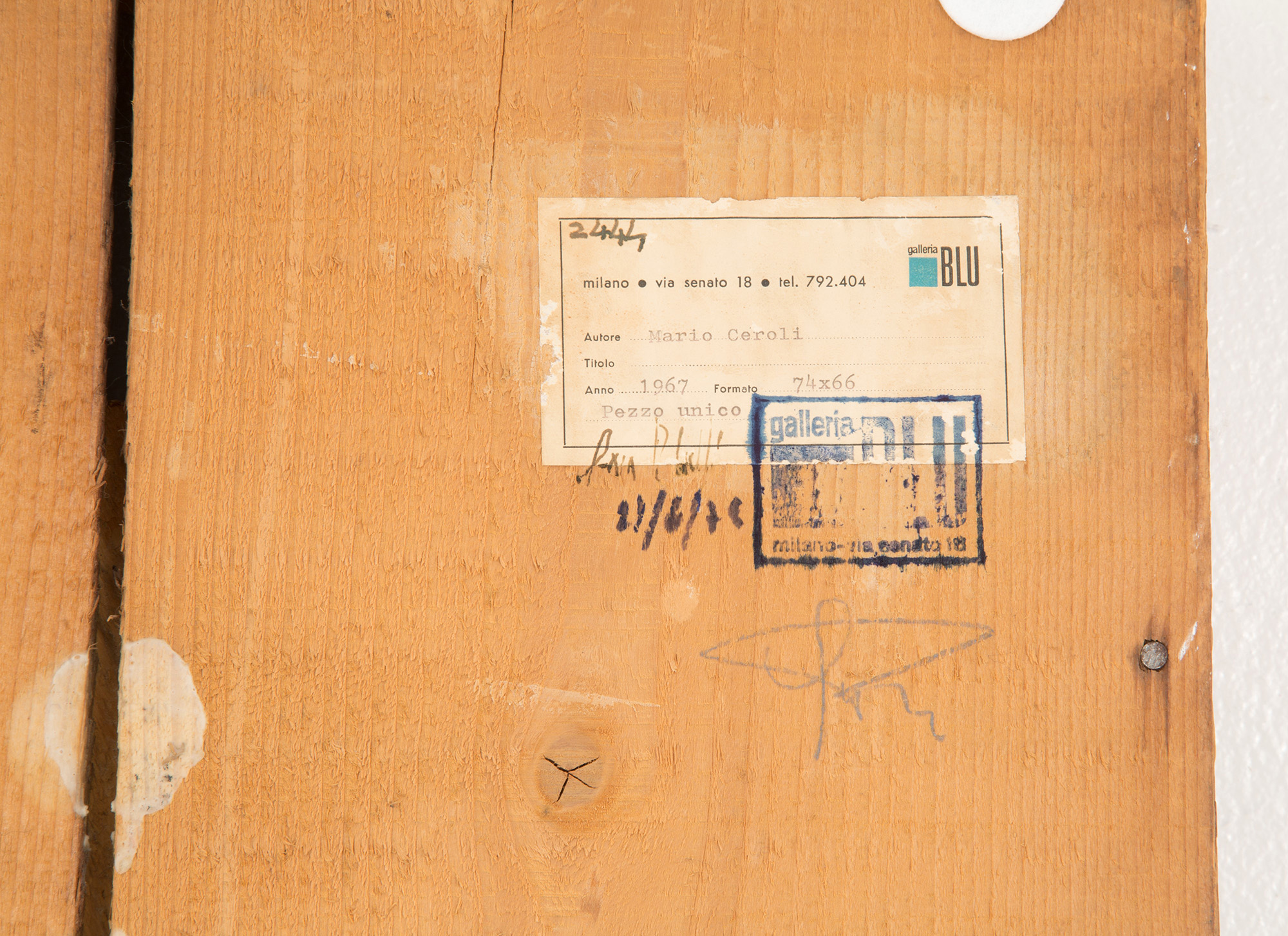 MARIO CEROLI (Castel Frentano 1938). Wooden painting-sculpture made up of geometric figures. Single piece. With Galleria Blu cartouche on the back. 1967. With certificates on photographic paper from the artist and the Galleria Blu. 74x66 cm approx. MARIO CEROLI (Castel Frentano 1938). Quadro-scultura in legno formato da figure geometriche. Pezzo unico. Con cartiglio della Galleria Blu sul retro. 1967. Con autentiche su carta fotografica sia dell'artista sia della Galleria Blu. 74x66 cm ca.