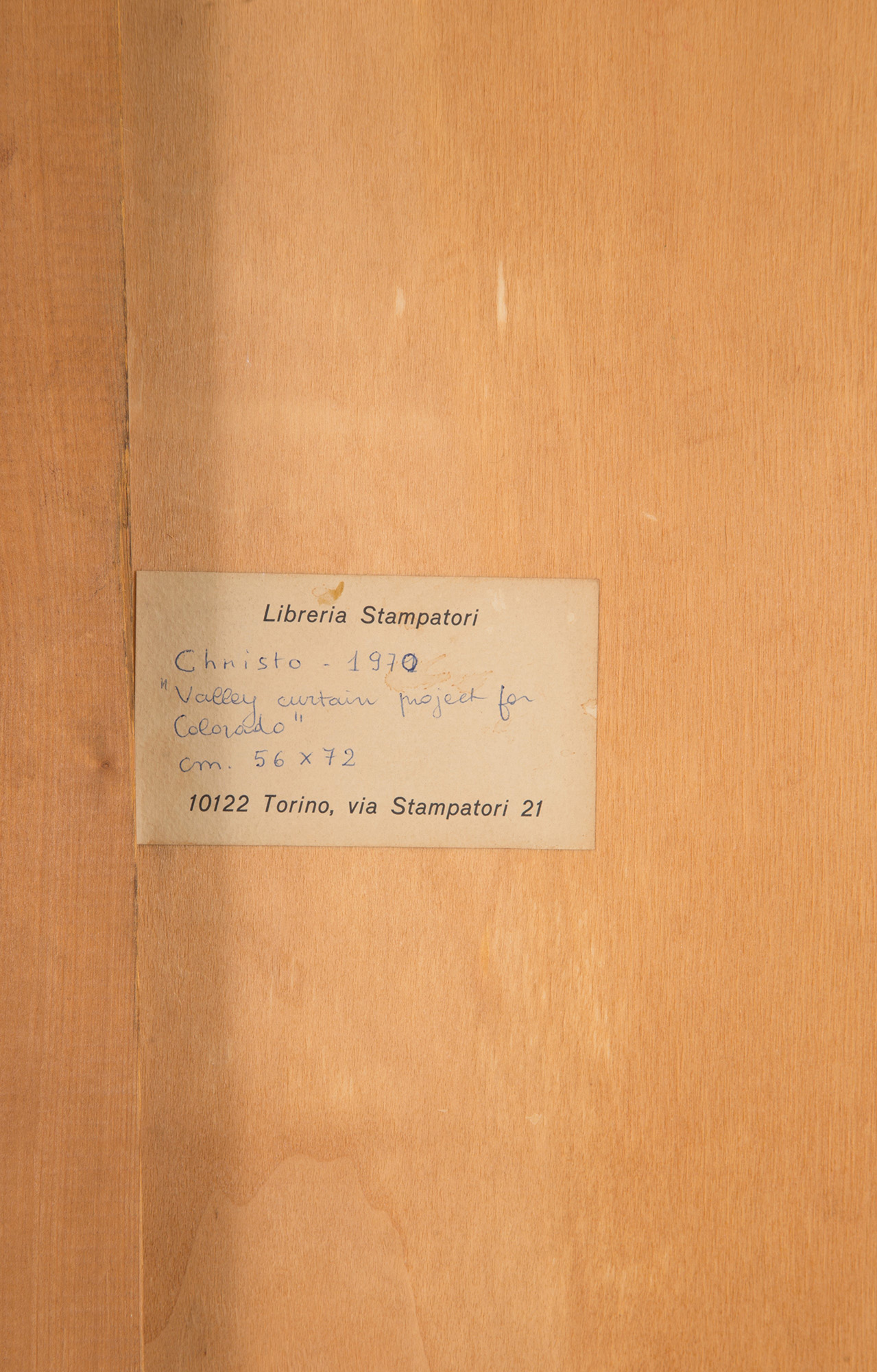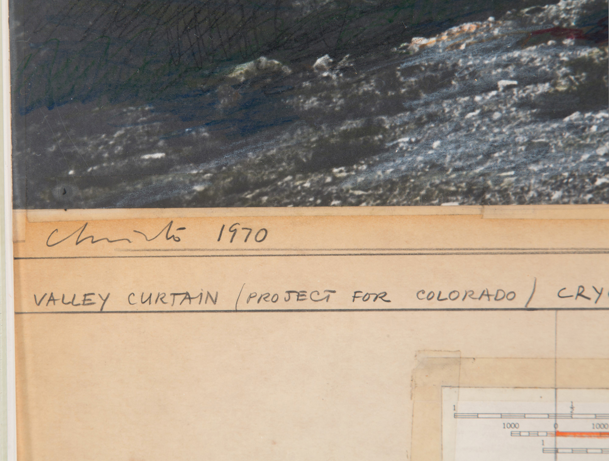 CHRISTO (Gabrovo 1935-New York 2020). Mixed media titled "VALLEY CURTAIN - PROJECT FOR COLORADO - CRYSTAL RIVER" in display case. Signed and dated 1970 in the center. 70x50 cm approx. CHRISTO (Gabrovo 1935-New York 2020). Tecnica mista in teca intitolata "VALLEY CURTAIN - PROJECT FOR COLORADO - CRYSTAL RIVER". Firmata e datata 1970 al centro. 70x50 cm ca.