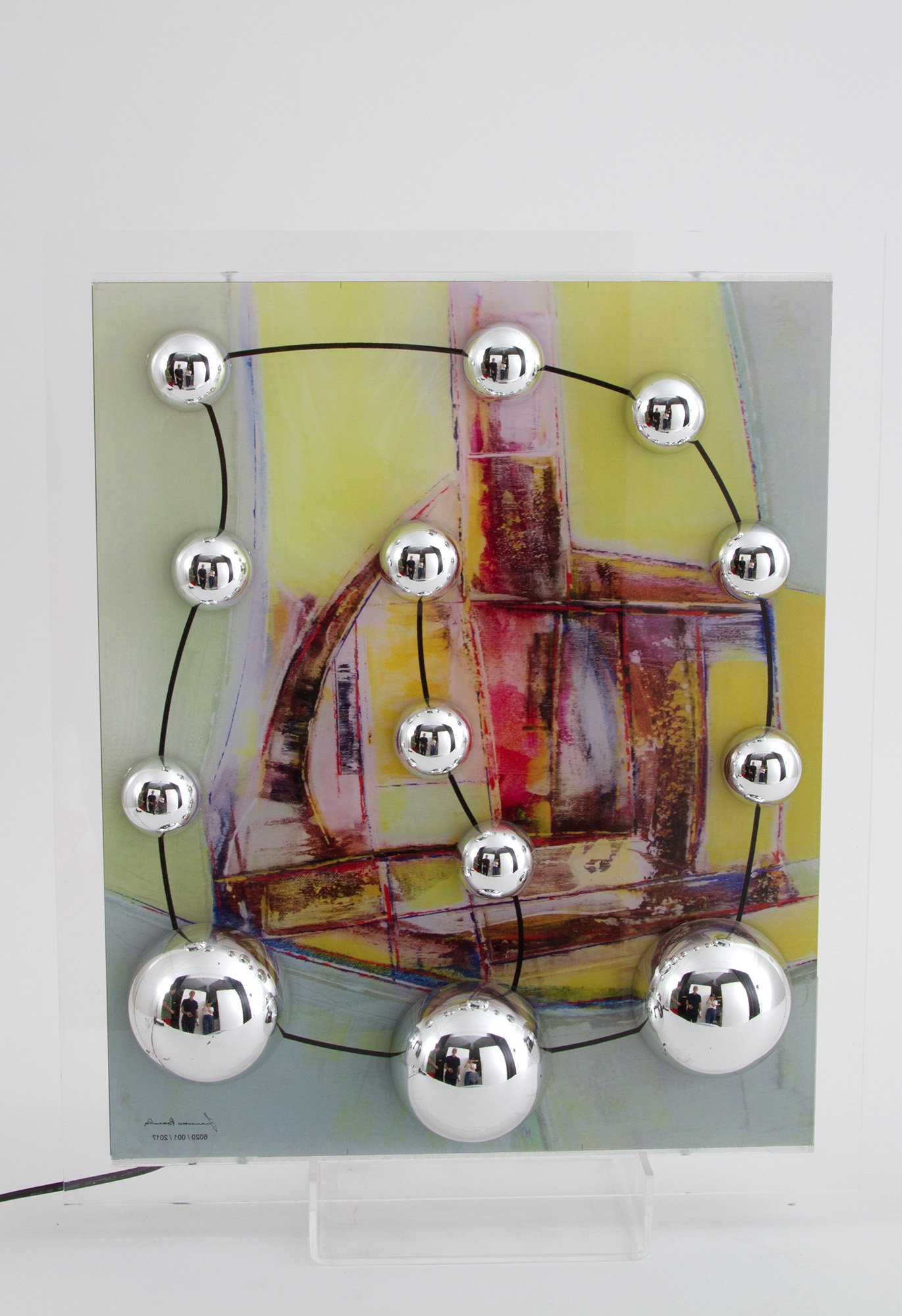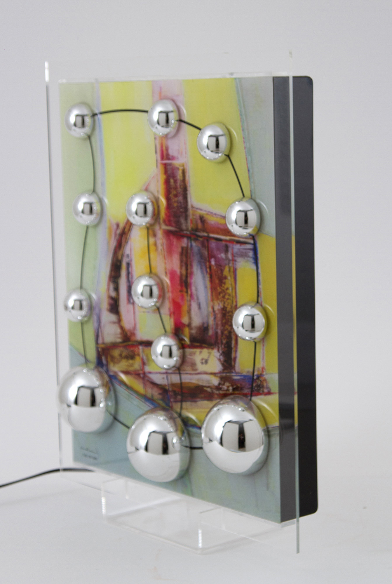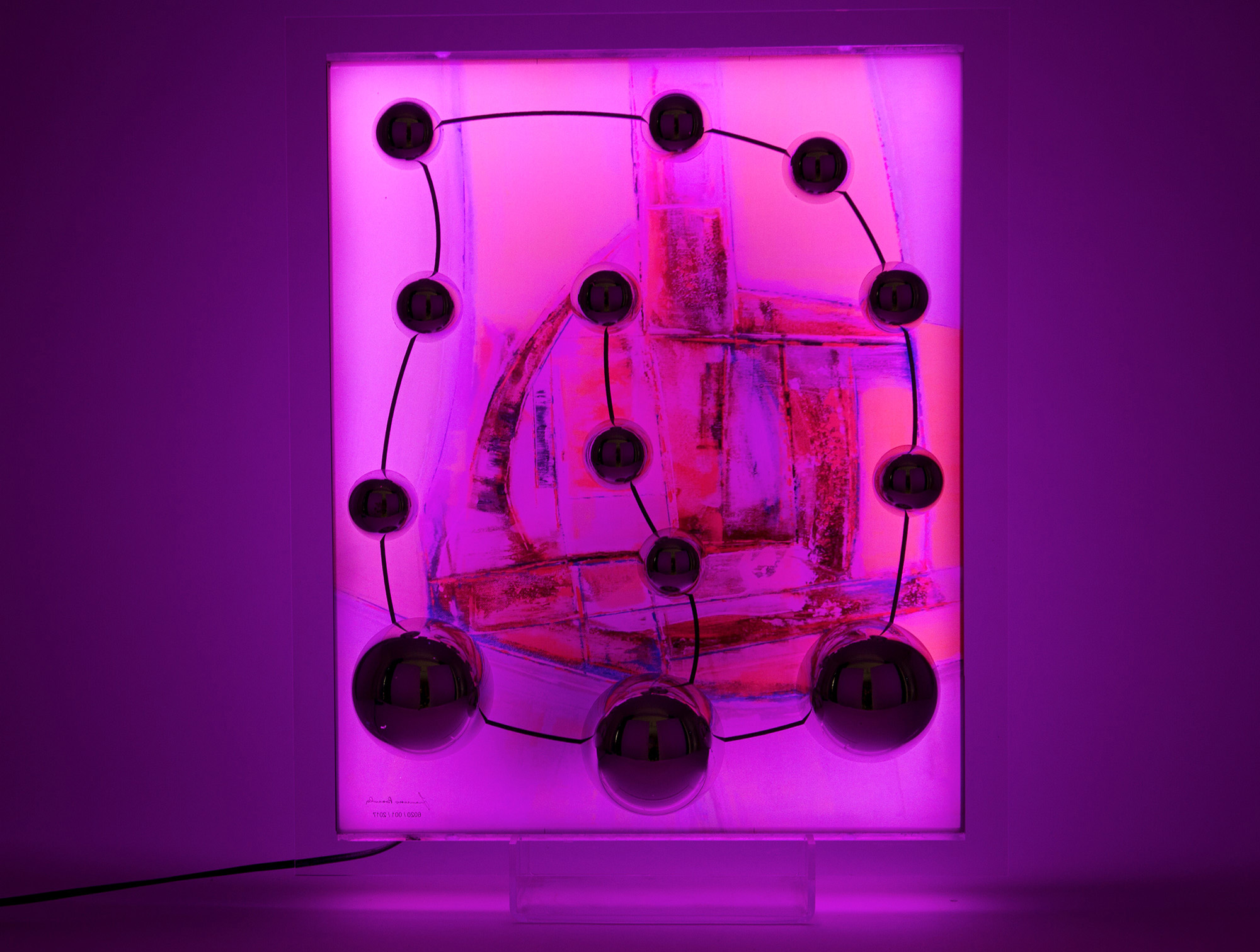 FRANCESCO BOCOLA. Luminous framework-panel with plastic spheres. Signed lower left. Numerated 8020/001/2017. Plexiglass base. With remote control. 63x50x7 cm approx. FRANCESCO BOCOLA. Quadro-pannello luminoso con sfere in materiale plastico. Firmato in basso a sinistra. Esemplare 8020/001/2017. Base in plexiglass. Corredato di telecomando. 63x50x7 cm ca.