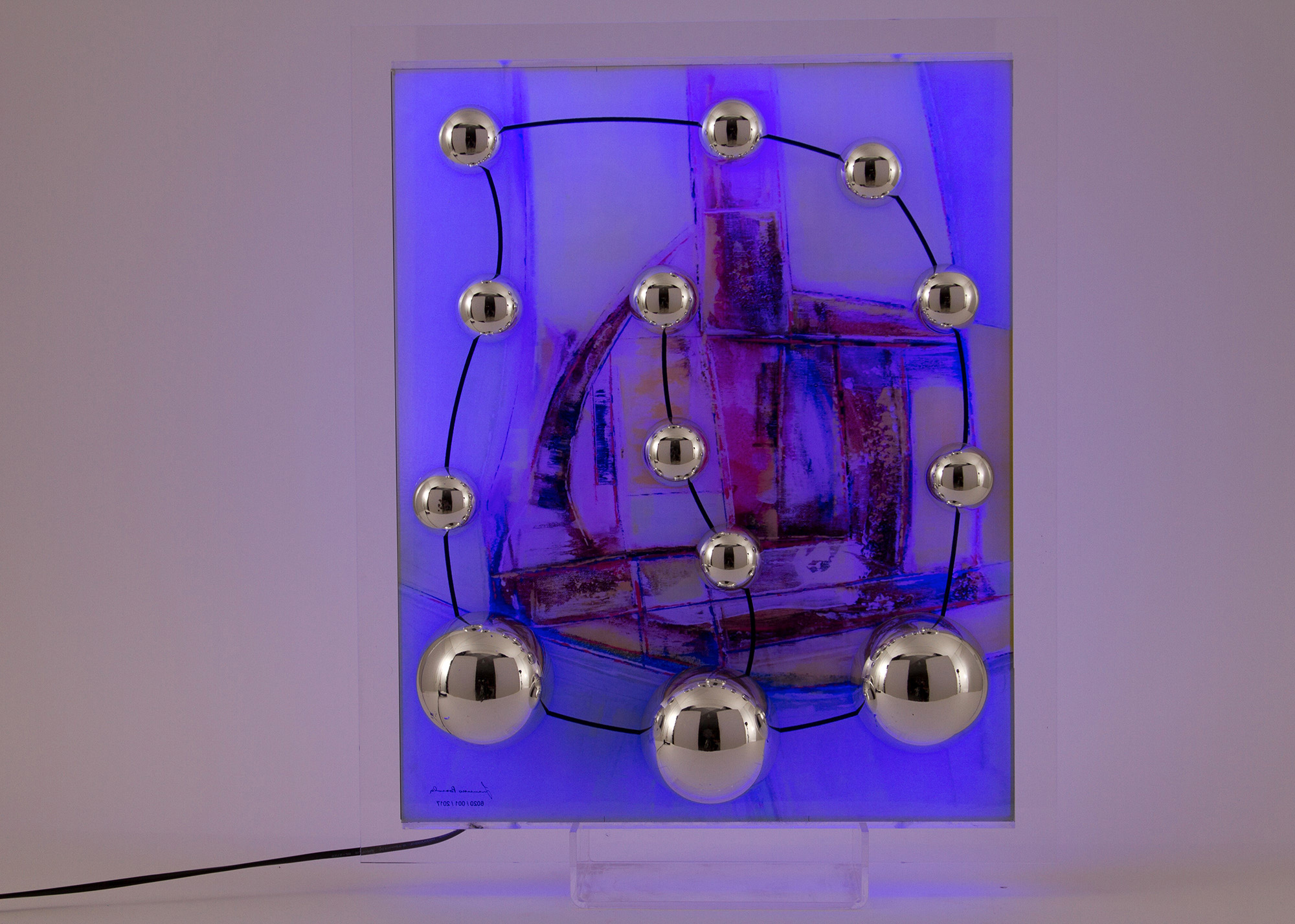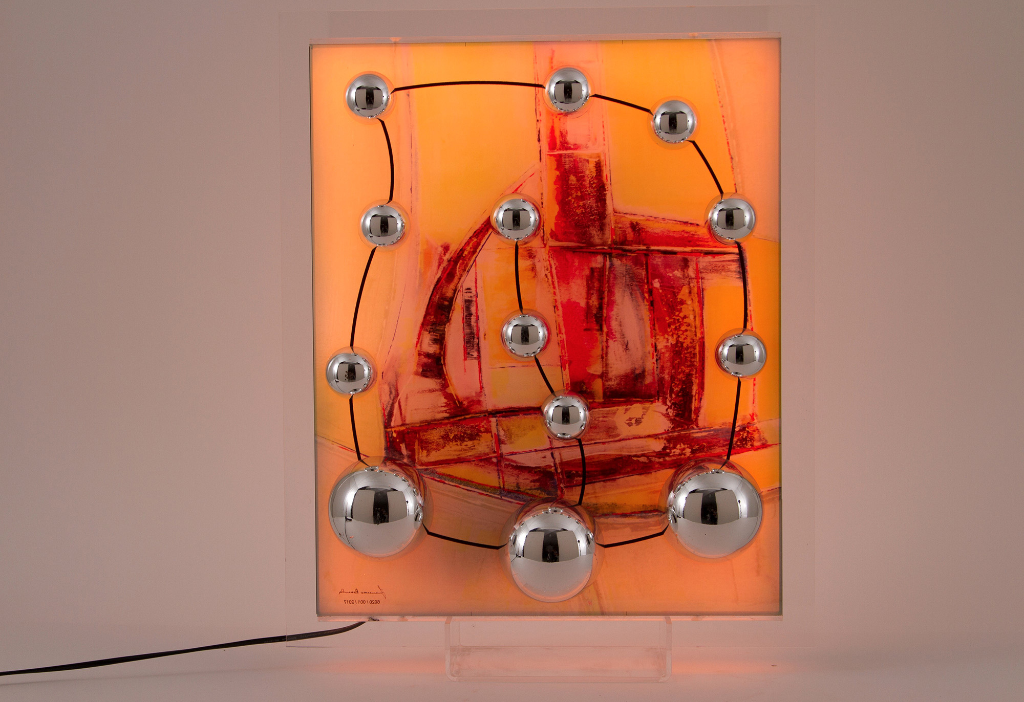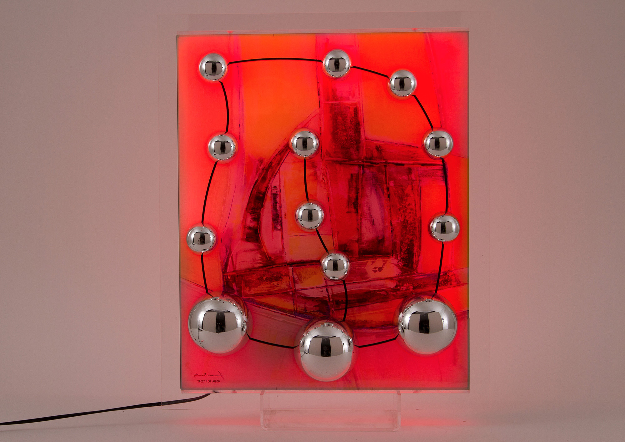 FRANCESCO BOCOLA. Luminous framework-panel with plastic spheres. Signed lower left. Numerated 8020/001/2017. Plexiglass base. With remote control. 63x50x7 cm approx. FRANCESCO BOCOLA. Quadro-pannello luminoso con sfere in materiale plastico. Firmato in basso a sinistra. Esemplare 8020/001/2017. Base in plexiglass. Corredato di telecomando. 63x50x7 cm ca.